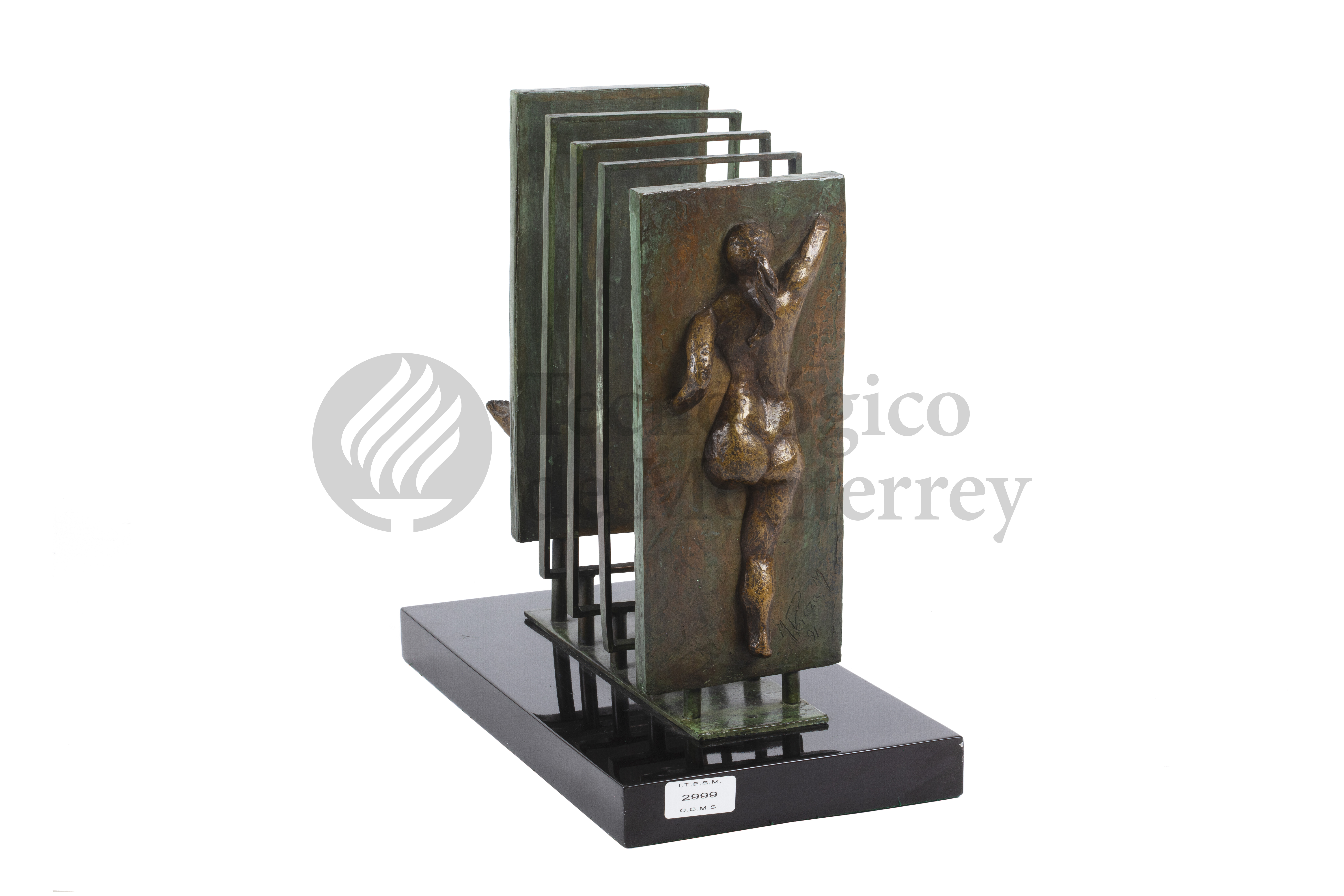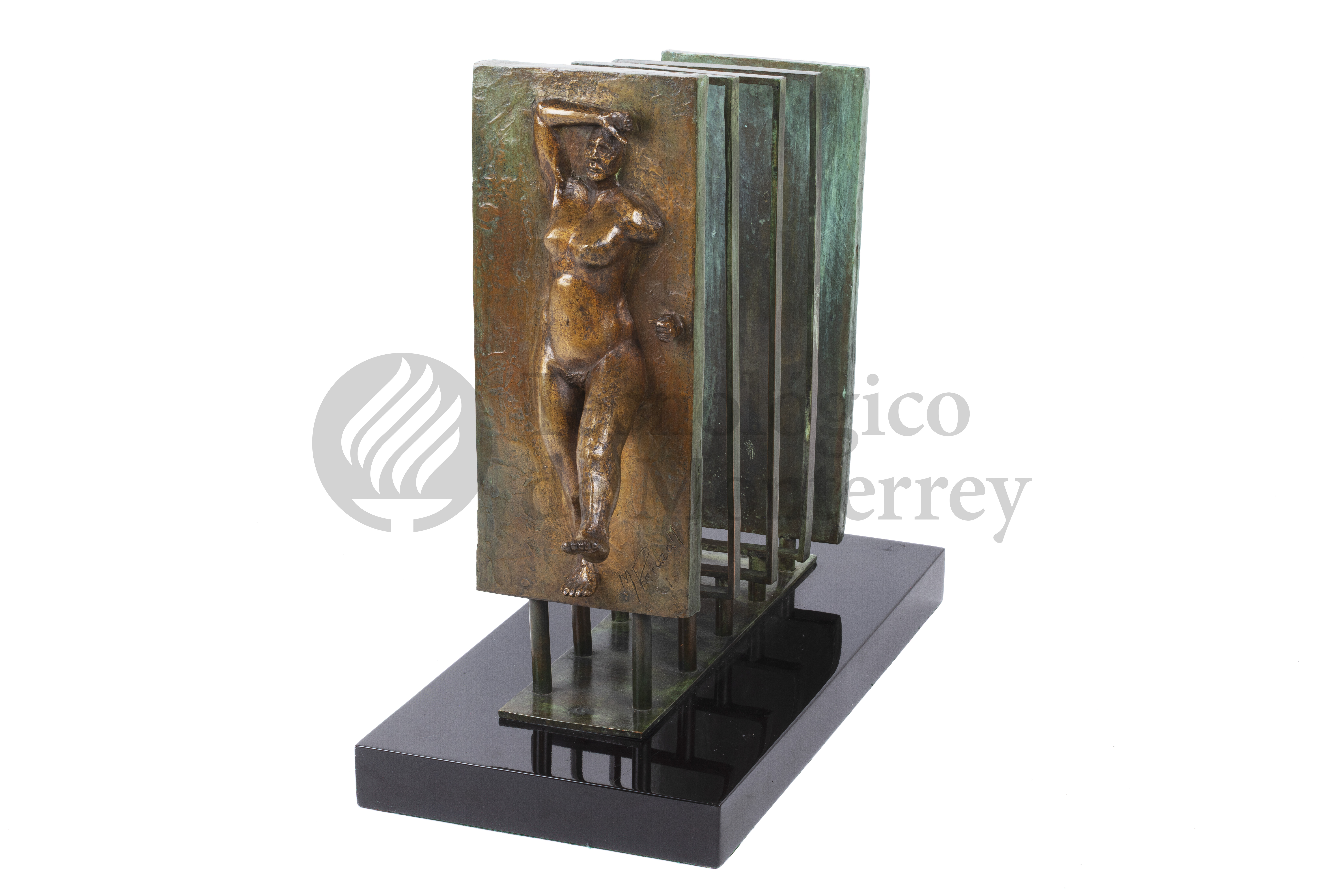 La escultura en bronce "Espejismos" de Miguel Peraza está construida a través de una estructura con cinco rectángulos y dos placas laterales. La escultura presenta una figura femenina en relieve que emergen una serie de planos de metal que parecen estar organizadas en capas. La figura está situada en la placa frontal, con las otras placas dispuestas paralelamente detrás de ella, creando una sensación de profundidad y dimensión. La base negra y pulida sostiene las placas y proporciona un contraste elegante con la textura del metal. El uso del bronce y el contraste entre las superficies planas y las texturas de los cuerpos humanos realzan la dualidad entre lo estático y lo fluido.