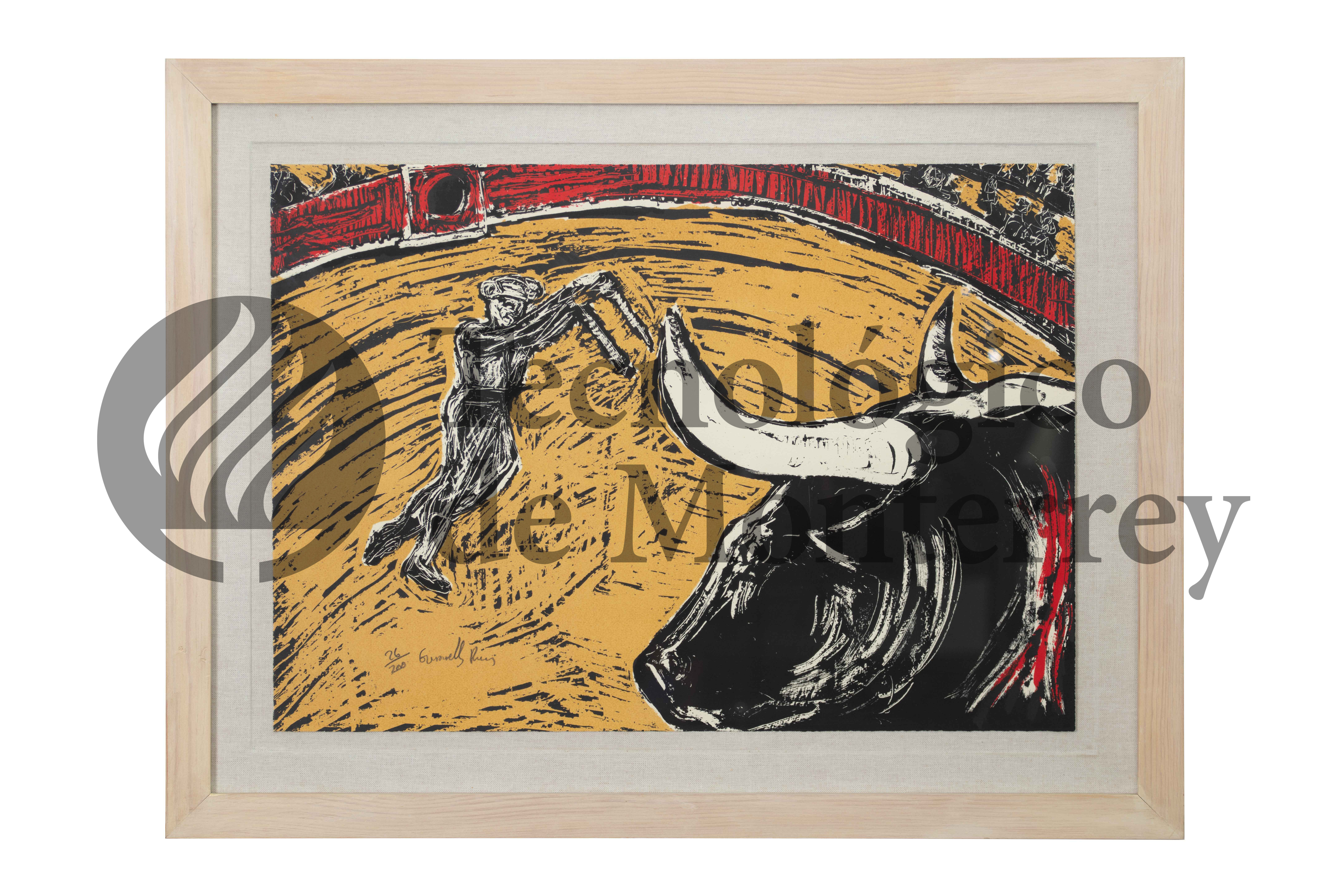 Obra gráfica de serigrafía a 3 tintas en cuya composición aparece un torero sosteniendo banderillas y un toro ensangrentado