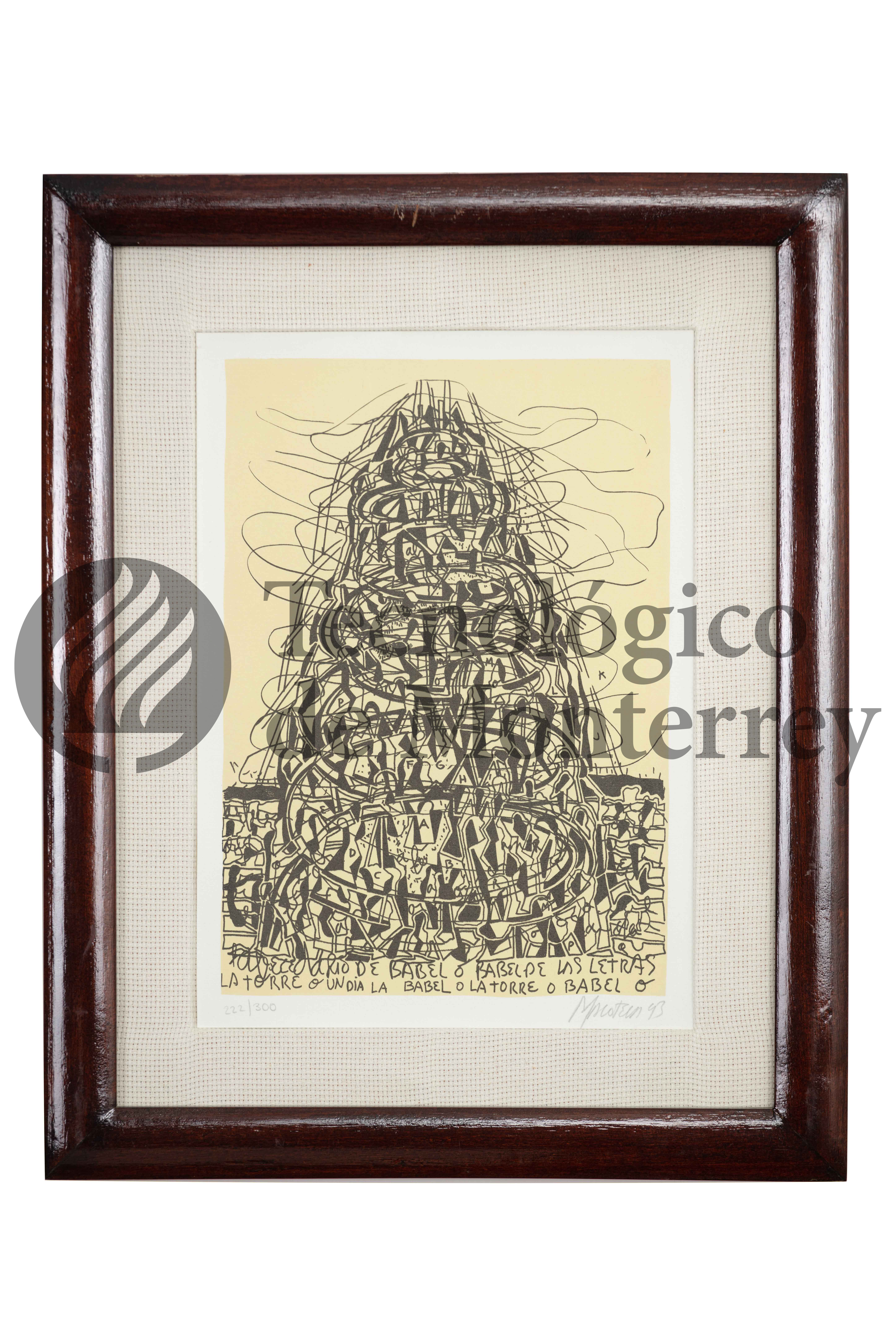 Obra gráfica de serigrafía abstracta a 2 tintas sobre papel, en cuya composición central se aprecia una torre con figuras serpenteadas en color negro sobre un fondo beige. En el lado inferior se lee la leyenda "[...] RIO DE BABEO O BABEL DE LAS LETRAS LA TORRE O UN DÍA LA BABEL O LA TORRE BABEL O"