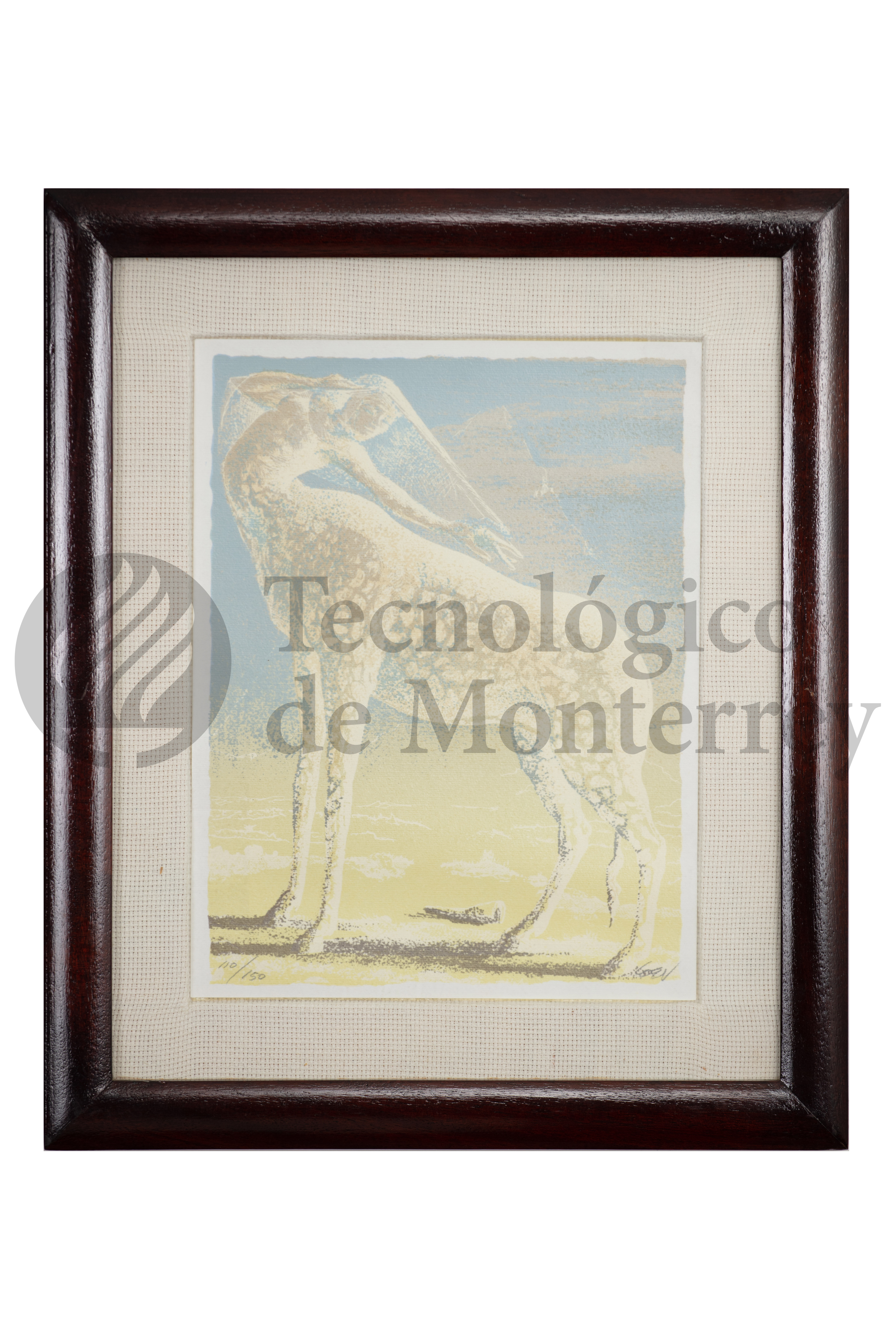 Obra gráfica de serigrafía surrealista sobre papel en tonos pastel que representa una figura antropomorfa