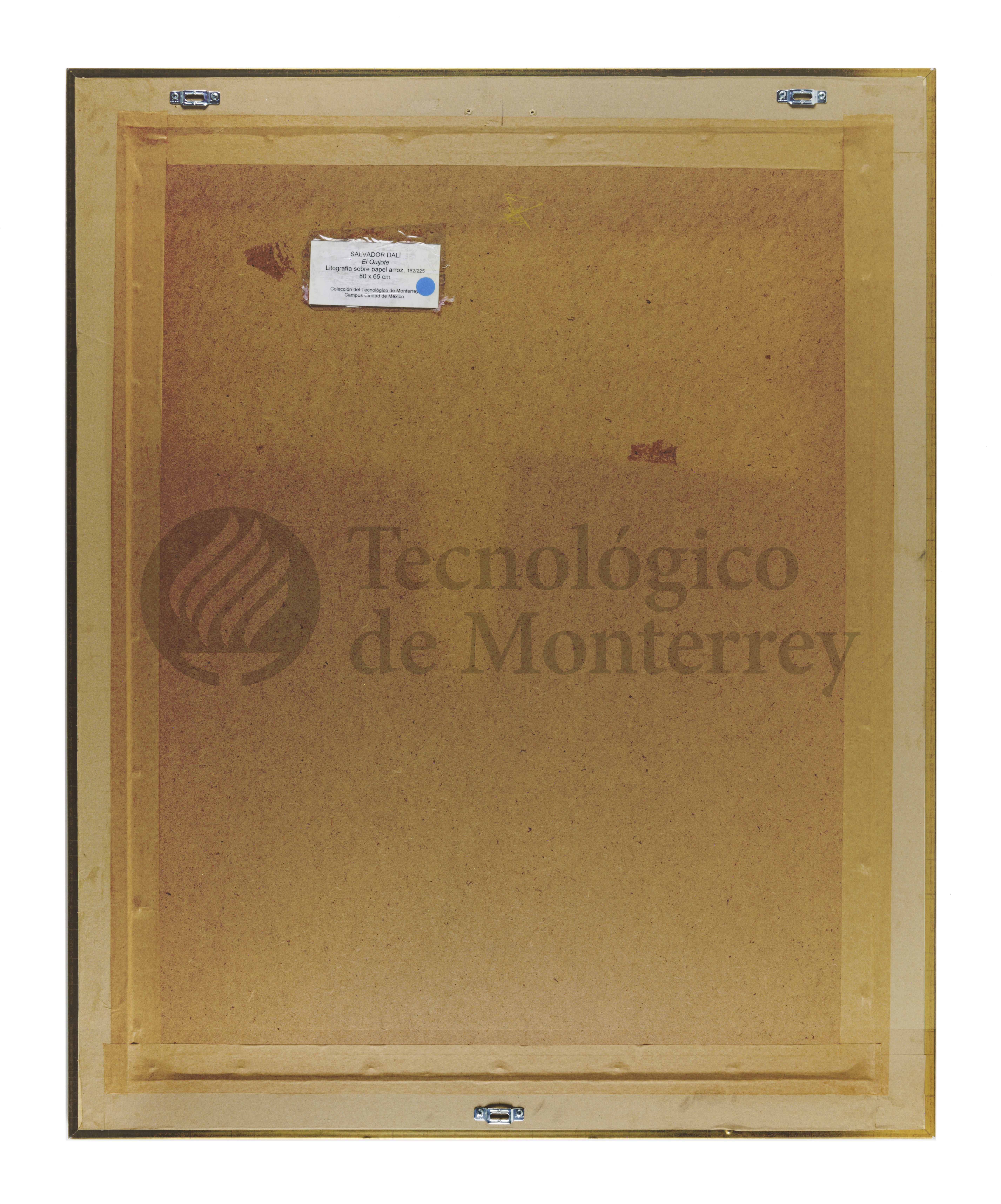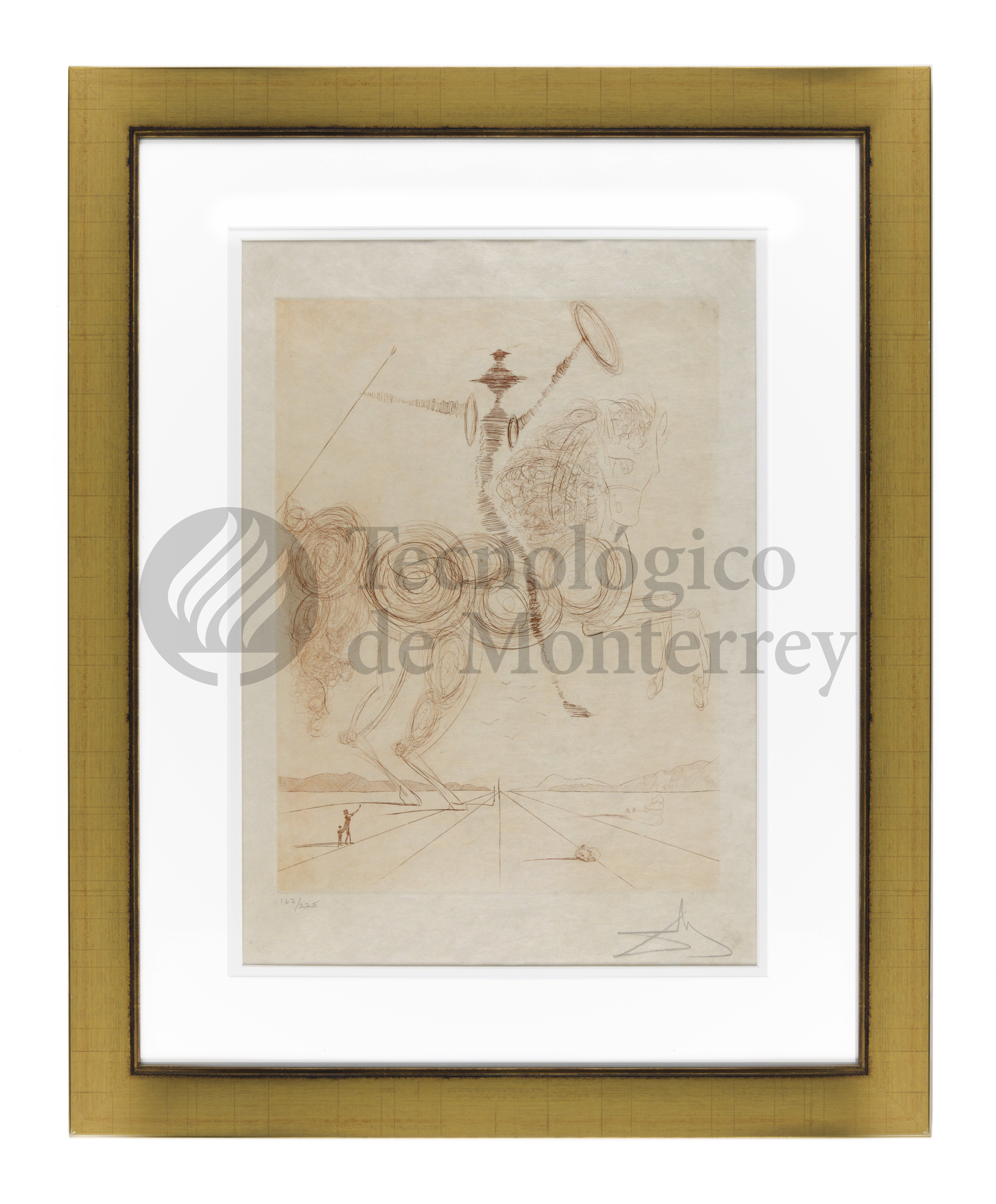 "El Quijote" de Salvador Dalí es una litografía sobre papel fibroso a una tinta. Es una representación surrealista y dinámica del personaje literario de Miguel de Cervantes Saavedra, en la cual se ve a Don Quijote montado a caballo, el cual resalta como figura central. En esta pieza, Dalí utiliza líneas finas y fluidas en tonos rojizos para capturar el movimiento de Don Quijote montado sobre su caballo en donde resalta con su lanza en mano. El espacio en el fondo sugiere un paisaje abierto, con líneas que convergen en el horizonte, creando una sensación de profundidad y perspectiva. Las líneas son curvas y fluidas, especialmente en la representación del caballo y su jinete. Esto crea una sensación de movimiento y dinamismo. En la parte inferior, hay figuras diminutas que contrastan con la monumentalidad del protagonista. La firma característica de Dalí se encuentra presente en la esquina inferior derecha.