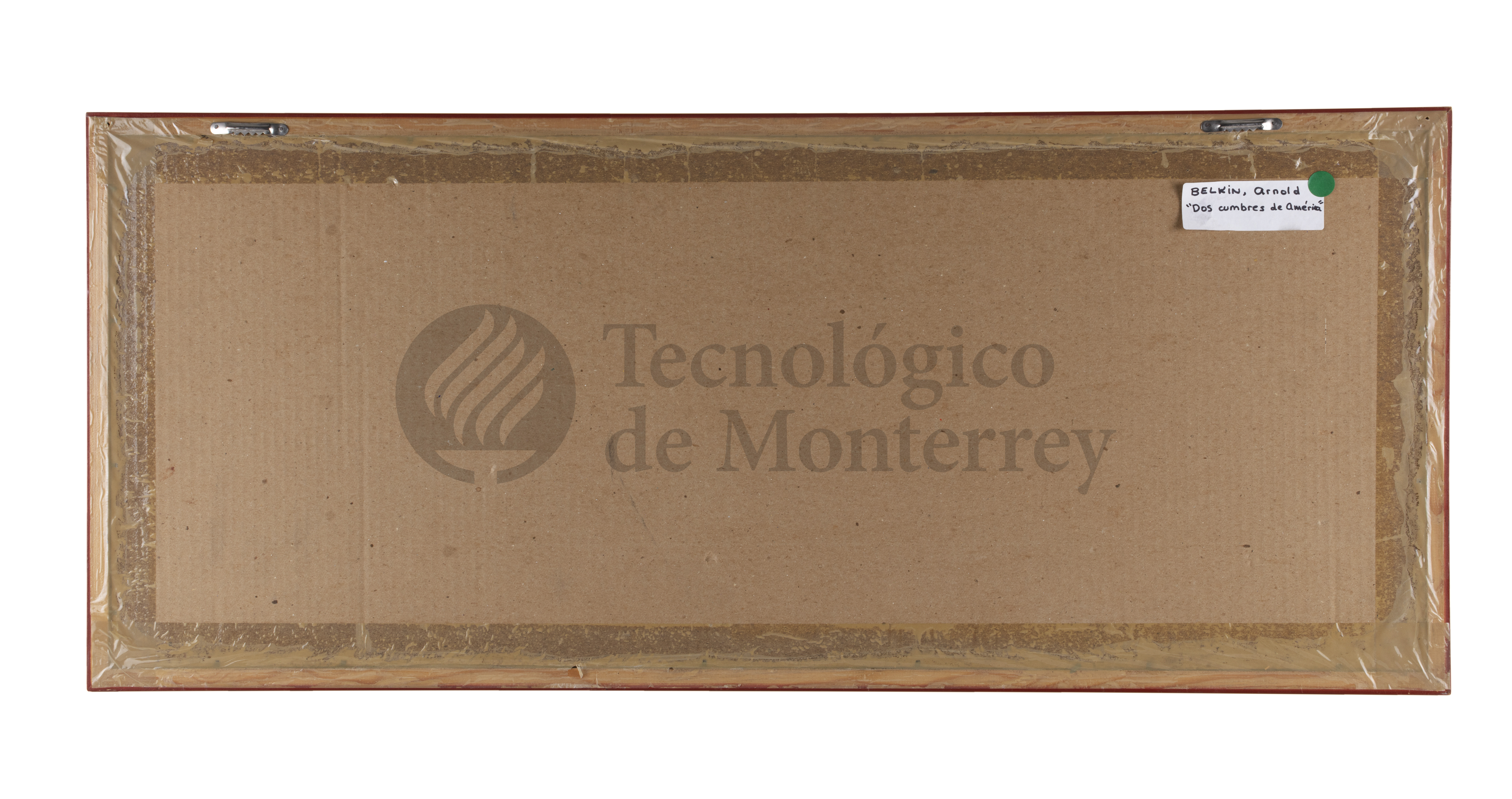 "Dos cumbres de América" de Arnold Belkin. Serigrafía que retrata en primer plano a Emiliano Zapata del lado izquierdo y a Augusto César Sandino del lado derecho. La pieza utiliza una paleta de colores vibrantes y contrastantes, predominando el azul, rojo y verde. Las figuras de ambos personajes están retratadas de manera frontal, con un estilo gráfico que recuerda a los retratos pop art, destacando sus rasgos faciales y sombreros característicos. El fondo presenta un degradado que va del verde al negro, aportando una profundidad visual que resalta aún más las figuras en primer plano. La obra hace uso de líneas claras y definidas, típicas del arte gráfico. Los detalles faciales están simplificados, pero son suficientes para captar las expresiones y características principales de los sujetos retratados. El marco rojo que rodea la obra complementa y resalta los colores internos, manteniendo la cohesión visual de la pieza. El título, "Dos cumbres de América", parece hacer referencia a la importancia histórica de estas figuras en el contexto de las luchas sociales y políticas de América Latina. La composición se centra únicamente en los rostros, lo que le da un carácter icónico a los personajes, destacando su influencia y simbolismo en la historia de la revolución. Los colores saturados y el estilo moderno contrastan con el tema histórico, creando una fusión entre lo contemporáneo y lo tradicional.