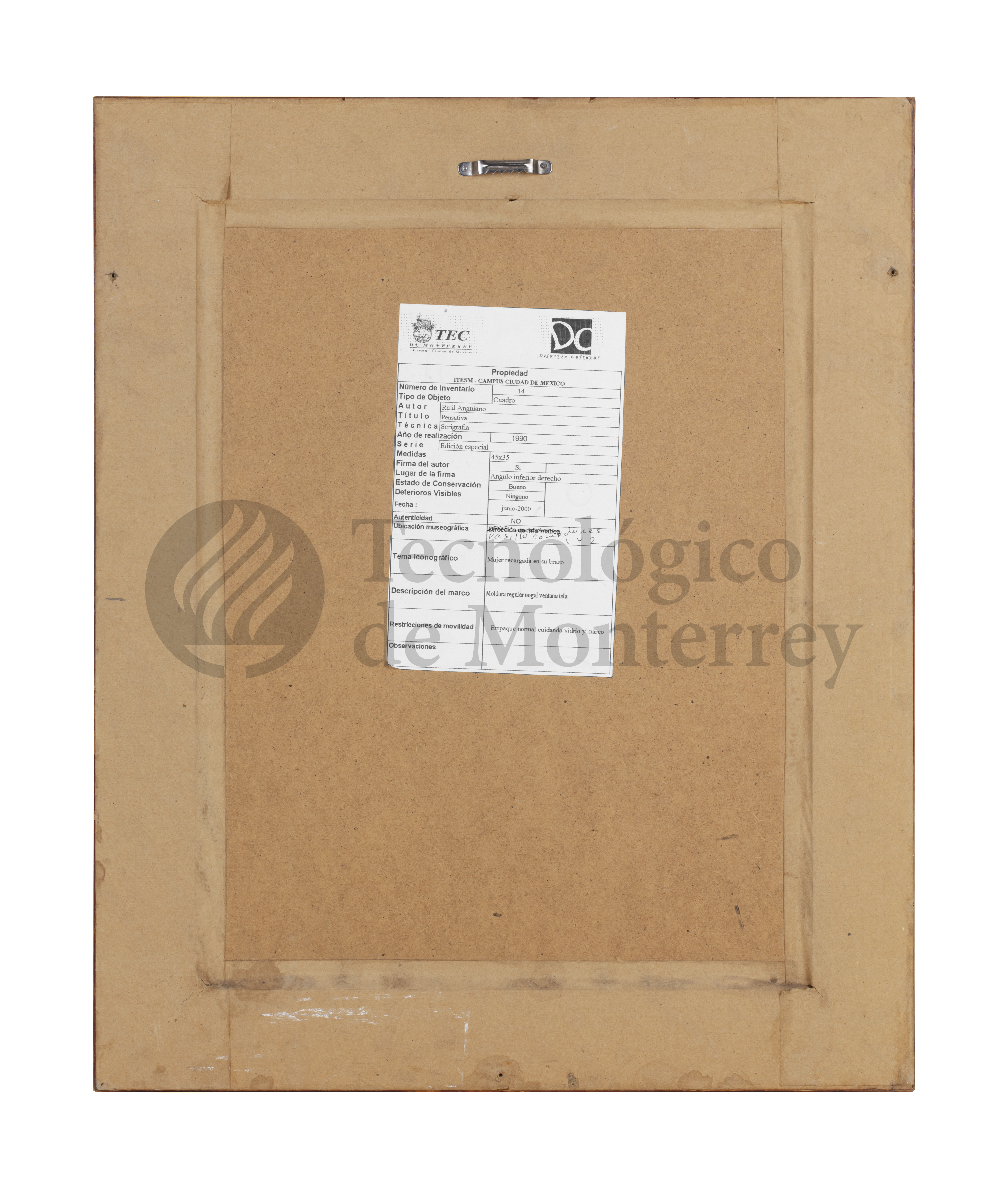 "Pensativa" de Raúl Anguiano es un obra en serigrafía sobre papel amarillo, retrata a una mujer en un estado de reflexión. Su cabeza está inclinada hacia un lado y su mano derecha reposa en su frente, sugiriendo un gesto de concentración o cansancio. Su expresión es tranquila, con los ojos cerrados o entreabiertos La técnica de líneas finas y sombreados suaves le otorga a la obra delicadeza, mientras que el color azul de su vestido añade un toque de serenidad a la composición. La simplicidad de los elementos y el enfoque en el rostro y la postura de la mujer resalta su estado emocional, capturando un momento de introspección. Algunos de los temas que el artista destacó son el México rural, el indigenismo, las fiestas populares, las tradiciones y la religiosidad.