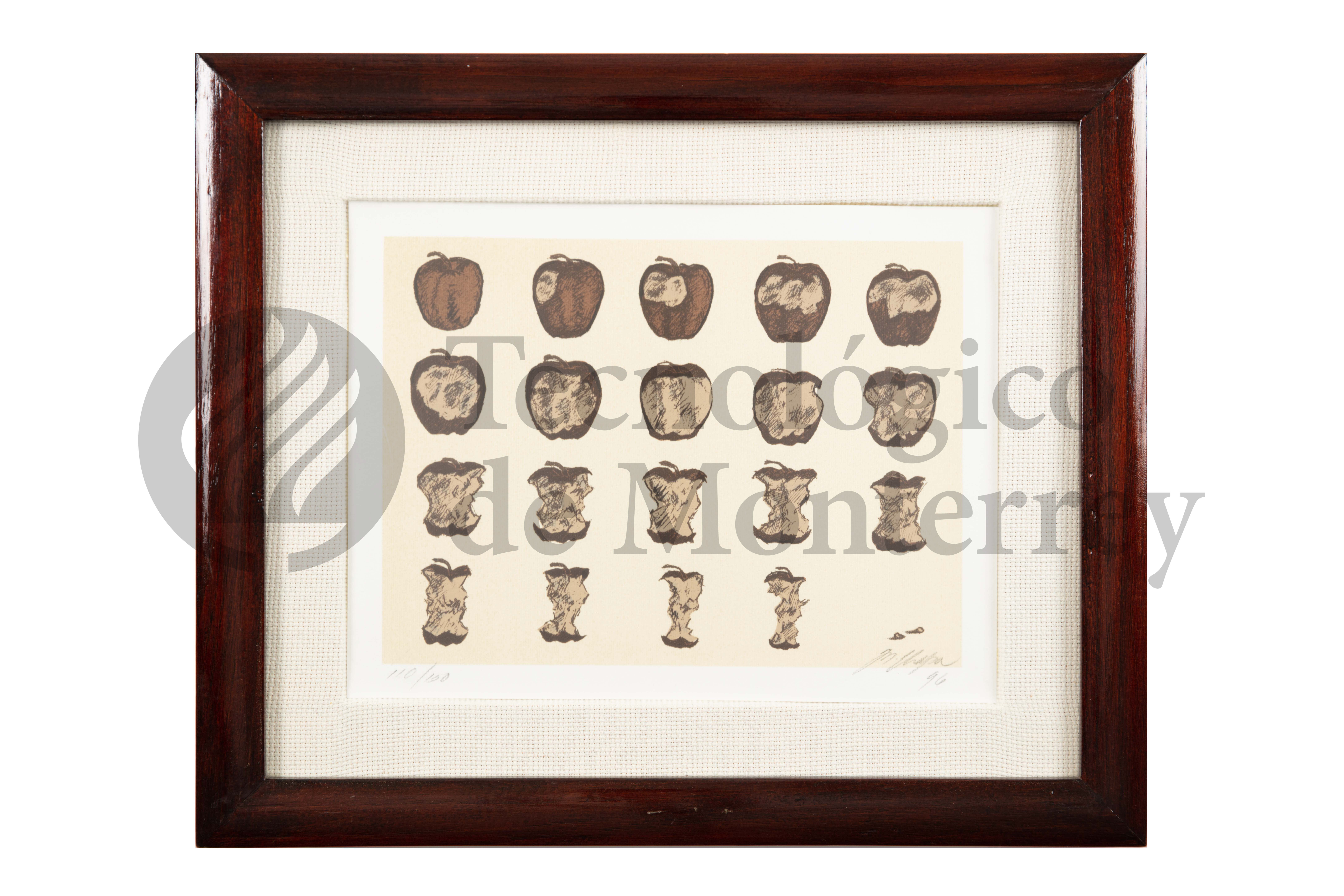 Obra gráfica de bodegón en serigrafía a 2 tintas que representa la secuencia de una manzana al ser comida
