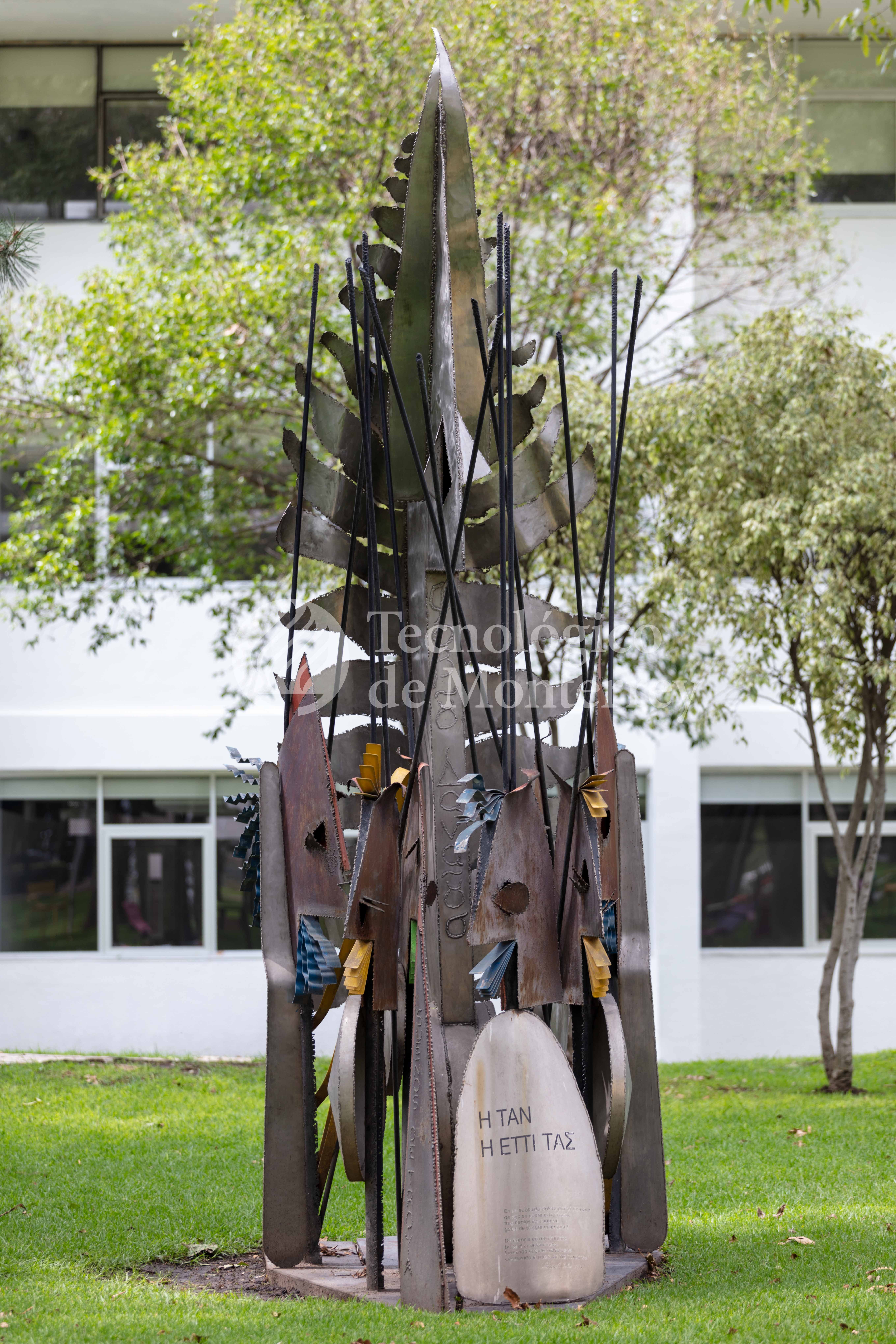 Escultura de hierro y acero lacado, sobre una base de concreto de disposición vertical en la que se aprecian cascos y lanzas alrededor de un pilar con formas curveadas.