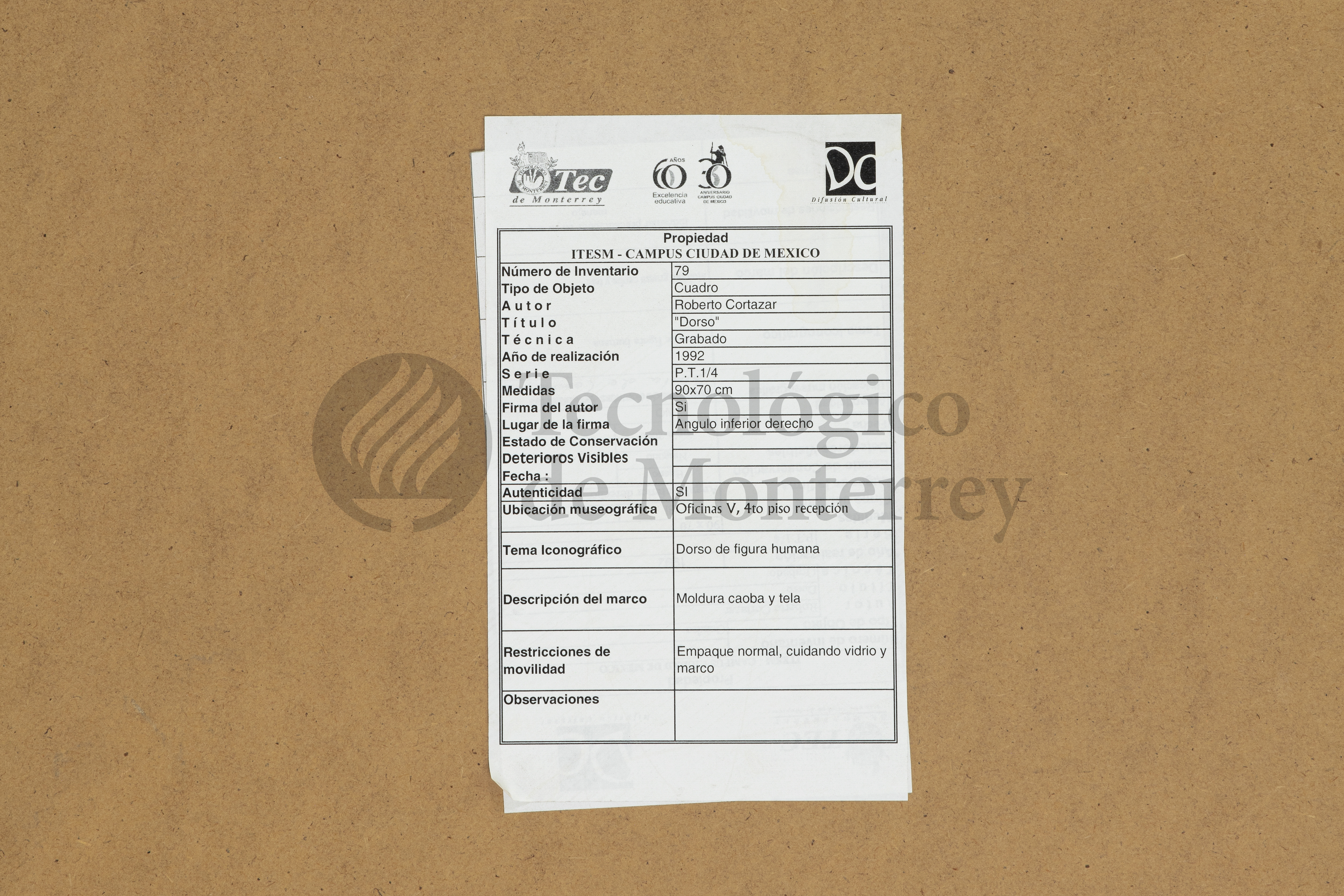 "Dorso" de Roberto Cortázar. Grabado en blanco y negro que representa una figura femenina vista de perfil, centrada en su espalda y el gesto de su mano. La composición utiliza el contraste entre una sección detallada y texturizada a la izquierda, y un fondo geométrico y oscuro a la derecha, que enmarca a la figura y resalta la presencia del rostro de la mujer se encuentra de perfil. El trazo suave y preciso del dibujo, combinado con el uso del claroscuro, le da profundidad y volumen al cuerpo, destacando la forma humana. La postura de la mano, relajada pero elegante, añade un toque de gracia a la imagen, sugiriendo una narrativa implícita sobre la identidad y la reflexión.