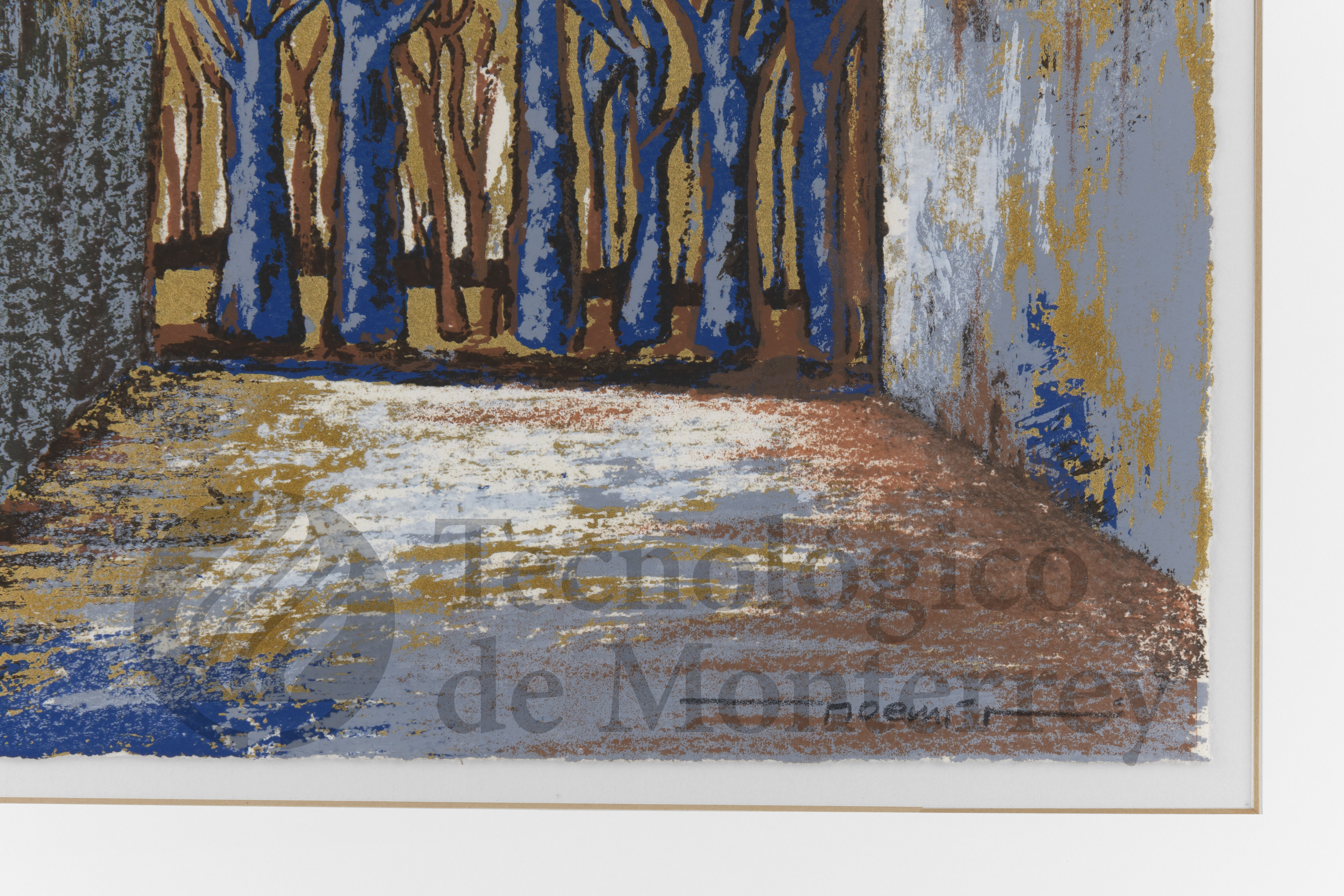 La serigrafía a color de Noemí Ramírez, que forma parte de "Carpeta 30 aniversario CEM, 2006", presenta una escena de un bosque que se mezcla con un espacio arquitectónico, creando un ambiente surrealista. Los árboles, con sus troncos delgados y ramas desnudas, se alinean, donde la luz y las sombras juegan un papel crucial en la atmósfera de la pieza. La paleta de colores está dominada por tonos fríos como el azul, gris y ocre, con matices de colores tierra que aportan calidez, generando un contraste. El uso de la perspectiva invita al espectador a adentrarse en el espacio, que parece extenderse en una transición entre lo natural y lo construido. Obra numerada 100/150.