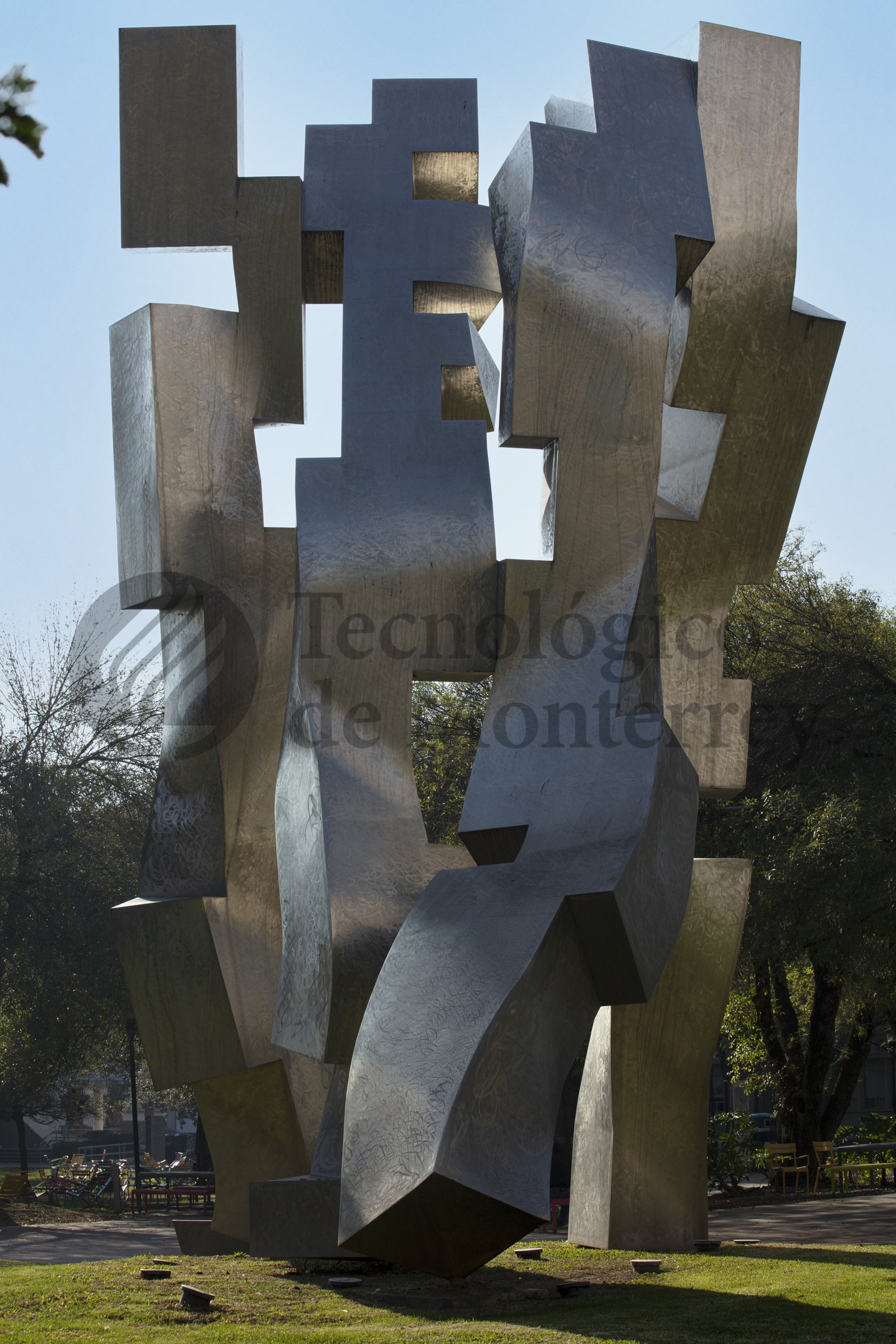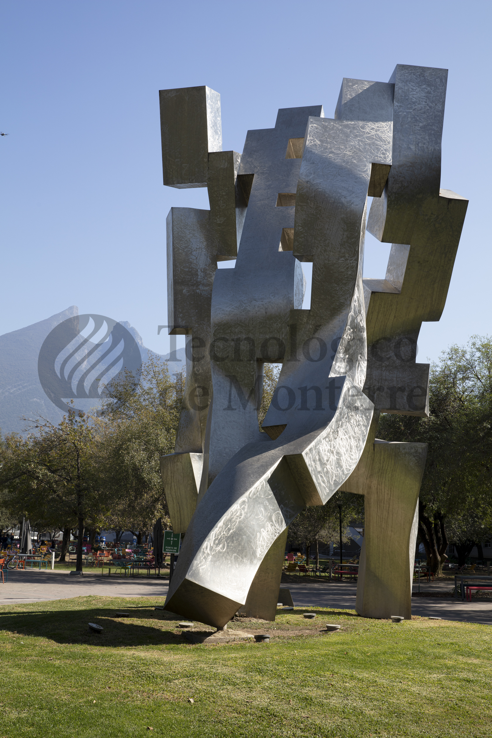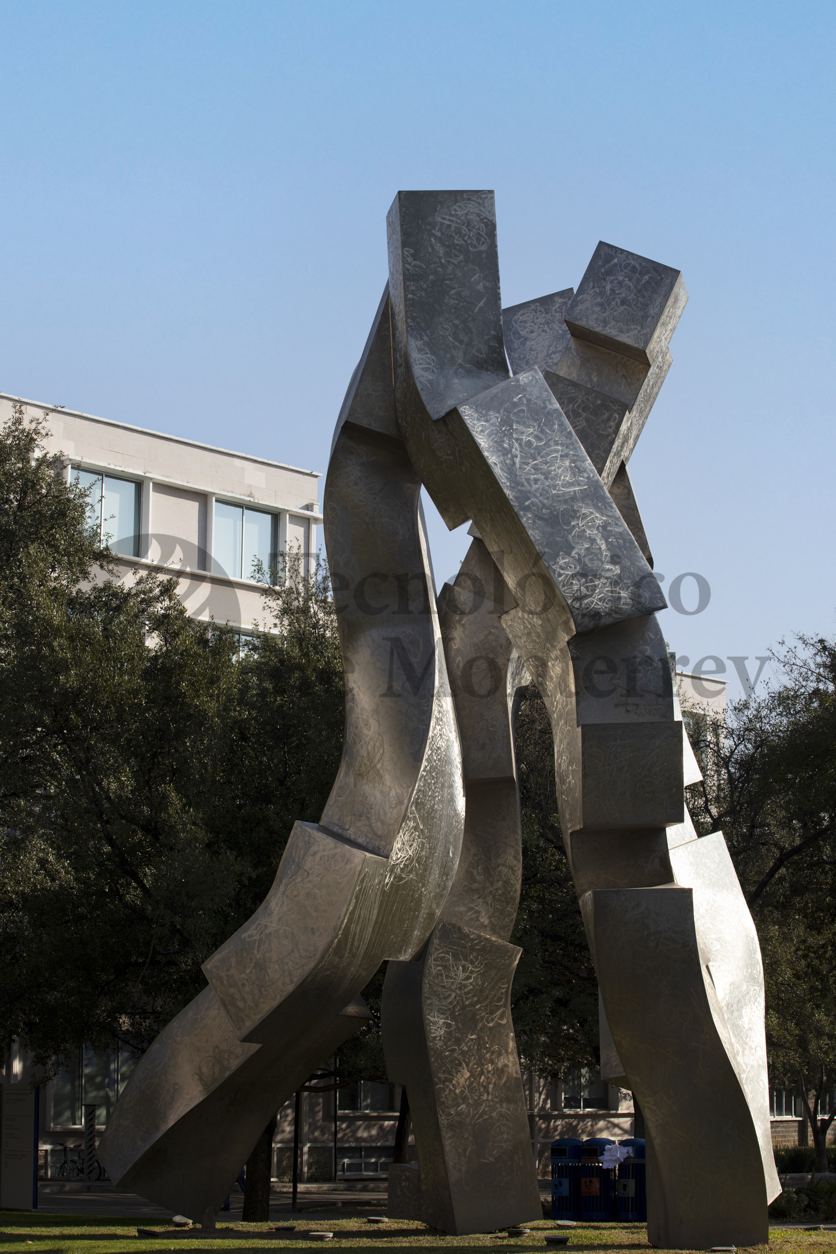 "Canto a la luz" de Jorge Elizondo, escultura geométrica de ácero inoxidable de 9 metros de altura, en disposición vertical emplazada en el jardín del ITESM, dedicada al empresario Lorenzo Zambrano. El artista juega con la luz y las sombras, logrando un impacto visual intrigante desde cualquier ángulo. Las formas abstractas, talladas con líneas limpias y superficies pulidas, parecen elevarse hacia el cielo, evocando dinamismo y movimiento. Esta obra está compuesta por bloques entrelazados que generan una sensación de equilibrio a pesar de su robustez. Al reflejar el sol, la escultura simboliza una búsqueda constante de iluminación y conocimiento, características claves de la innovación y el progreso.