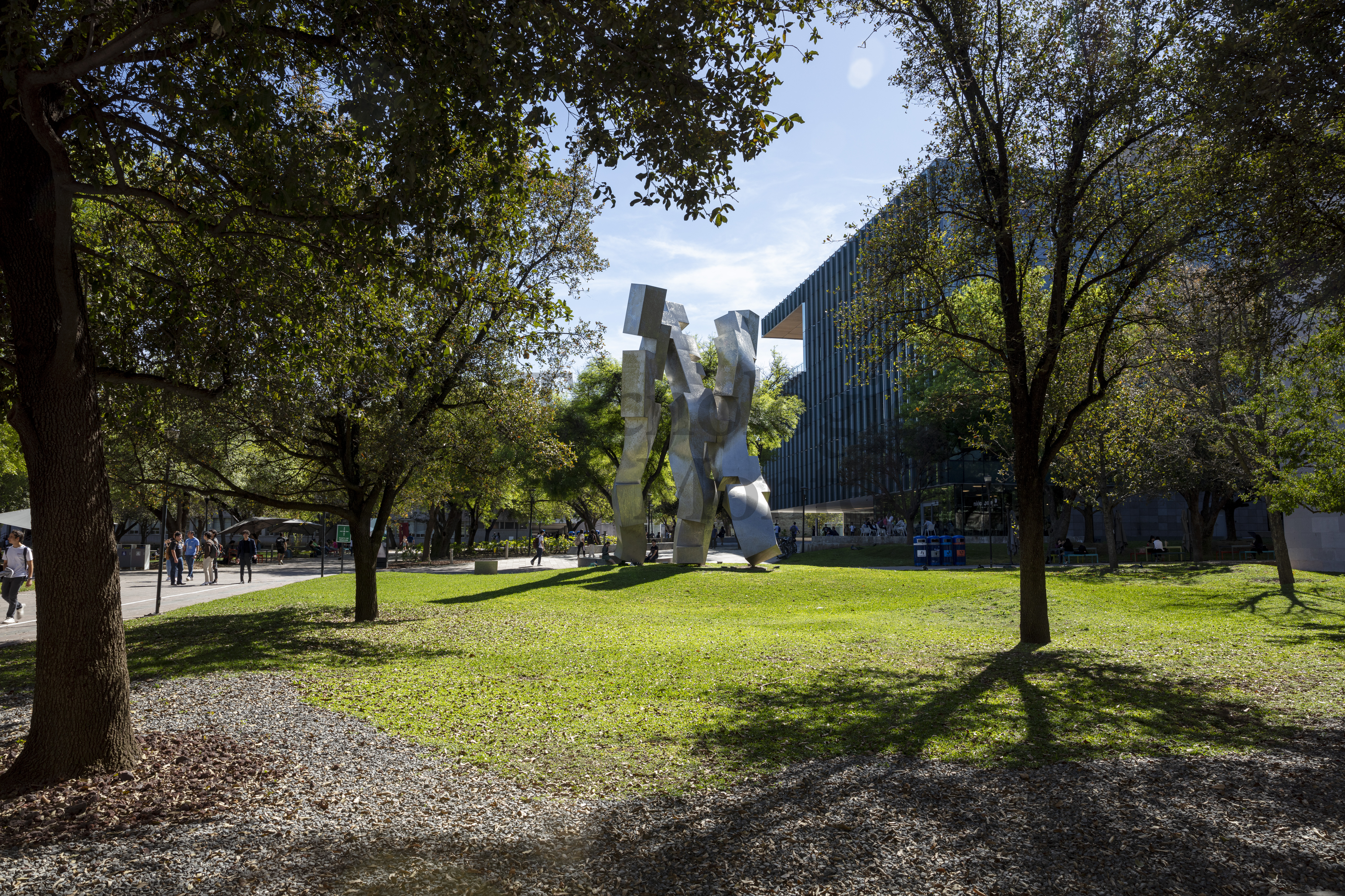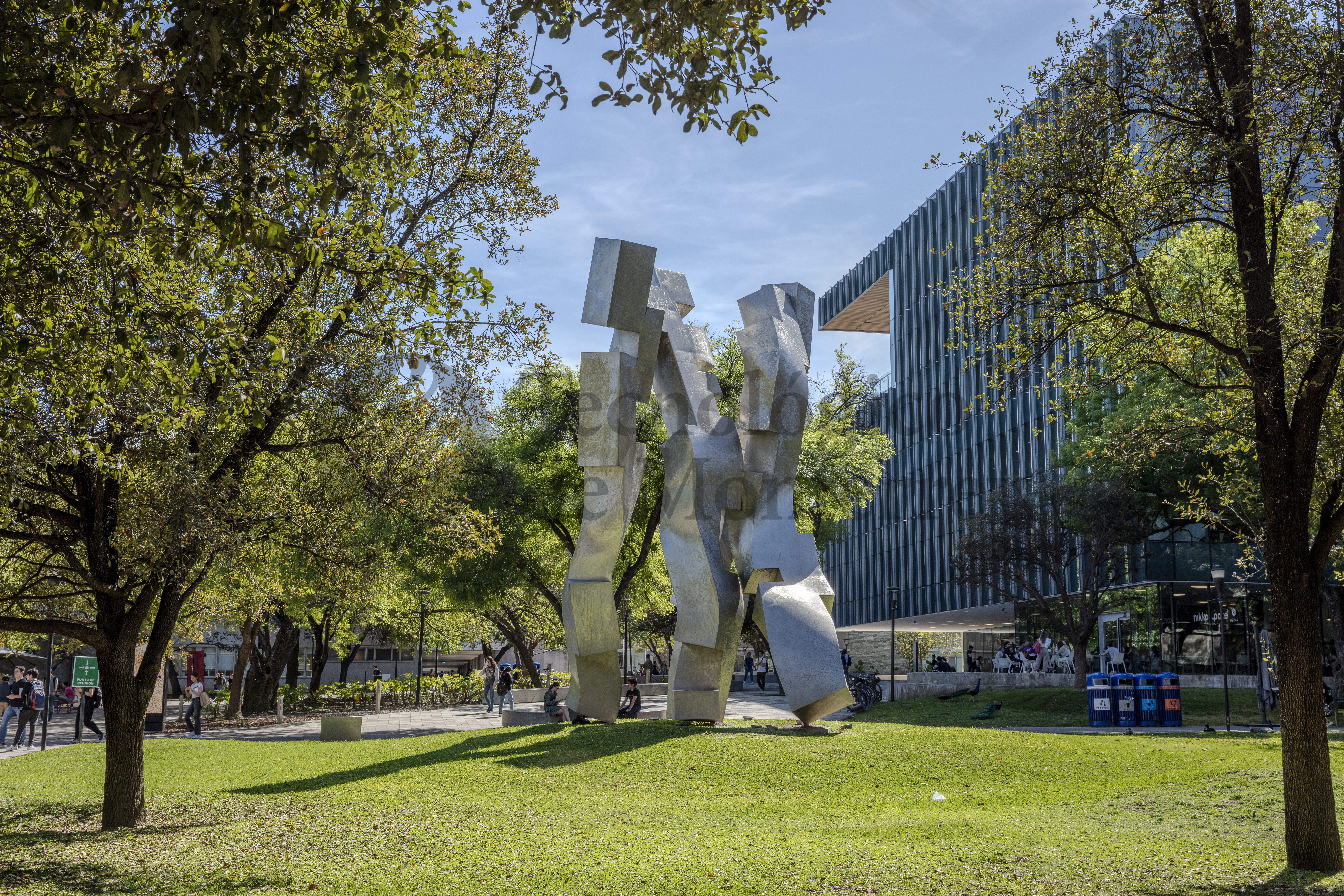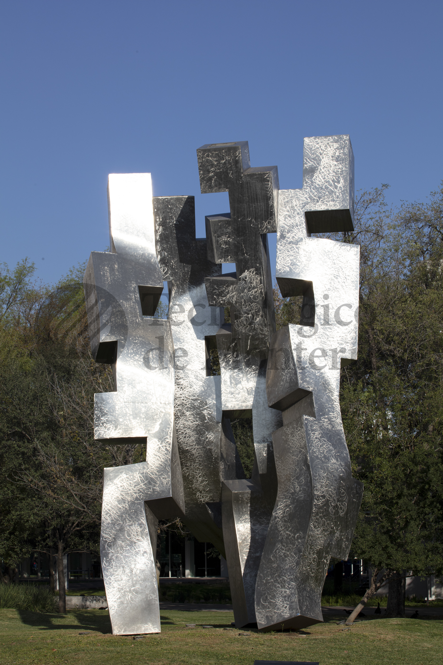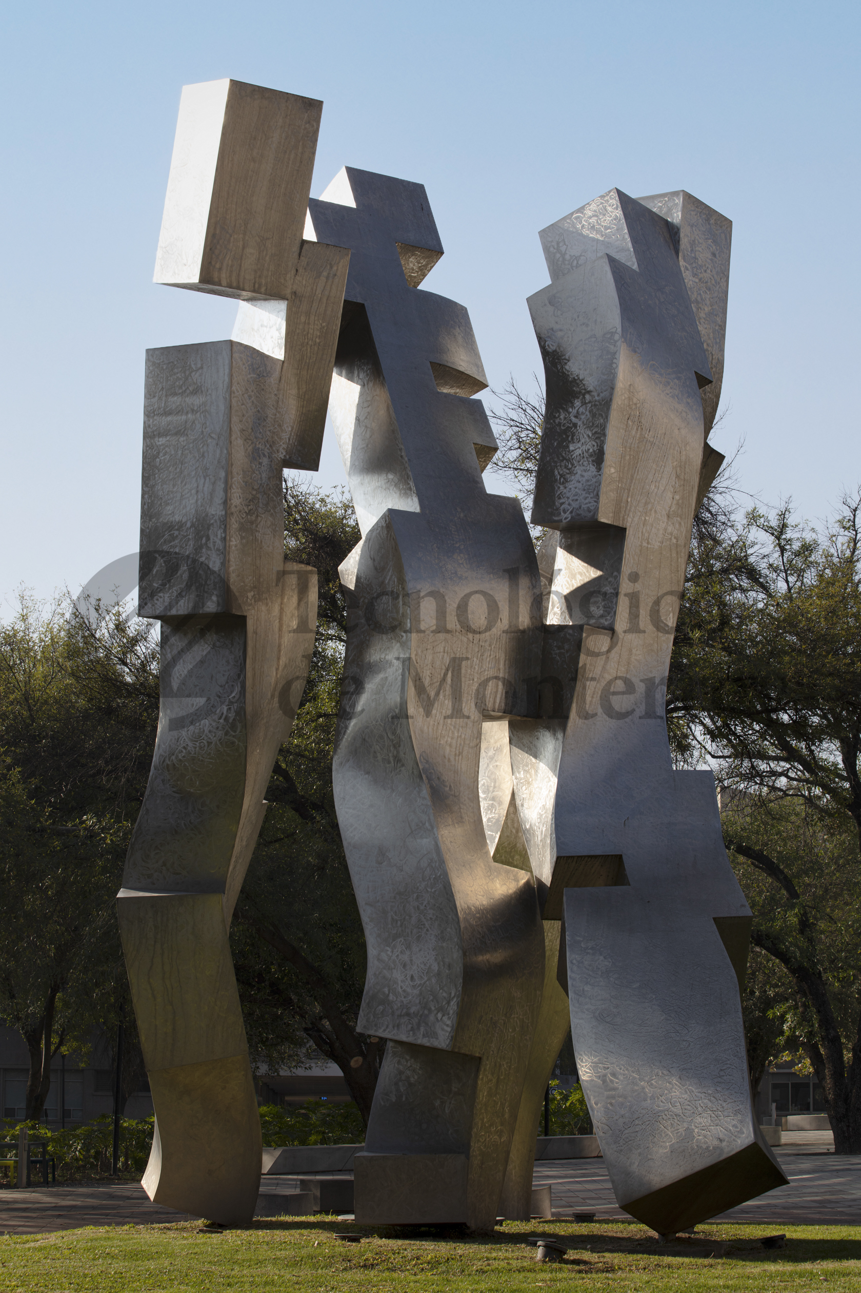"Canto a la luz" de Jorge Elizondo, escultura geométrica de ácero inoxidable de 9 metros de altura, en disposición vertical emplazada en el jardín del ITESM, dedicada al empresario Lorenzo Zambrano. El artista juega con la luz y las sombras, logrando un impacto visual intrigante desde cualquier ángulo. Las formas abstractas, talladas con líneas limpias y superficies pulidas, parecen elevarse hacia el cielo, evocando dinamismo y movimiento. Esta obra está compuesta por bloques entrelazados que generan una sensación de equilibrio a pesar de su robustez. Al reflejar el sol, la escultura simboliza una búsqueda constante de iluminación y conocimiento, características claves de la innovación y el progreso.