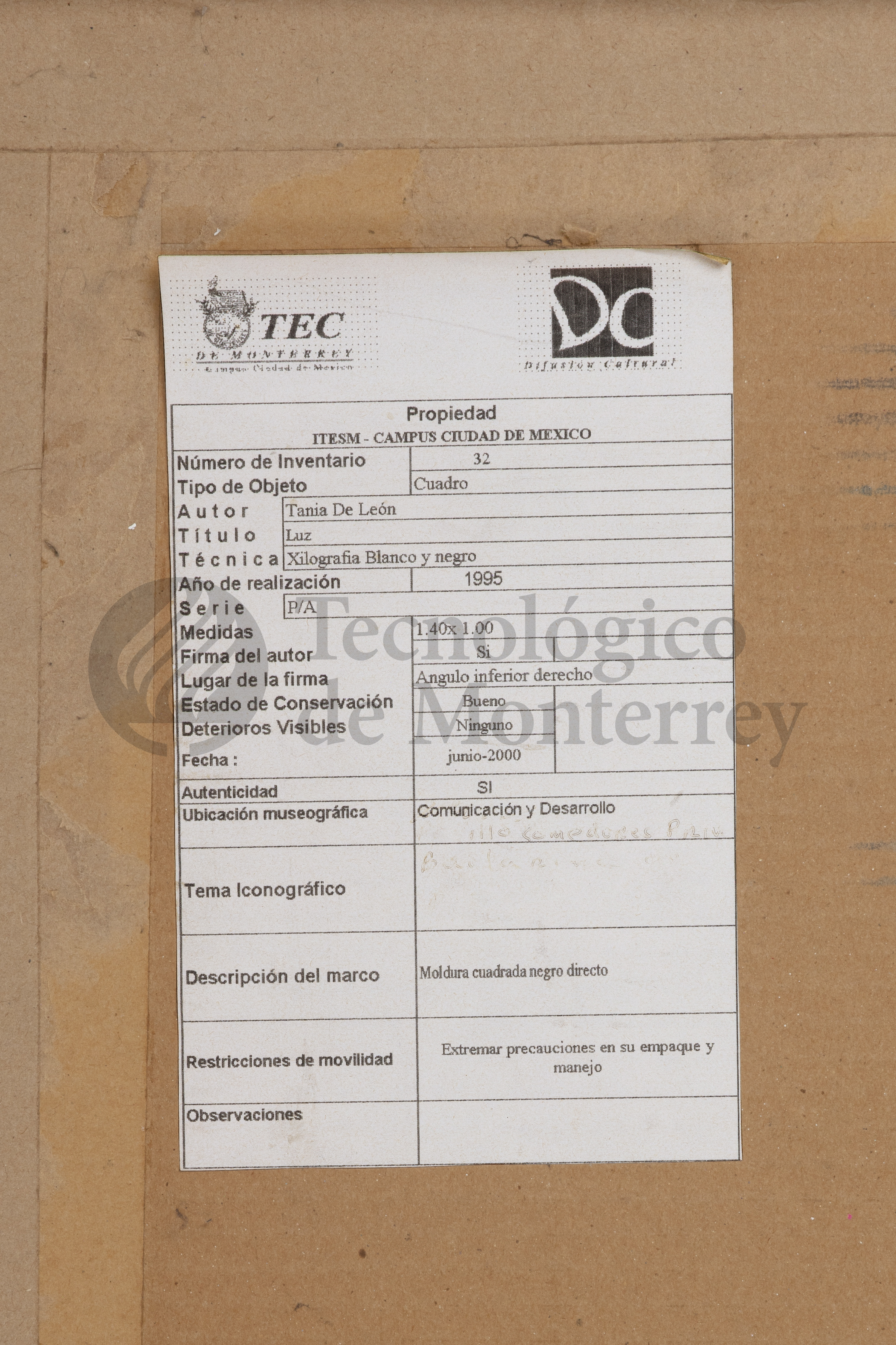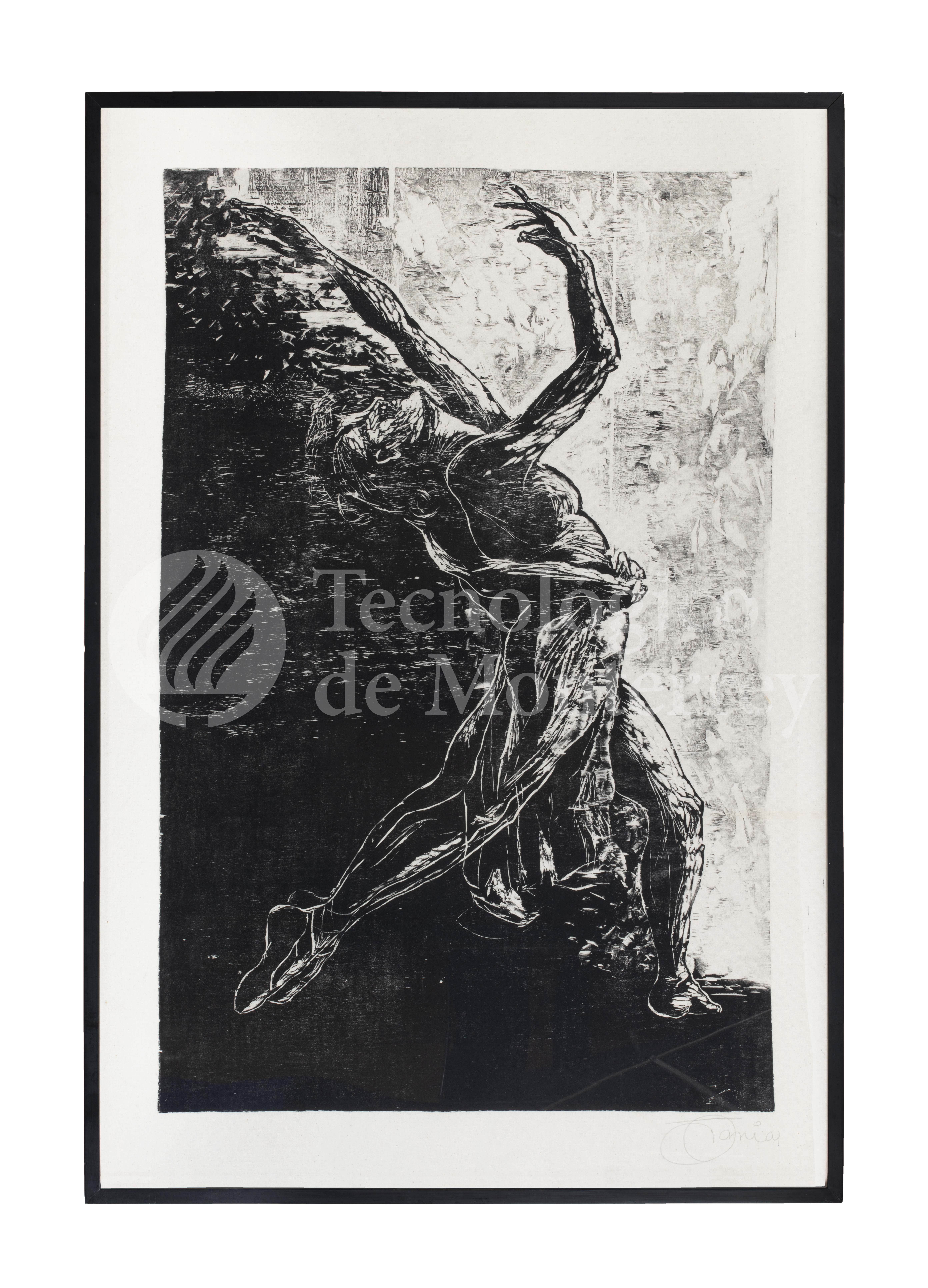 "Luz" de Tania de León. Xilografía en blanco y negro que presenta una figura humana en movimiento. El uso de los colores blanco y negro son característicos de un grabado, resaltando la fuerza dramática de la composición. La figura se encuentra levantando los brazos de manera enérgica y una pierna estirada hacia atrás, de una manera estilizada que contrasta con el fondo oscuro. Posiblemente se trate de una bailarina al contar con balerinas o zapatillas de ballet. Las líneas fuertes y definidas que componen el cuerpo crean una sensación de dinamismo y poder, mientras que el fondo texturizado y abstracto aporta profundidad.