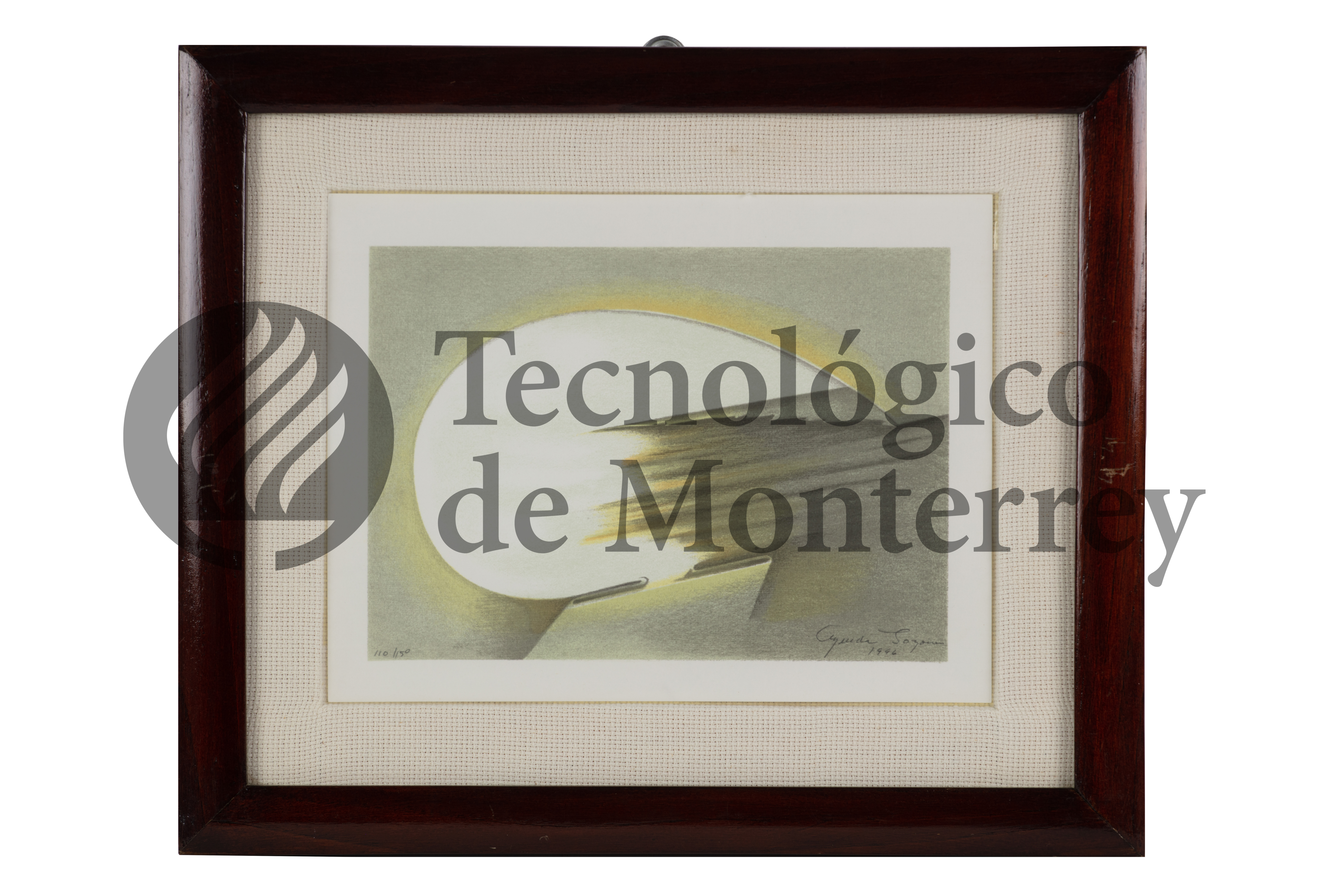 Obra gráfica en serigrafía a 4 tintas sobre papel de composición abstracta con forma orgánica al centro color blanca y trazos diagonales que la intersectan