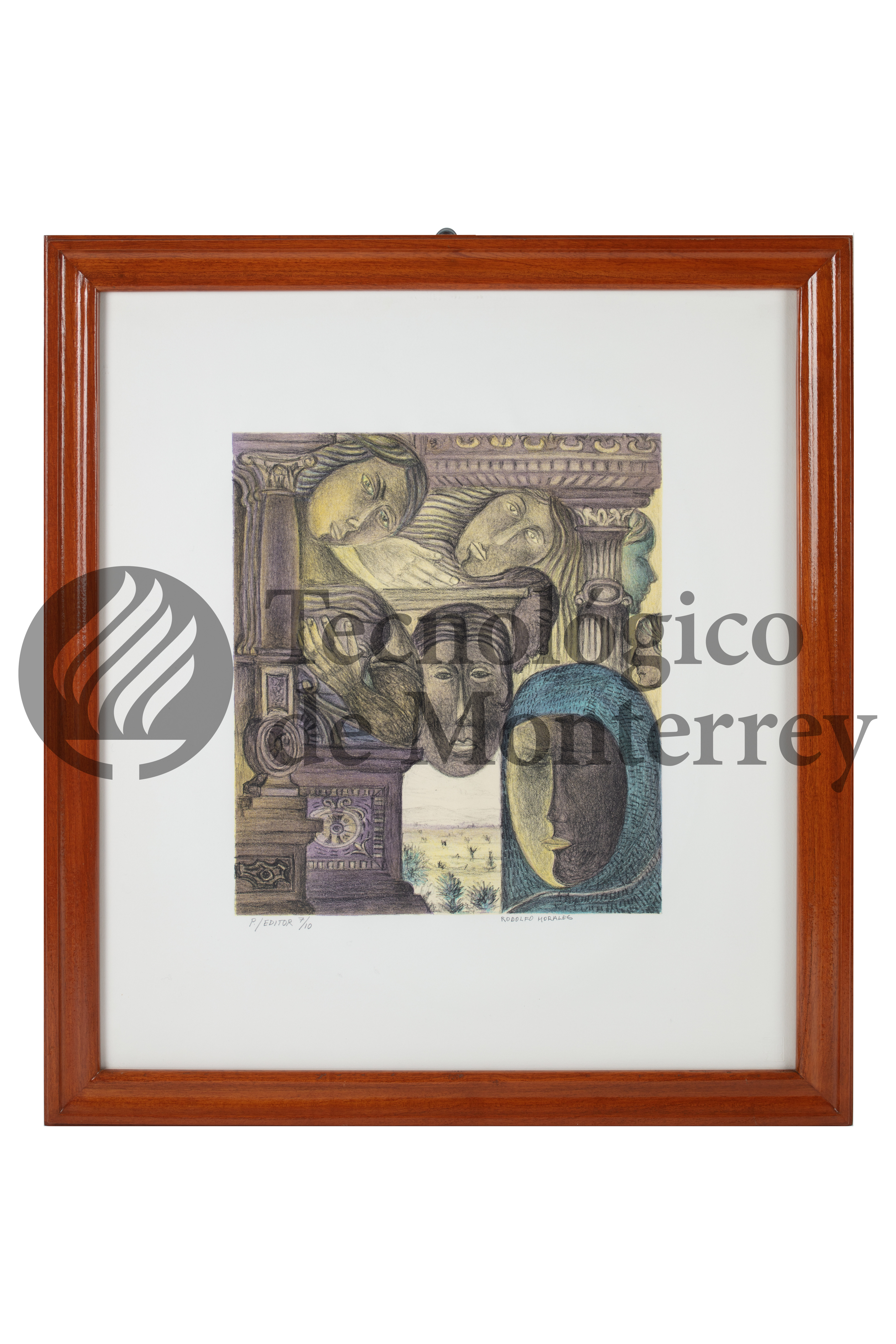 Obra gráfica en litografía a 7 tintas sobre papel de algodón, en cuya composición se aprecia la construcción de una iglesia, ocho cabezas de mujer y un paisaje de campo al fondo
