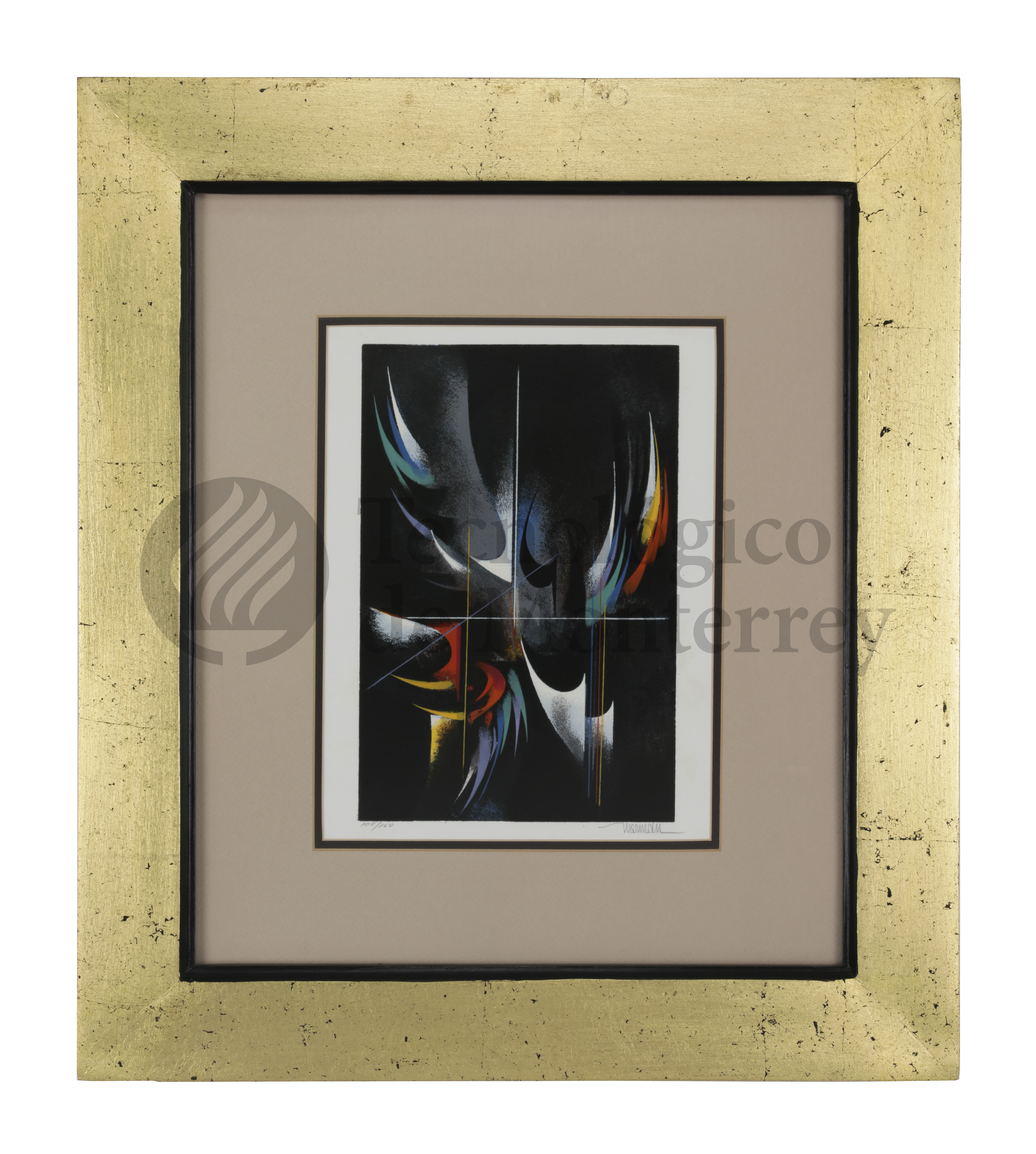 Serigrafía a color de Leonardo Nierman, que forma parte de la carpeta de grabados realizados para conmemorar el vigésimo aniversario del Campus Estado de México. La imagen en papel presenta contrastes de colores vibrantes sobre un fondo oscuro. Las formas fluidas y curvilíneas, en tonos de rojo, azul, amarillo y blanco, parecen moverse con energía, evocando la sensación de explosión. El uso del negro como fondo potencia el brillo de los colores, dándoles mayor protagonismo y profundidad.
