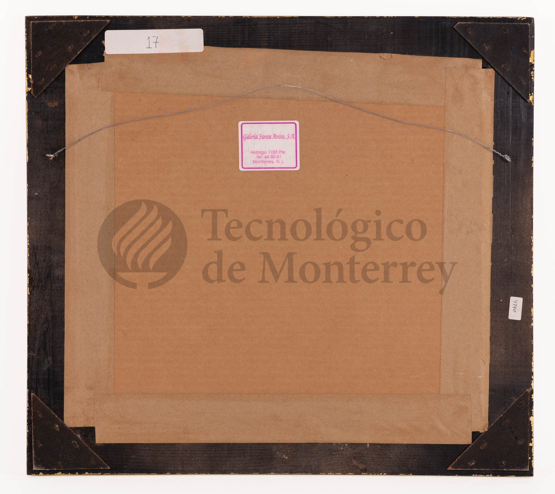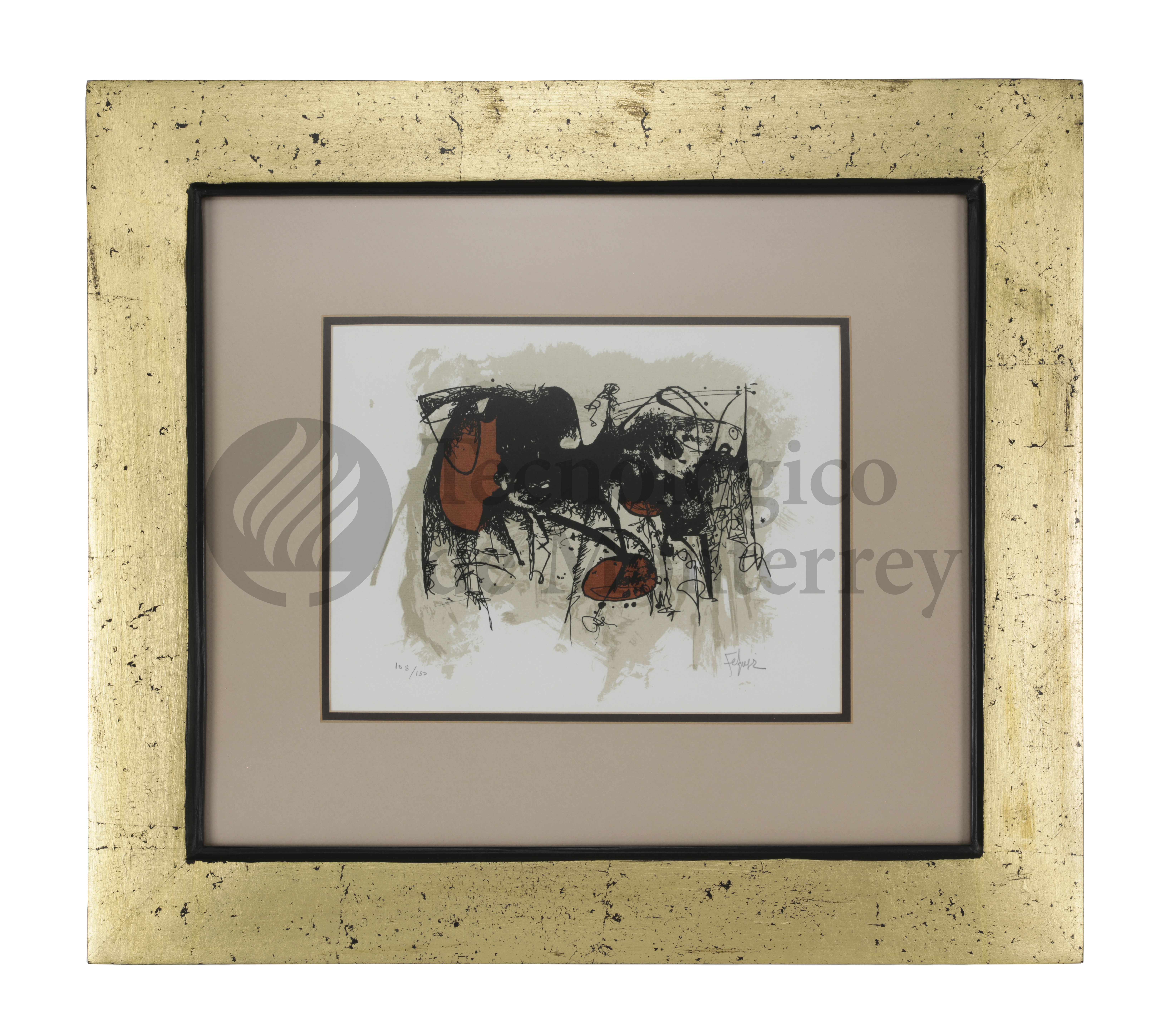 Serigrafía a color de Manuel Felguérez, que forma parte de la carpeta de grabados realizados para conmemorar el vigésimo aniversario del Campus Estado de México. En la imagen se observan manchas negras y formas irregulares de color rojo, que parecen fluir y entrelazarse sobre un fondo neutro. Las líneas y figuras trazadas de manera libre sugieren un movimiento dinámico, casi caóticon. Los contrastes de colores oscuros y cálidos crean un equilibrio visual.