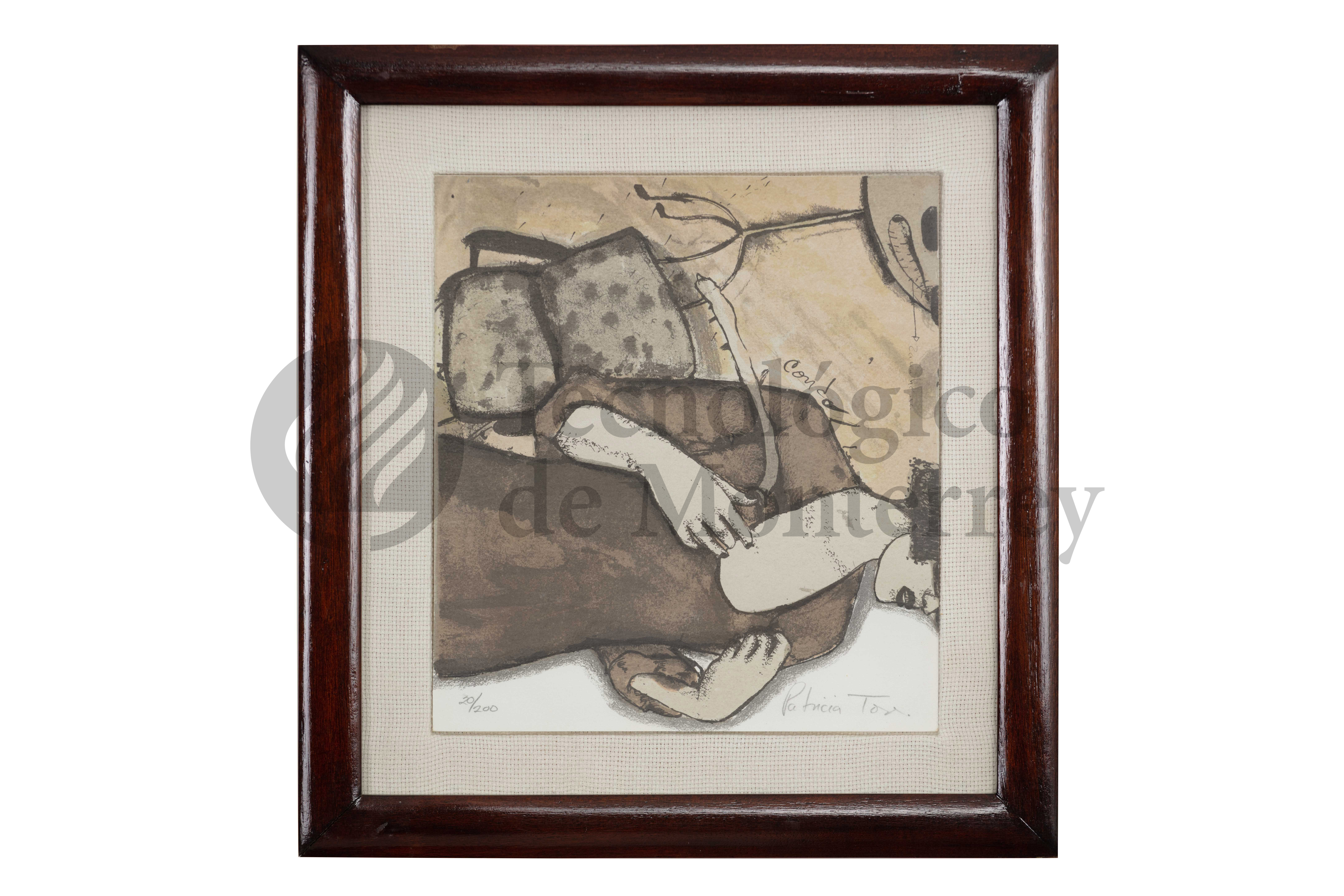 Obra gráfica de serigrafía sobre papel en cuya composición central en tonos sepia, se aprecia una mujer incompleta, detrás de ella hay una silla. En el hombro se lee la palabra "Condolencias"