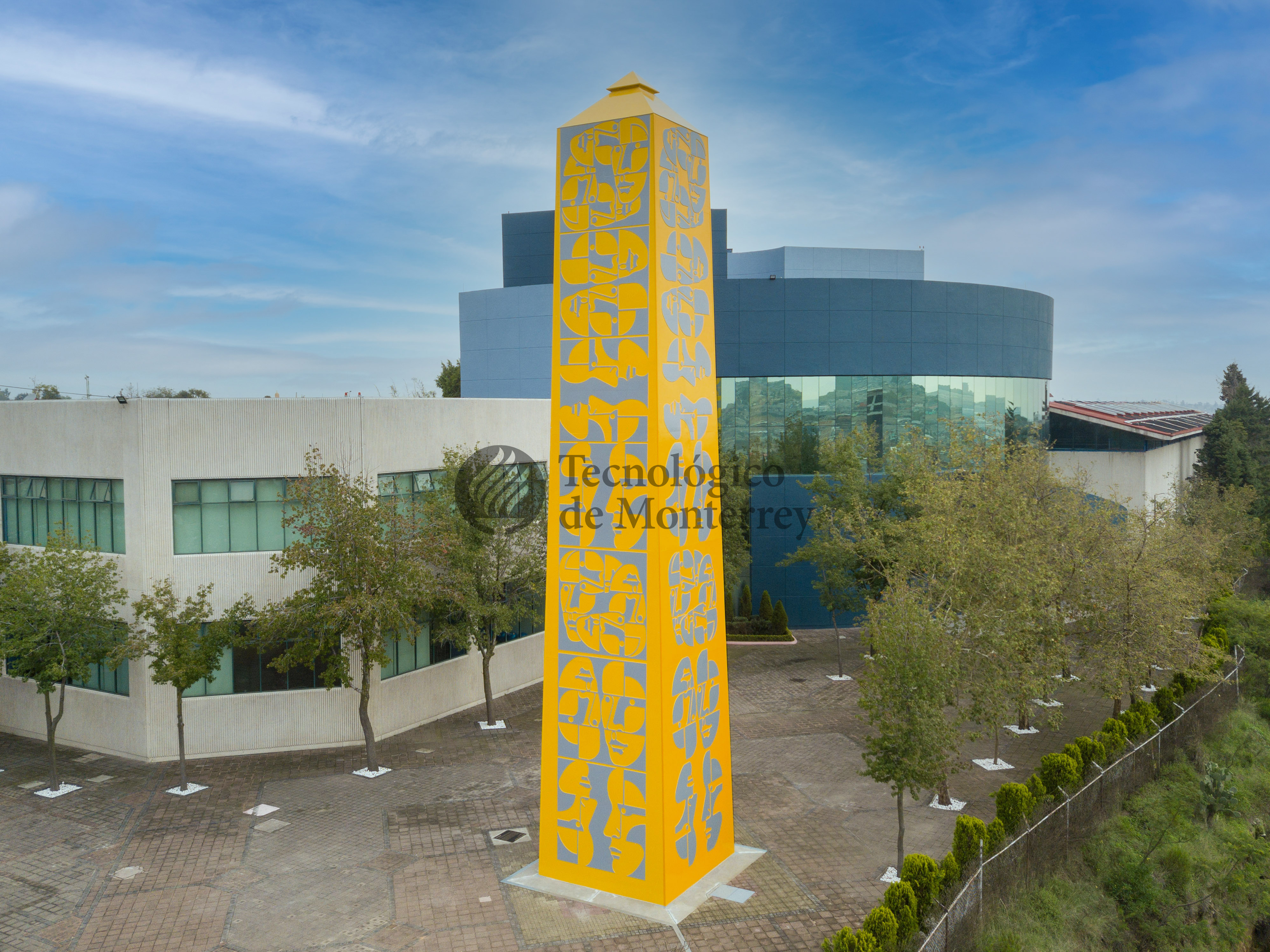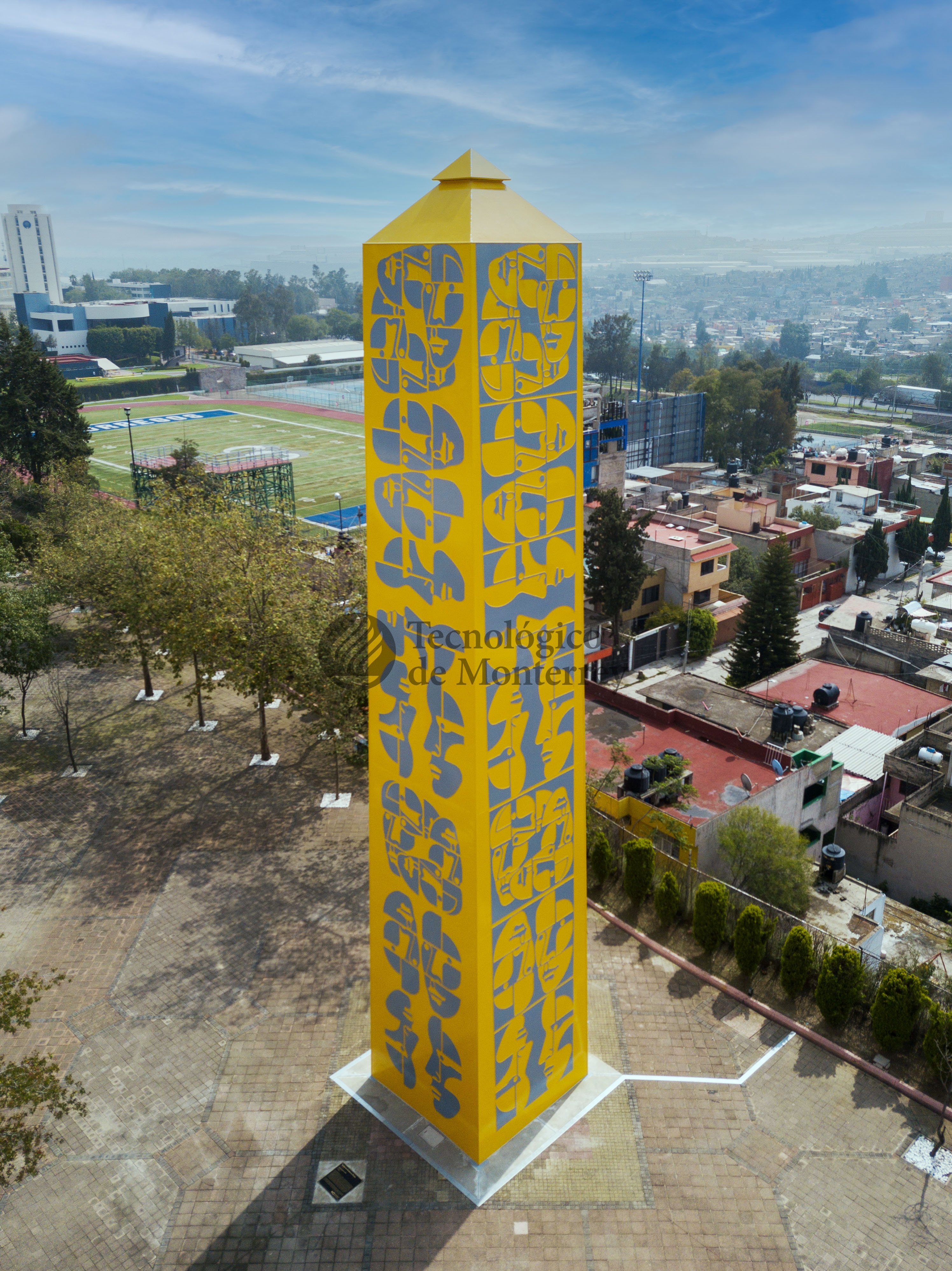 Obelisco monumental realizado en acero lacado en amarillo y gris alternadamente, entre fondo y las formas de rostros humanos de perfil.