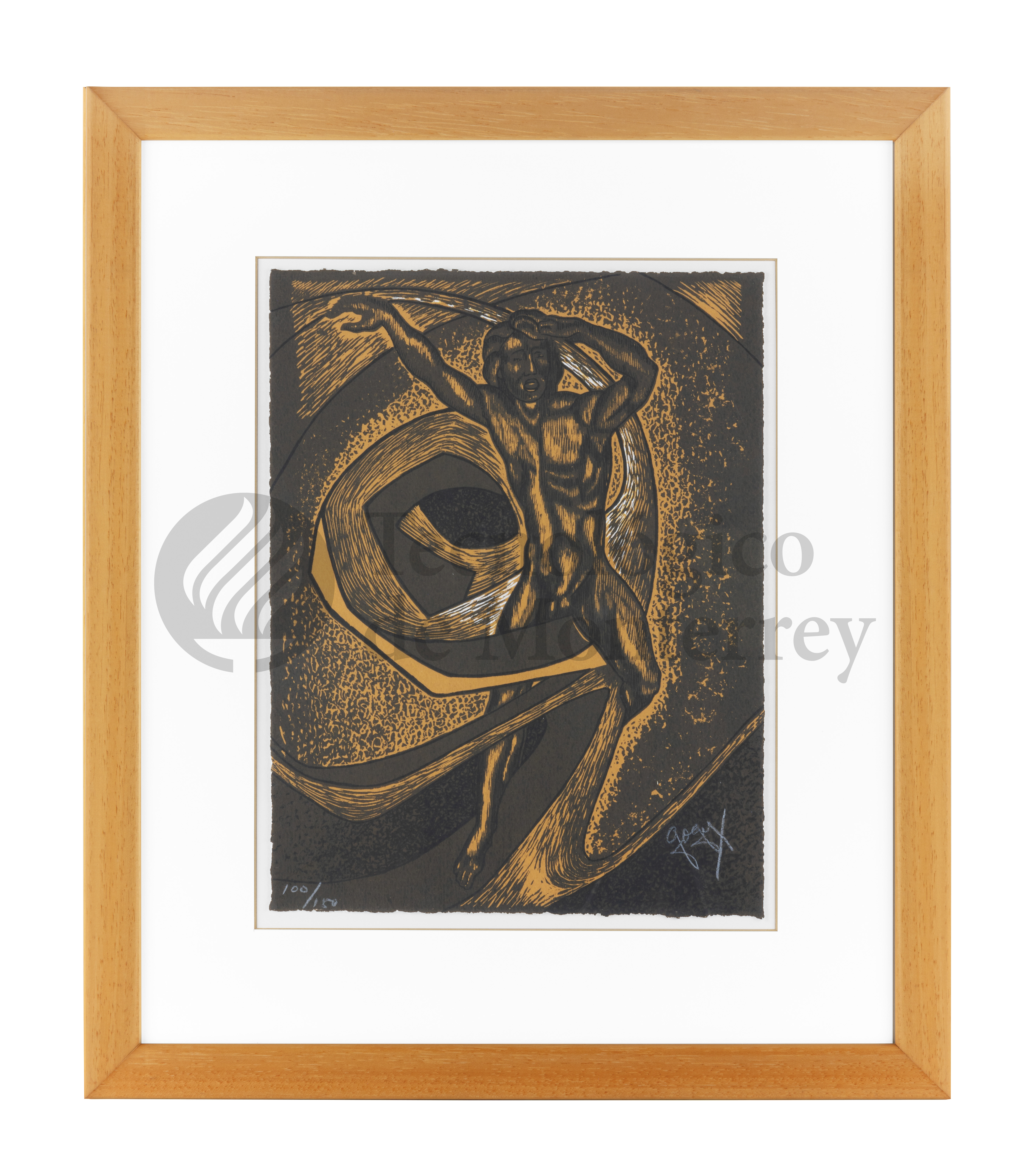 La serigrafía a color de Gogy Farías, que forma parte de "Carpeta 30 aniversario CEM, 2006", presenta una figura humana central que parece estar en movimiento dentro de un espacio dinámico y abstracto. El personaje, musculoso y en una pose dramática, parece estirarse dentro de una espiral que lo envuelve. La composición utiliza un contraste fuerte entre tonos oscuros y dorados, lo que resalta la anatomía detallada de la figura y la sensación de movimiento. La textura del fondo, junto con la representación del cuerpo humano, refuerza el estilo expresivo y vigoroso de la pieza; esta obra refleja la capacidad de Farías para combinar elementos figurativos y abstractos en una narrativa visual poderosa. Numerada 100/150.