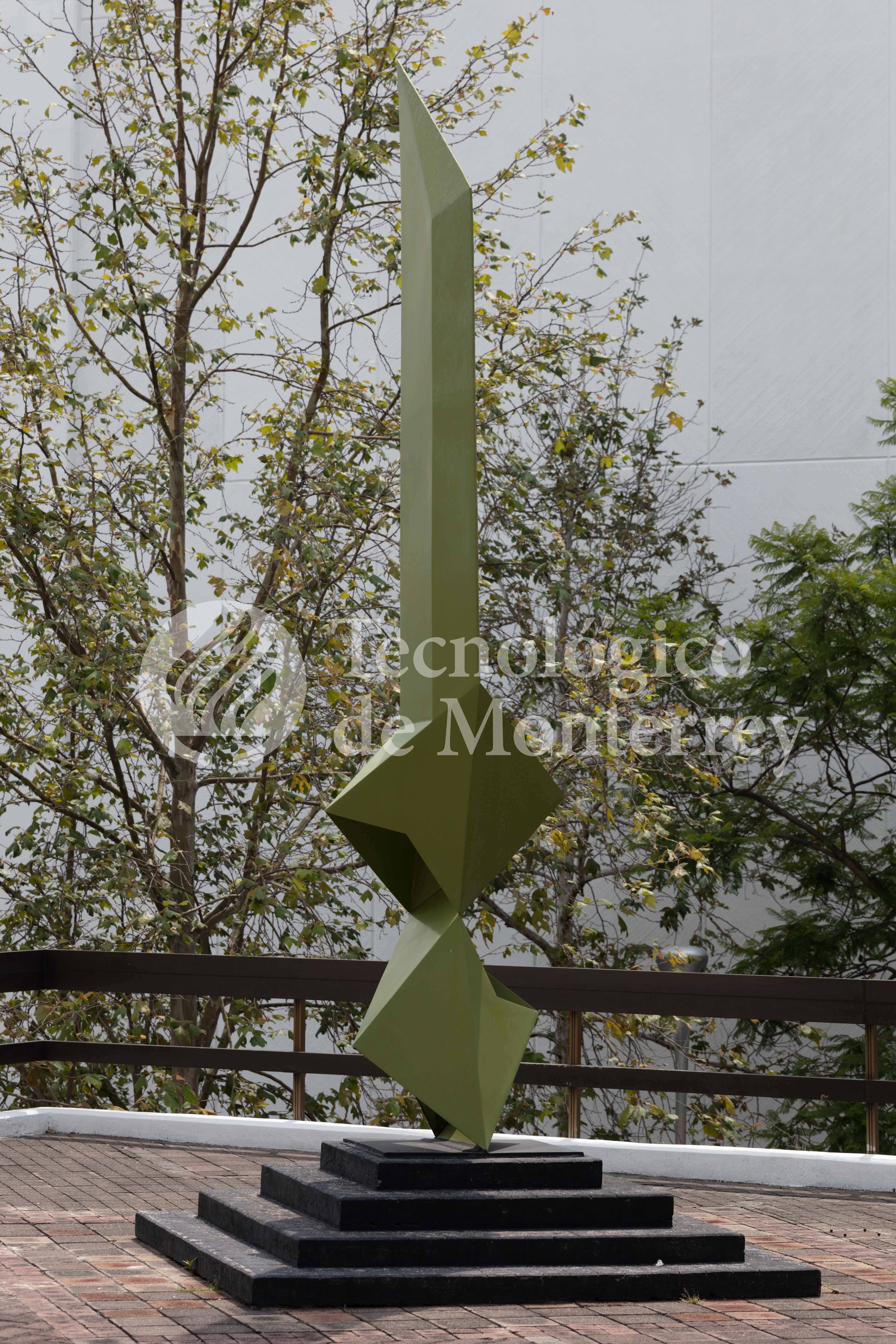 Obelisco de mediano formato en acero soldado y lacado en verde sobre una base escalonada de concreto.