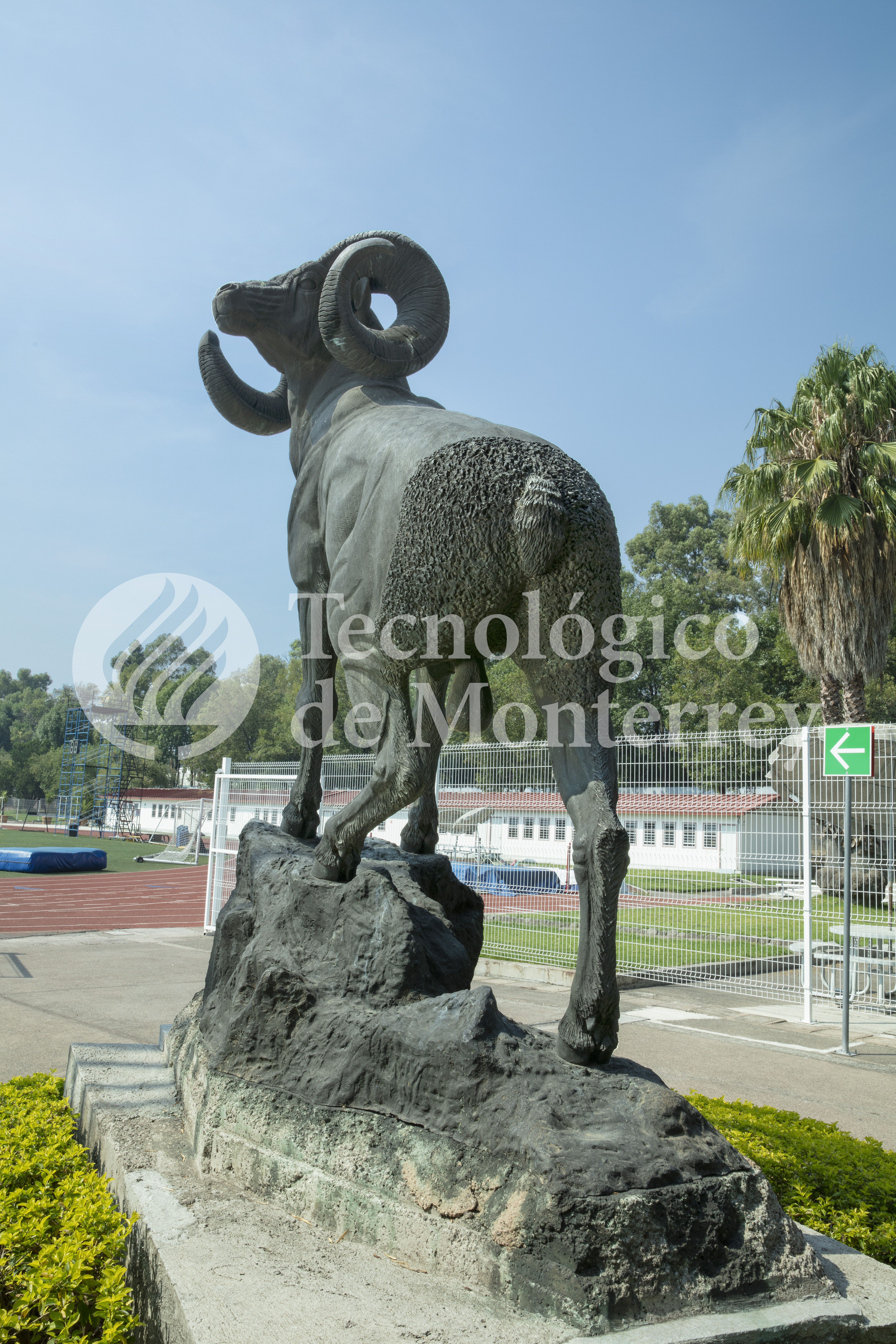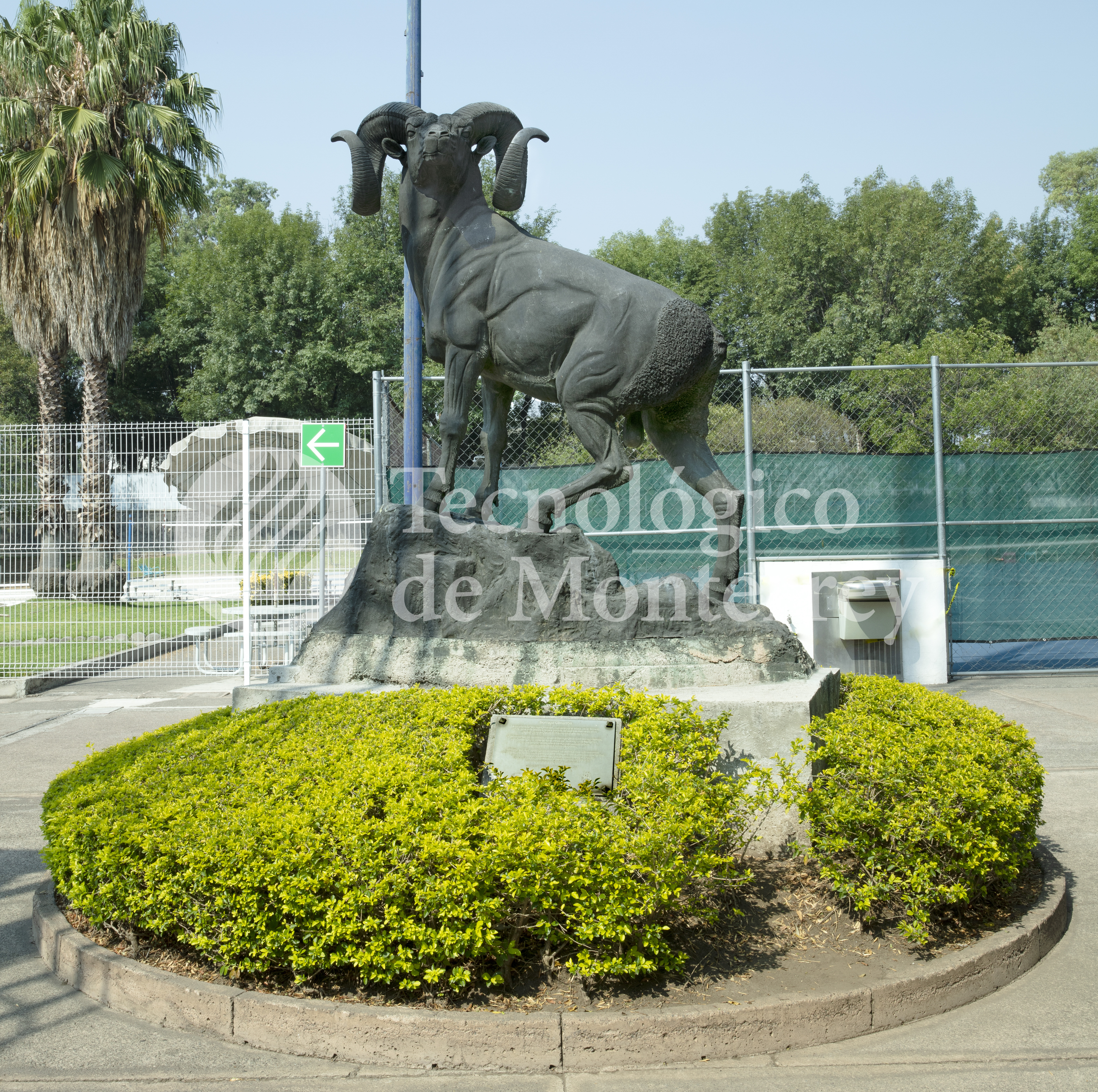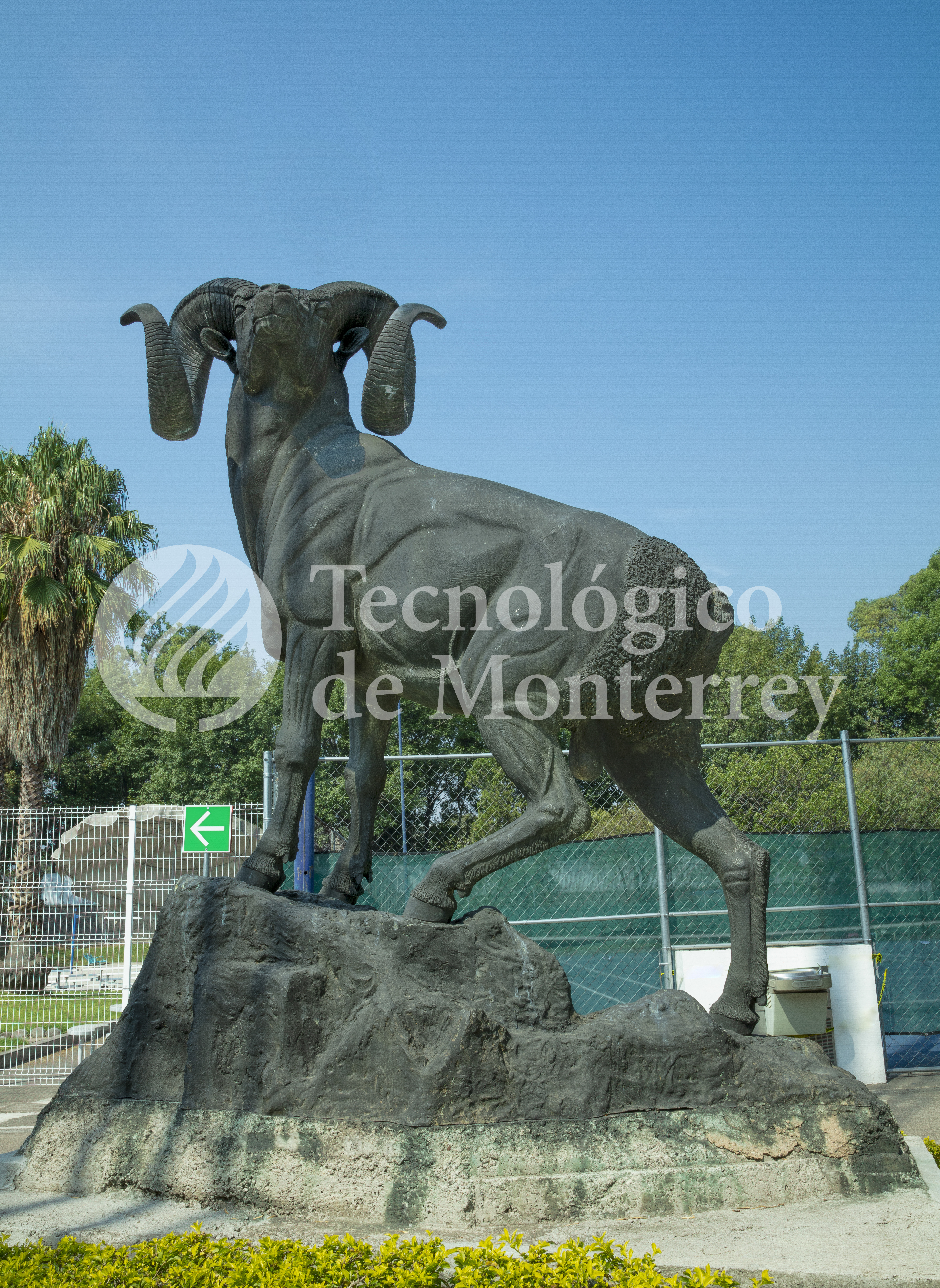 "Borrego Salvaje" de Javier Moreno. Escultura colada en bronce patinada que representa a un carnero en una postura imponente, erguido sobre una roca, con las patas firmemente plantadas, transmitiendo una sensación de fuerza, orgullo y nobleza. Sus cuernos curvados y su musculatura detallada reflejan el poder y la resistencia del animal, que es el símbolo del Tecnológico de Monterrey. El material de la obra le otorga una presencia majestuosa y duradera. Esta pieza se ha convertido en un emblema de la institución, representando los valores de coraje, tenacidad y liderazgo que caracterizan a la comunidad del Tecnológico.