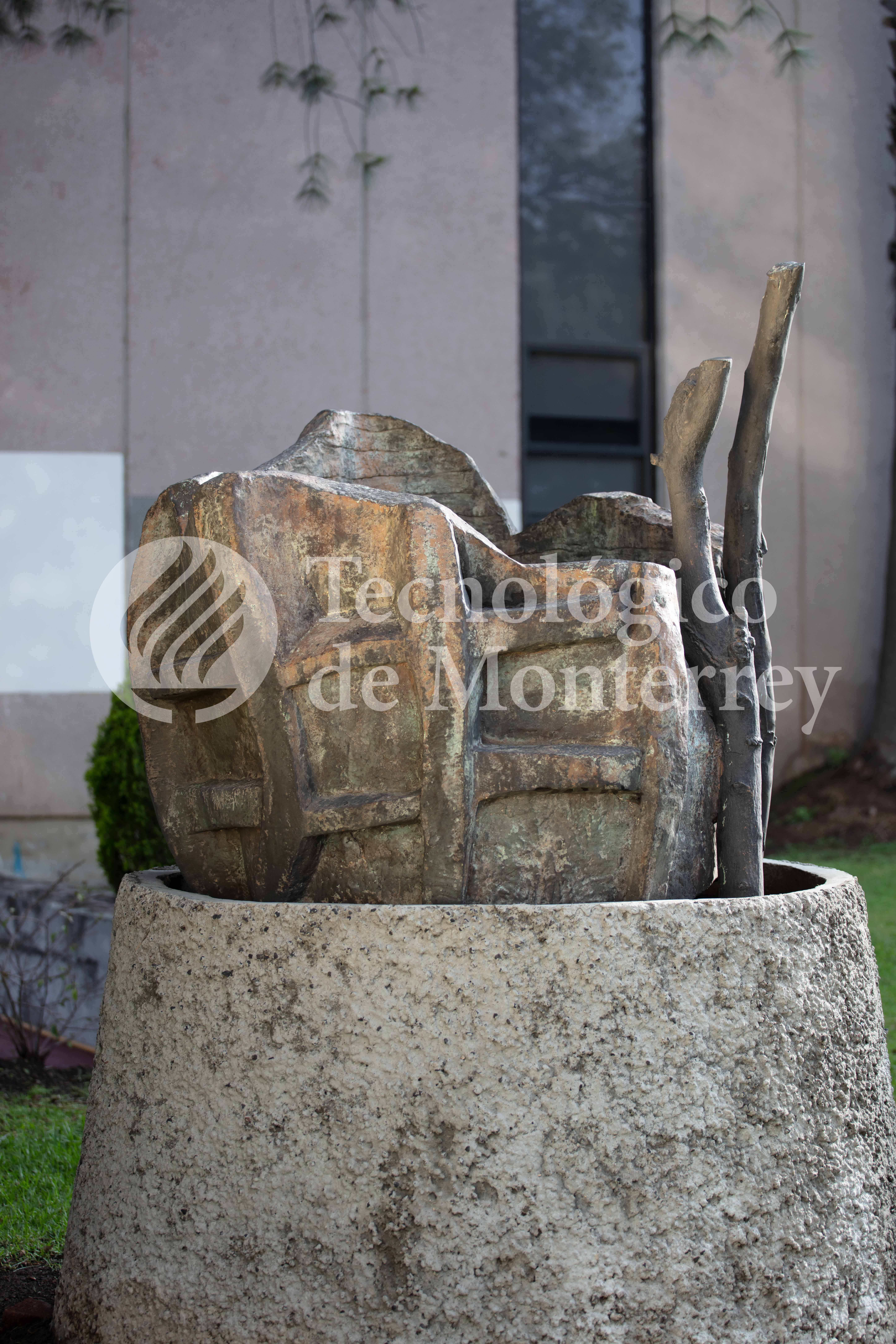 Escultura abstrata colada en bronce patinada con dos mástiles de madera que simulan ser las ramas de un árbol sobre una base circular de concreto.