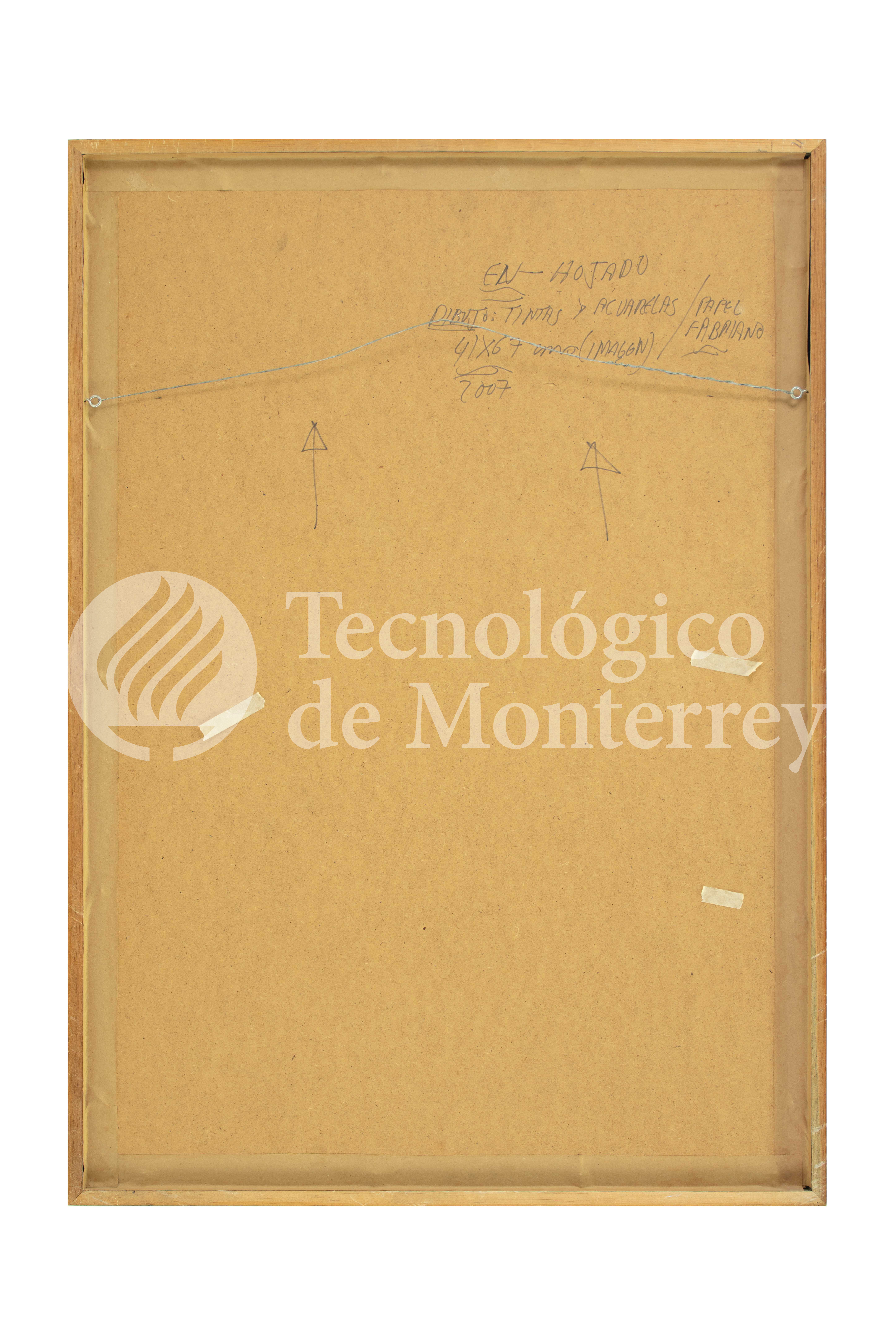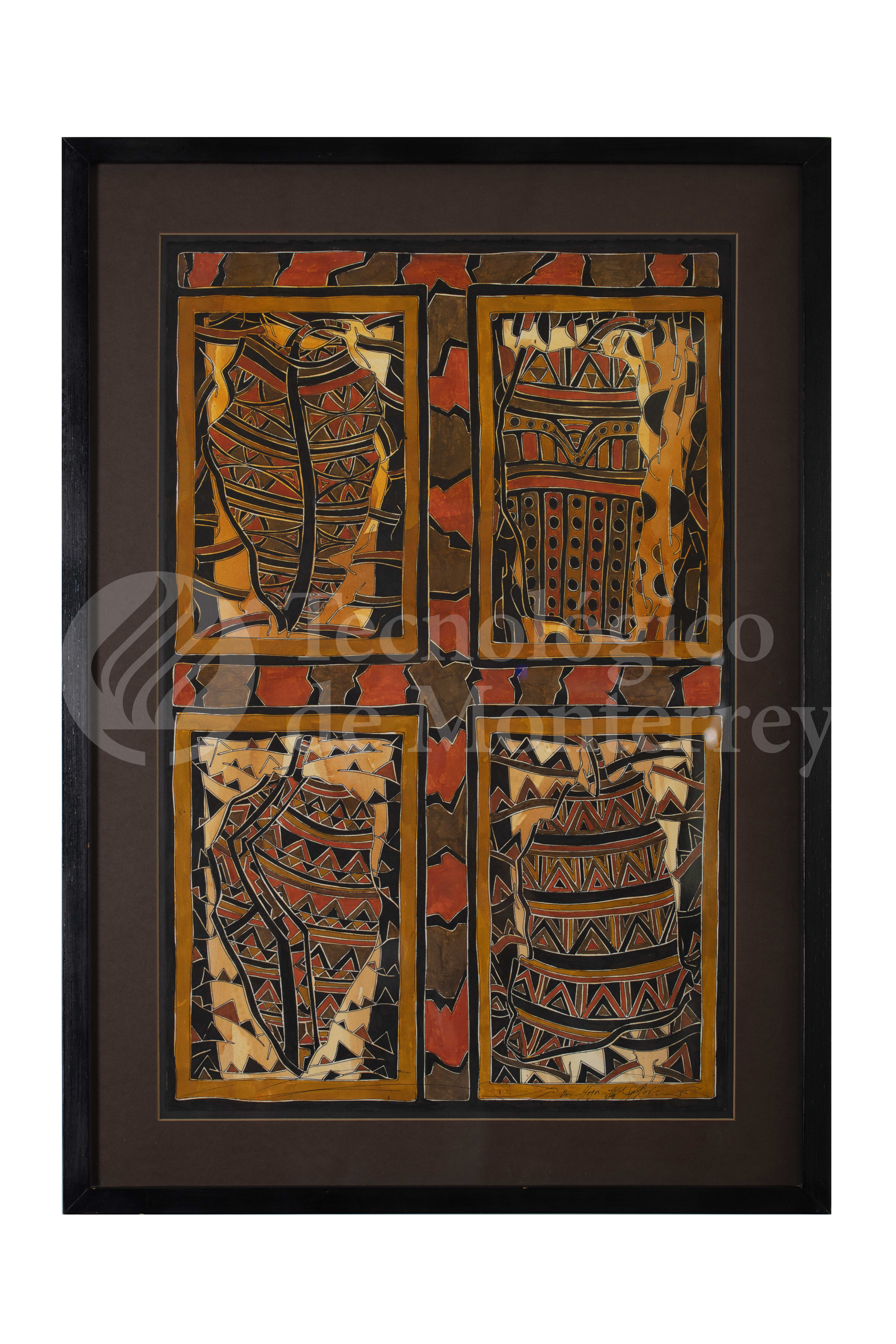 Obra gráfica sobre papel, cuya composición central está compuesta por cuatro hojas en tonos marrón estilo tribal