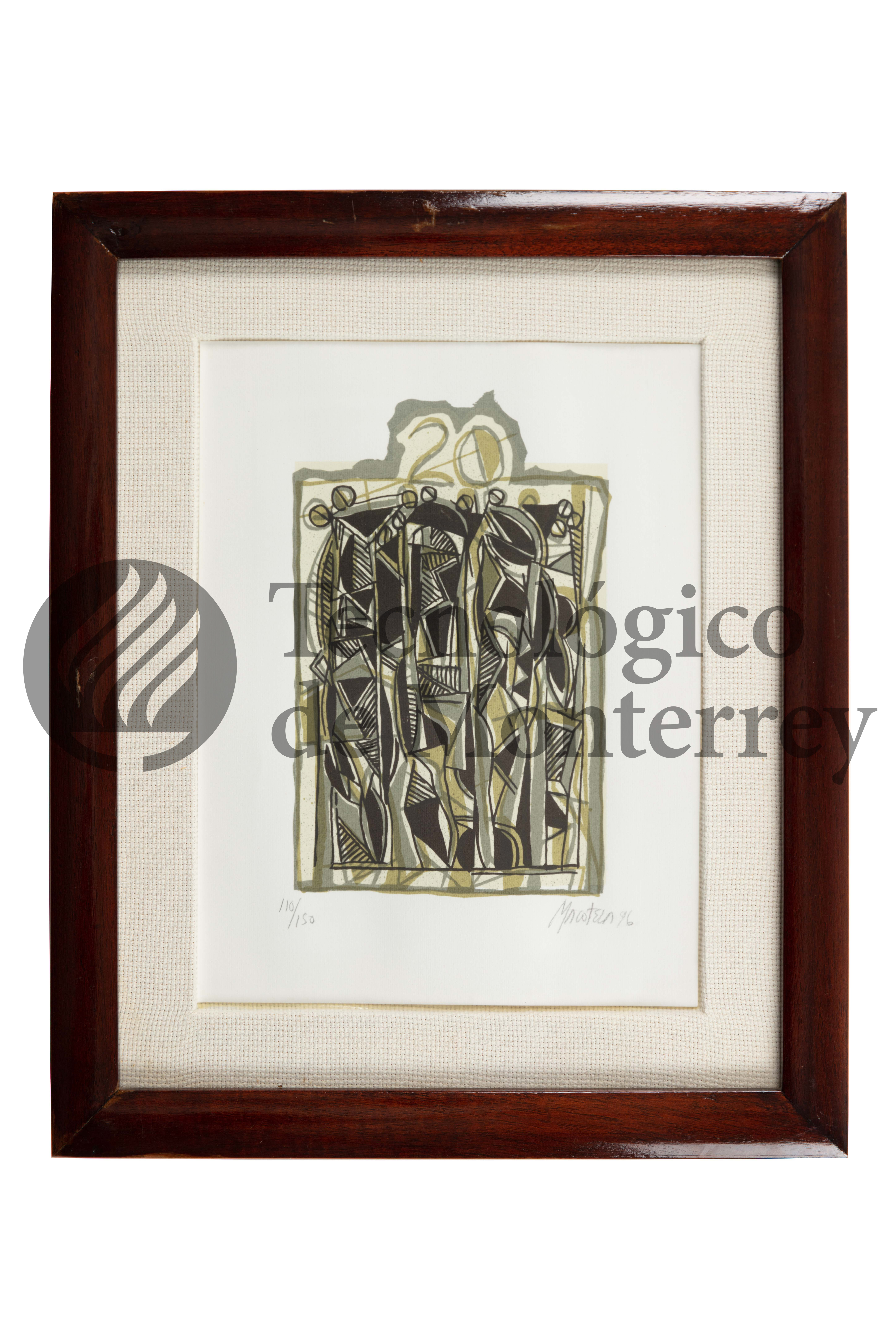Obra gráfica de serigrafía abstracta sobre papel en tonos dorado, planeado y negro, sobre él hay un número 20