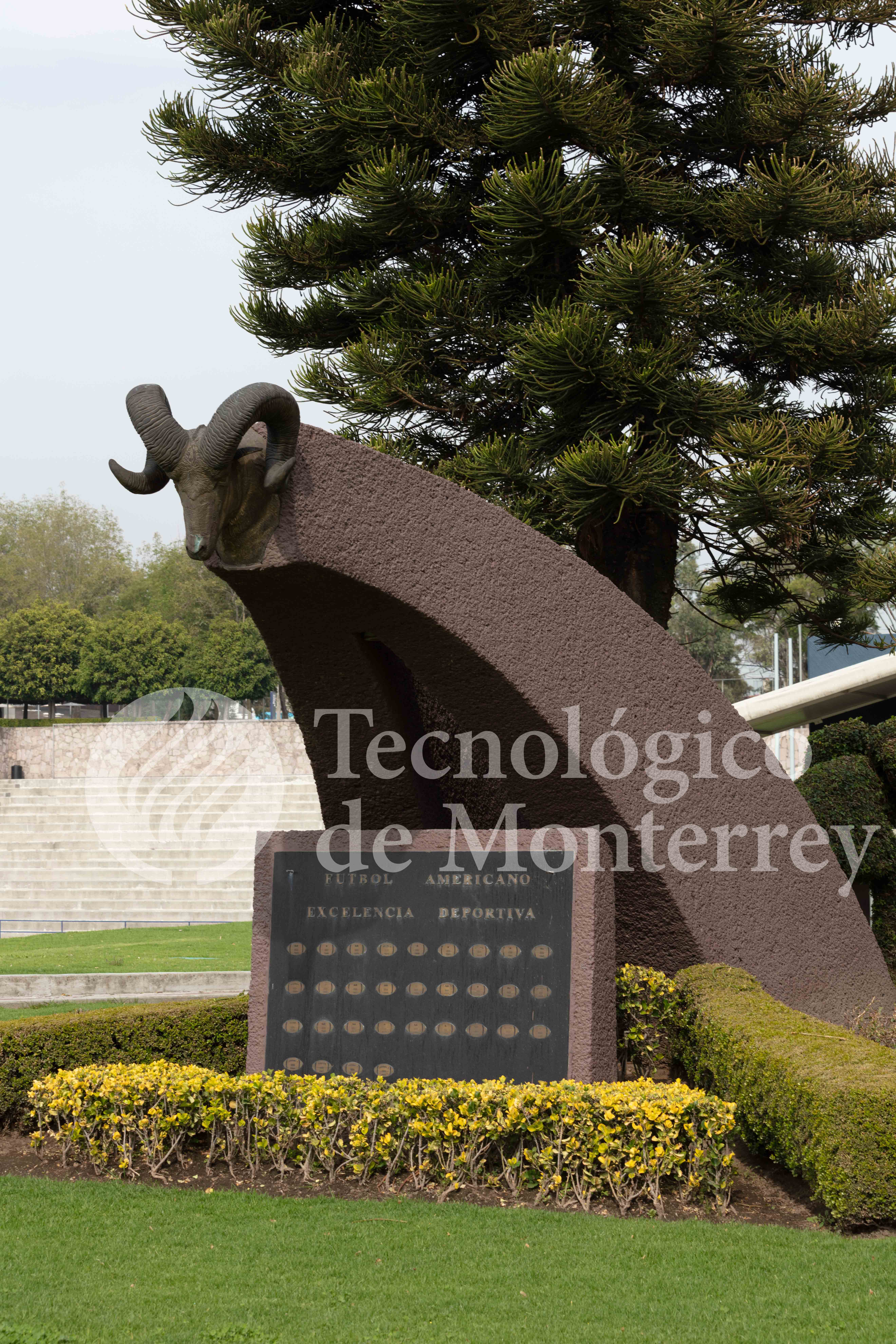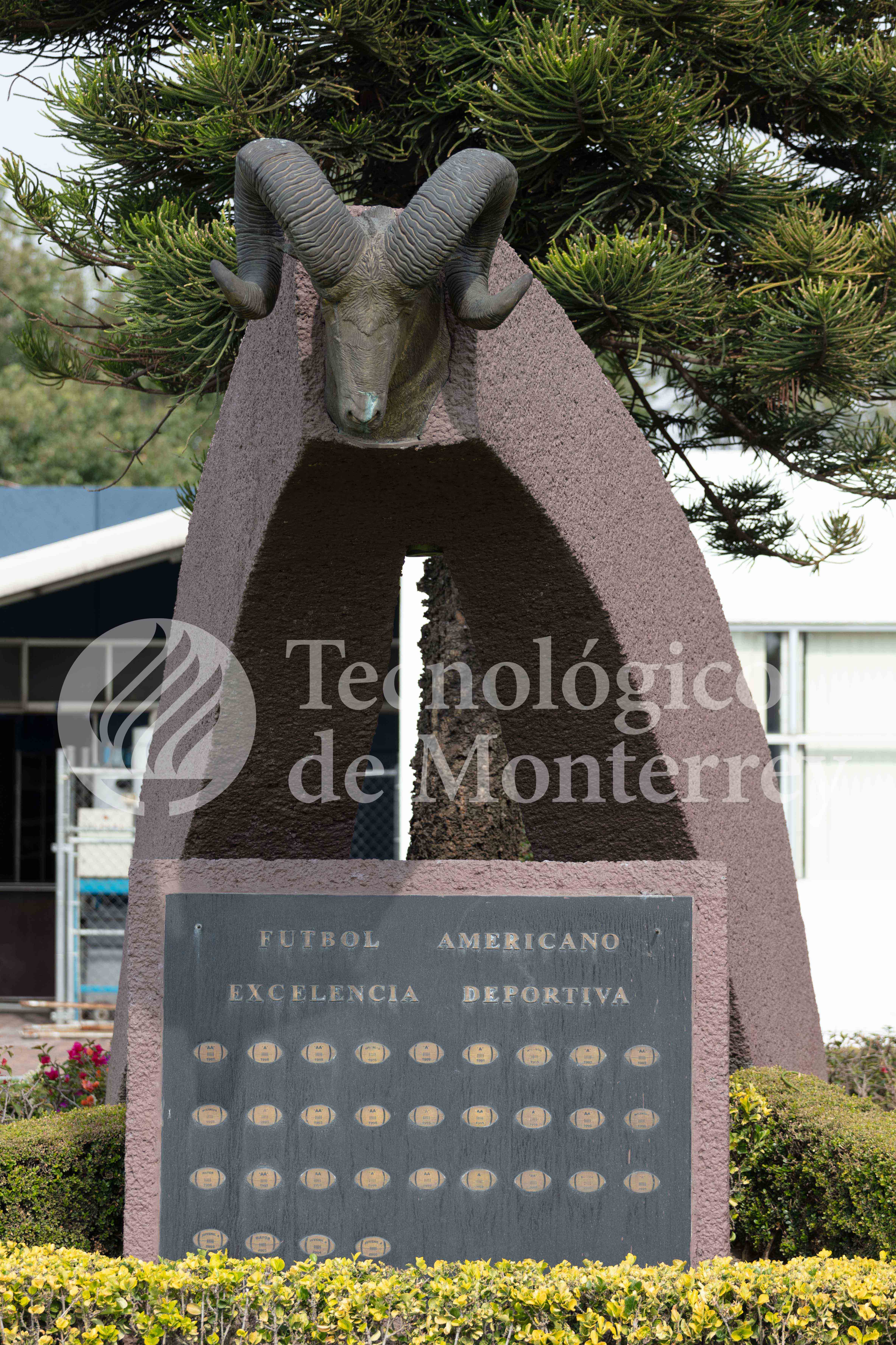 Escultura colada en bronce patinado en cuya composición central se aprecia la cabeza de un borrego cimarrón y empotrada a una base inclinada de concreto.
