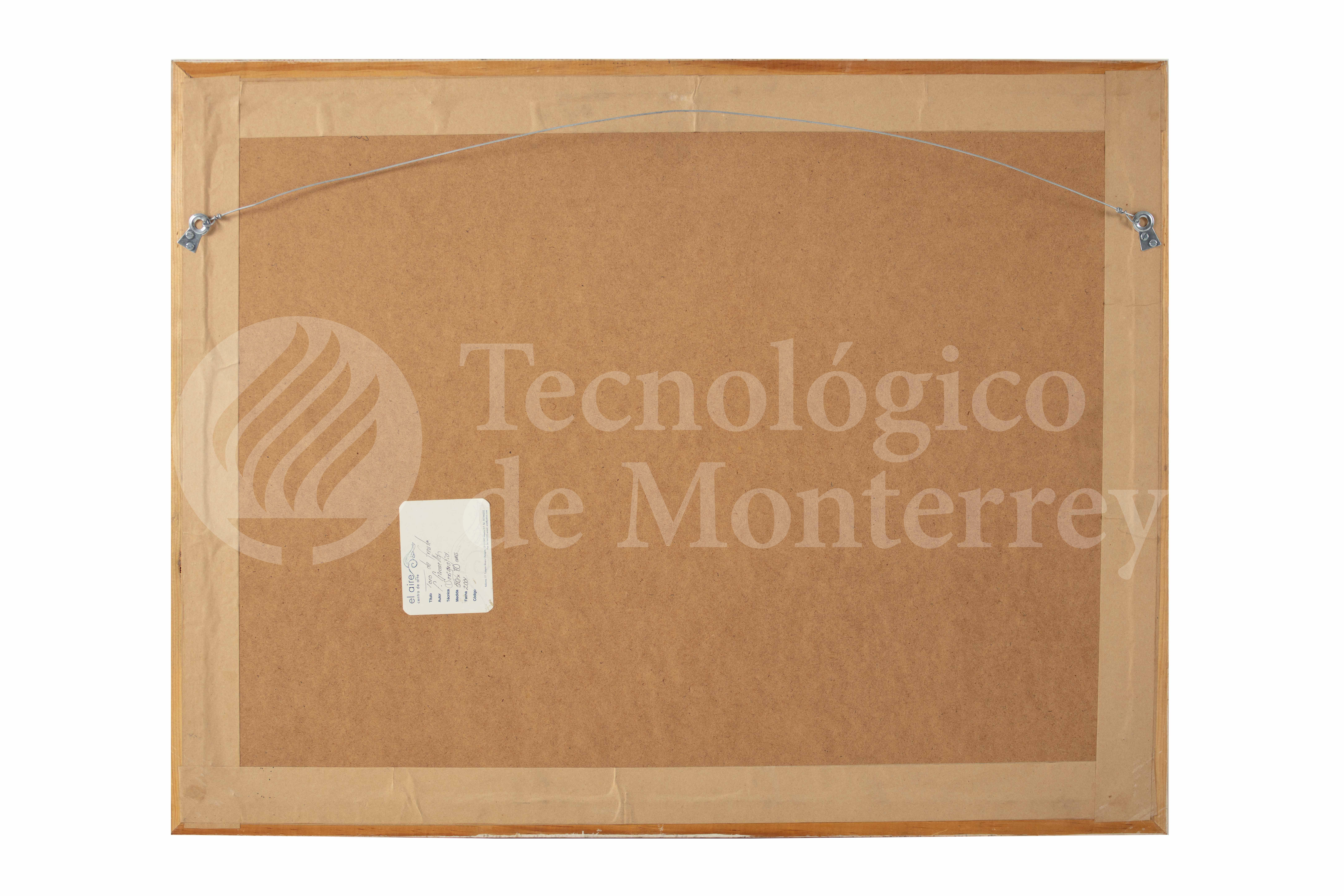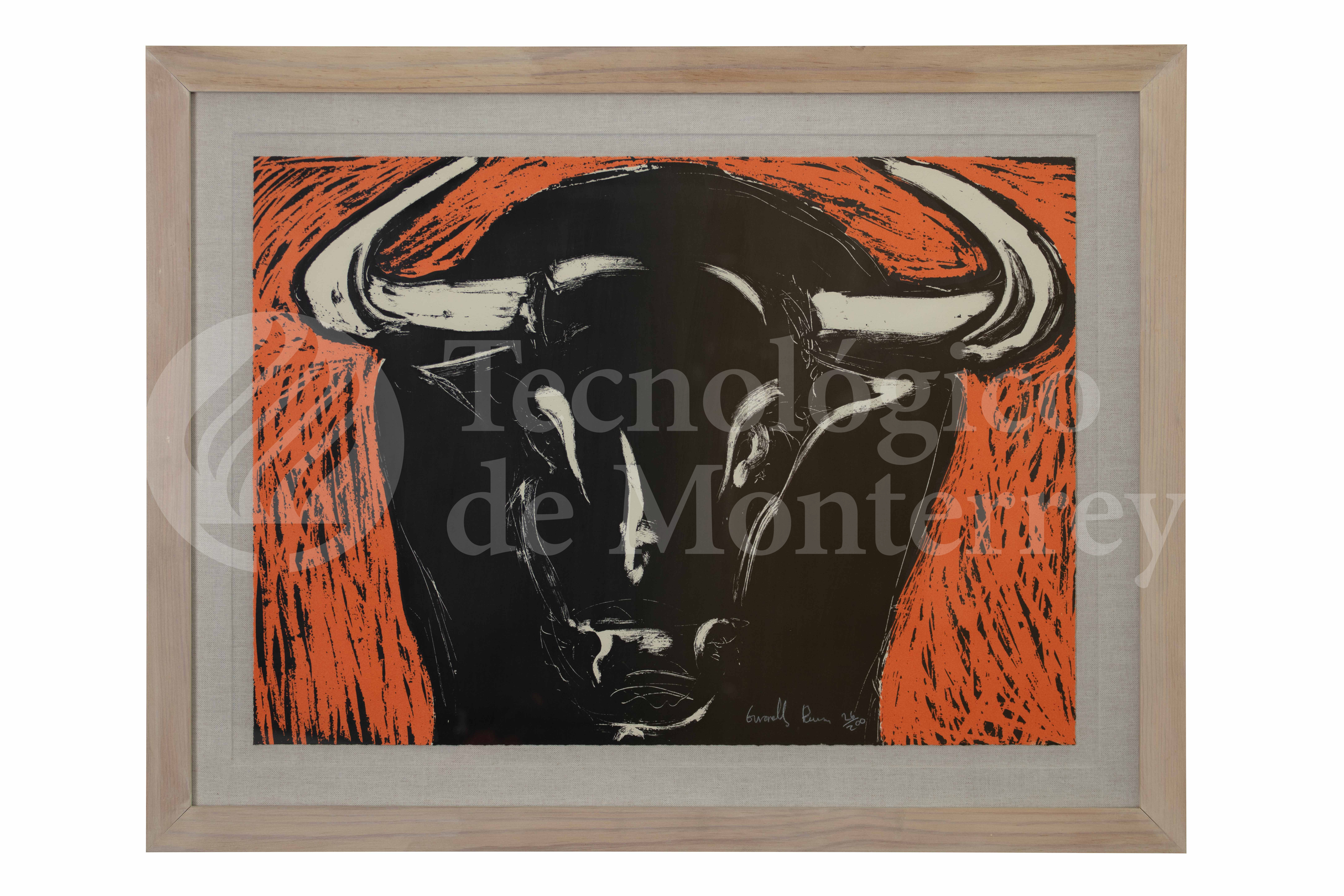 Obra gráfica de serigrafía a 2 tintas en cuya composición central se aprecia un toro de frente en un fondo anaranjado con líneas negras
