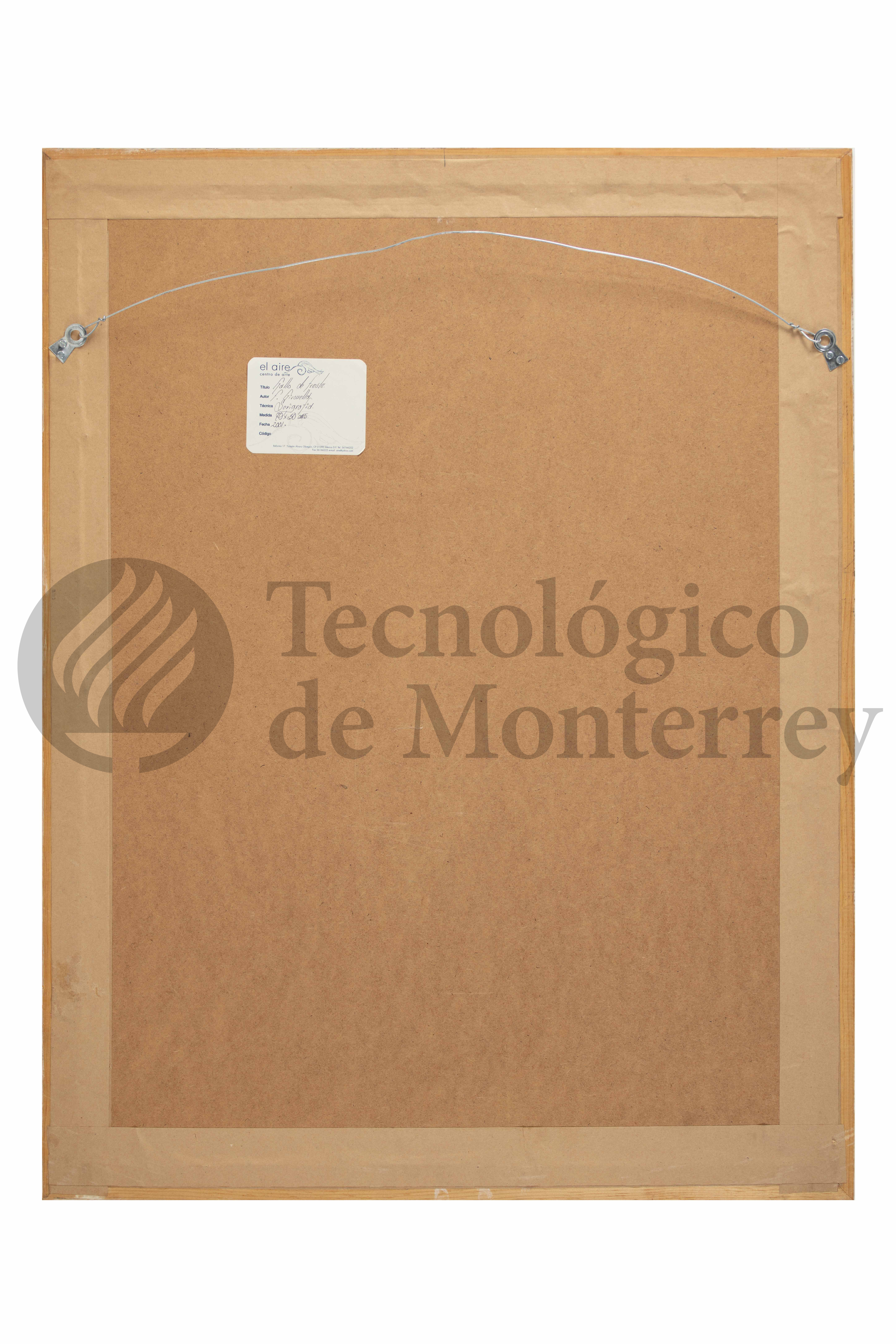 Obra gráfica de serigrafía a 4 tintas en cuya composición central se aprecian dos gallos peleando en tonos azules y rojizos sobre un fondo amarillo