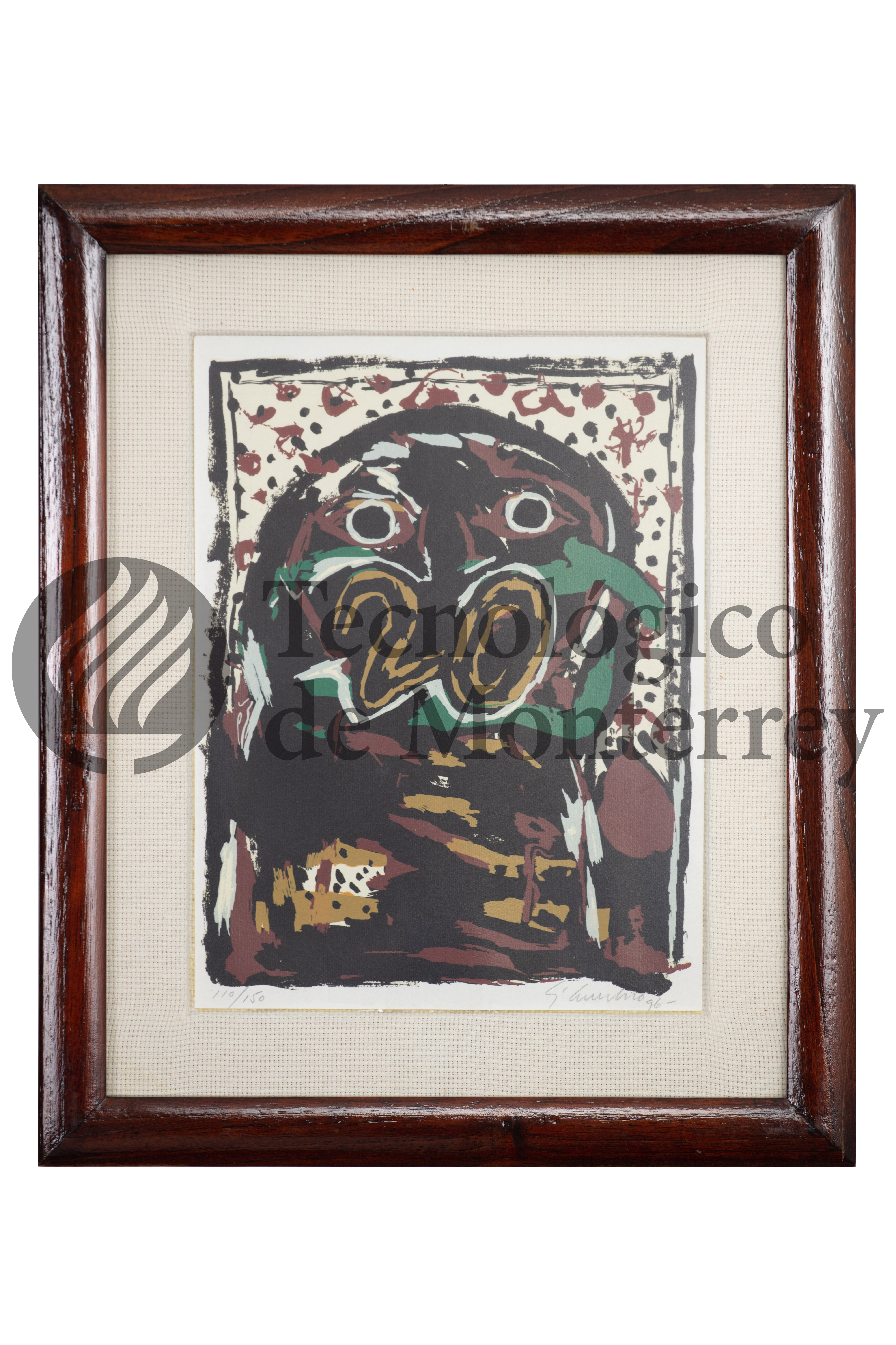 Obra gráfica de serigrafía a 6 tintas sobre papel cuya composición central de una aparente cabeza contiene un par de ojos y un número veinte