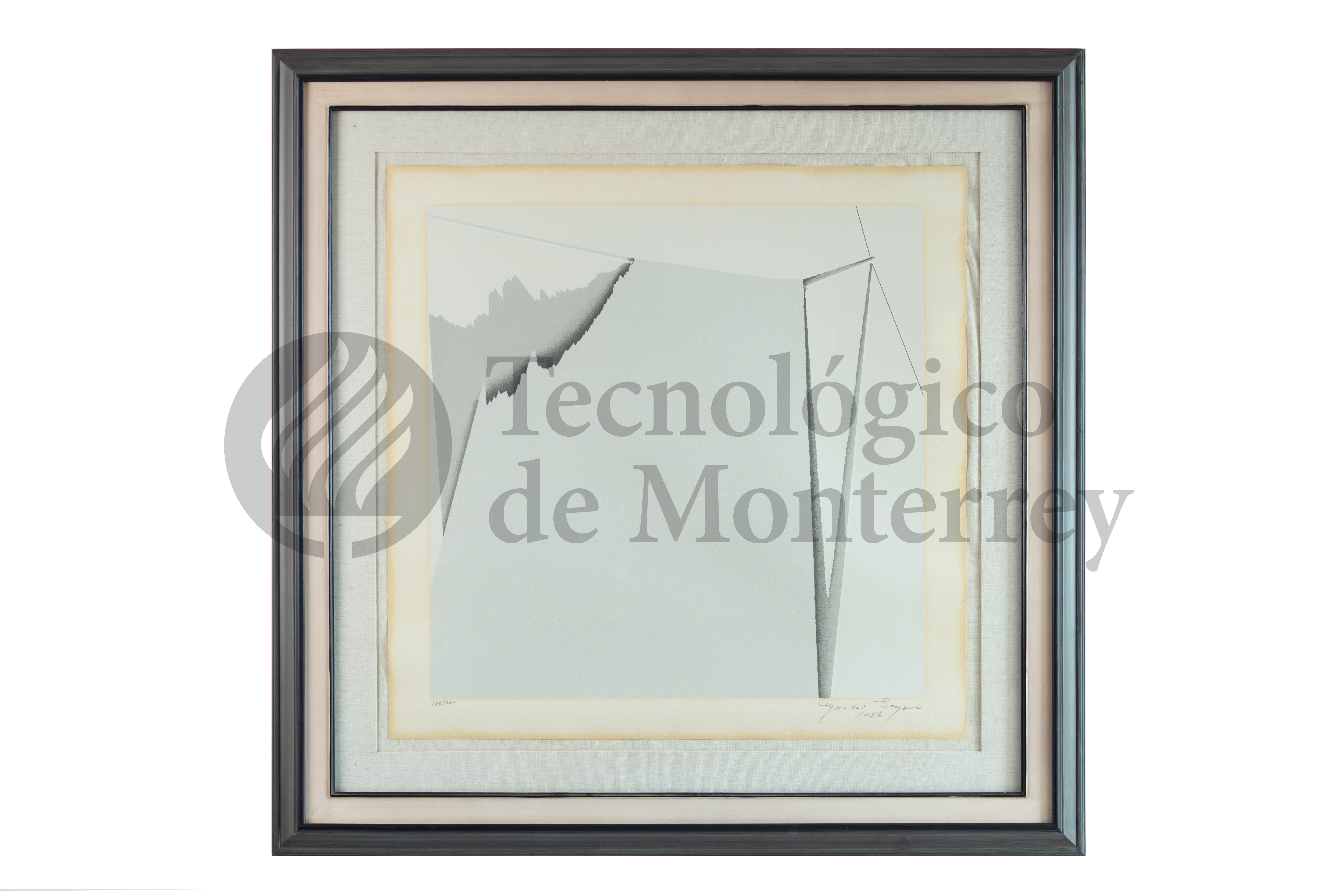 Obra gráfica en serigrafía a 3 tintas sobre papel de composición abstracta en grises claros en varias diagonales que forman triángulos