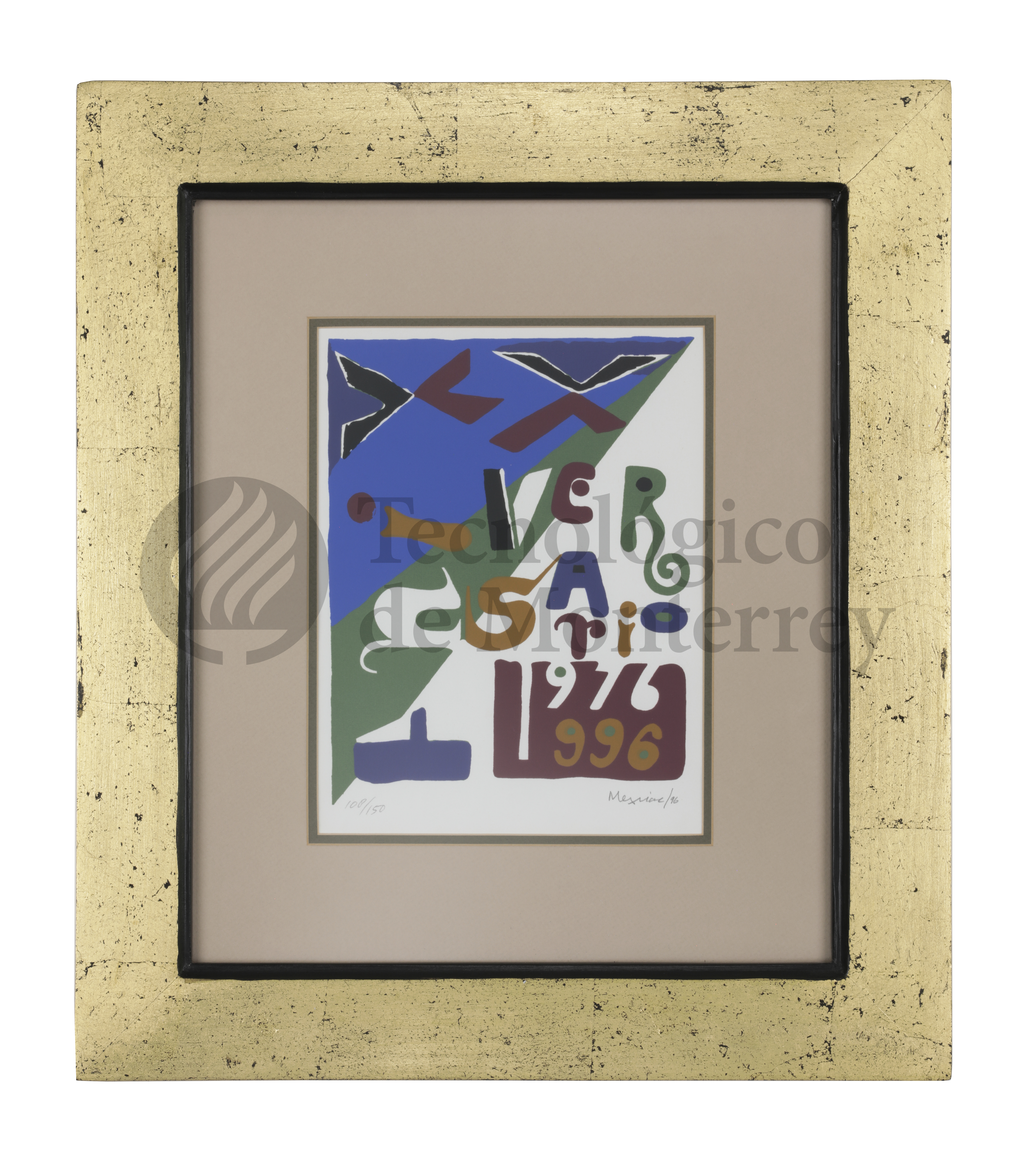 Serigrafía a color de Adolfo Mexiac, que forma parte de la carpeta de grabados realizados para conmemorar el vigésimo aniversario del Campus Estado de México. La imagen en papel presenta una composición vibrante y colorida que utiliza formas geométricas y tipografía abstracta para transmitir un mensaje conmemorativo. Los colores predominantes, como el azul, verde y morado, se entrelazan con números y letras que celebran el aniversario, destacando el "XX" y las fechas "1976" y "1996". La disposición de los elementos, con letras y cifras de diferentes tamaños y colores, crea una sensación de dinamismo.