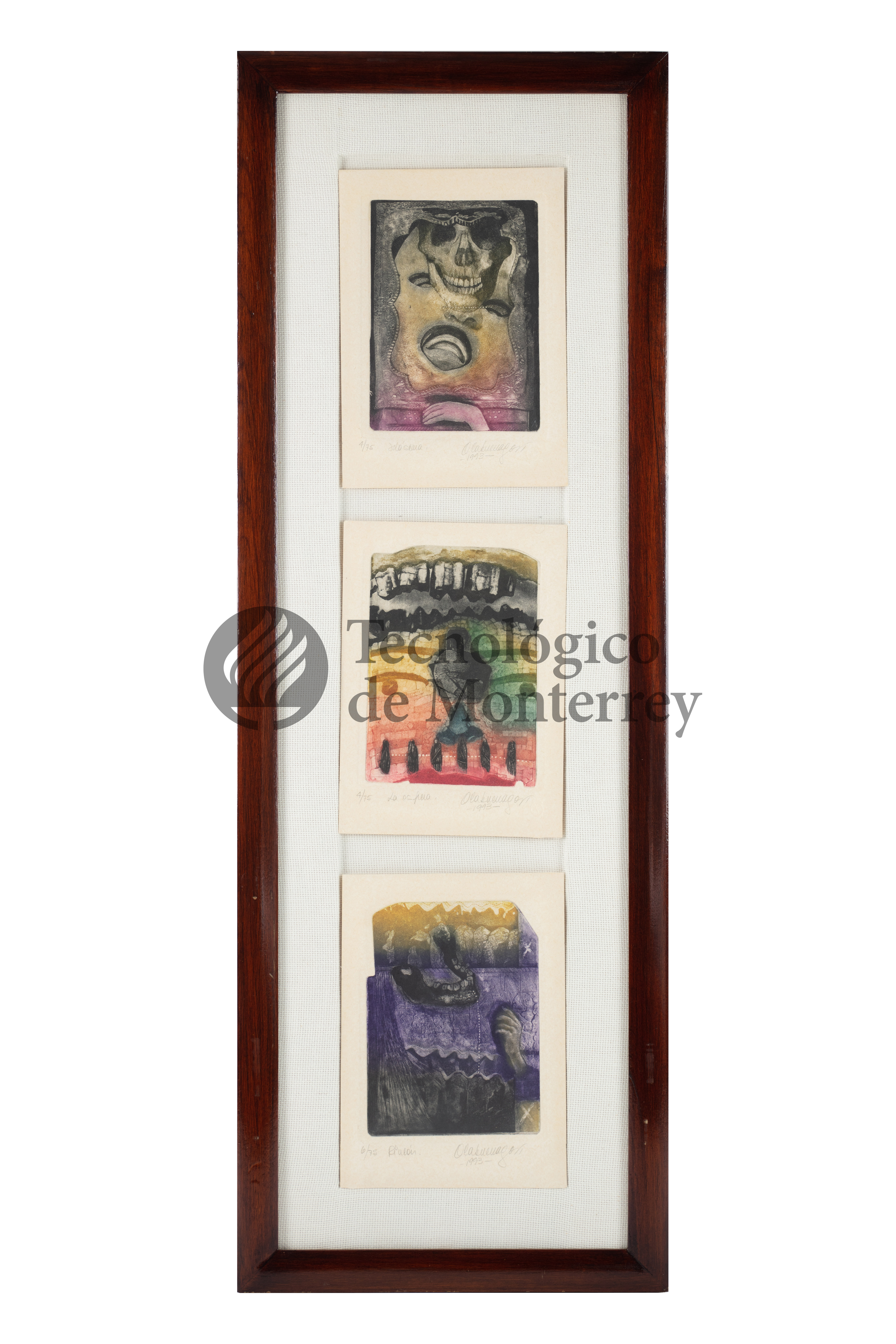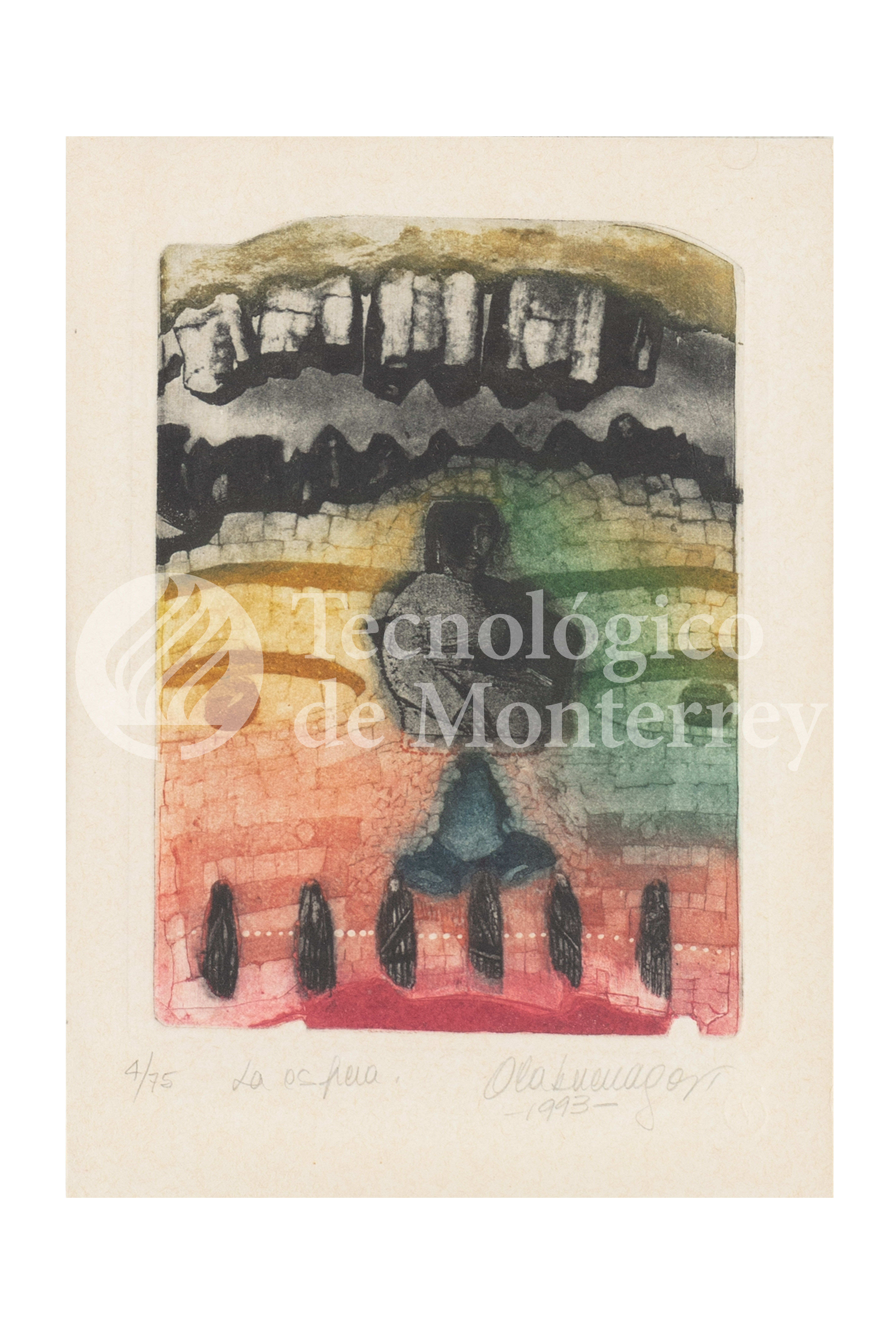 Impresión surrealista a color a partir de placa metálica que representa unas figuras prehispánicas en tonos negros, rojos, verdes, amarillos y azules
