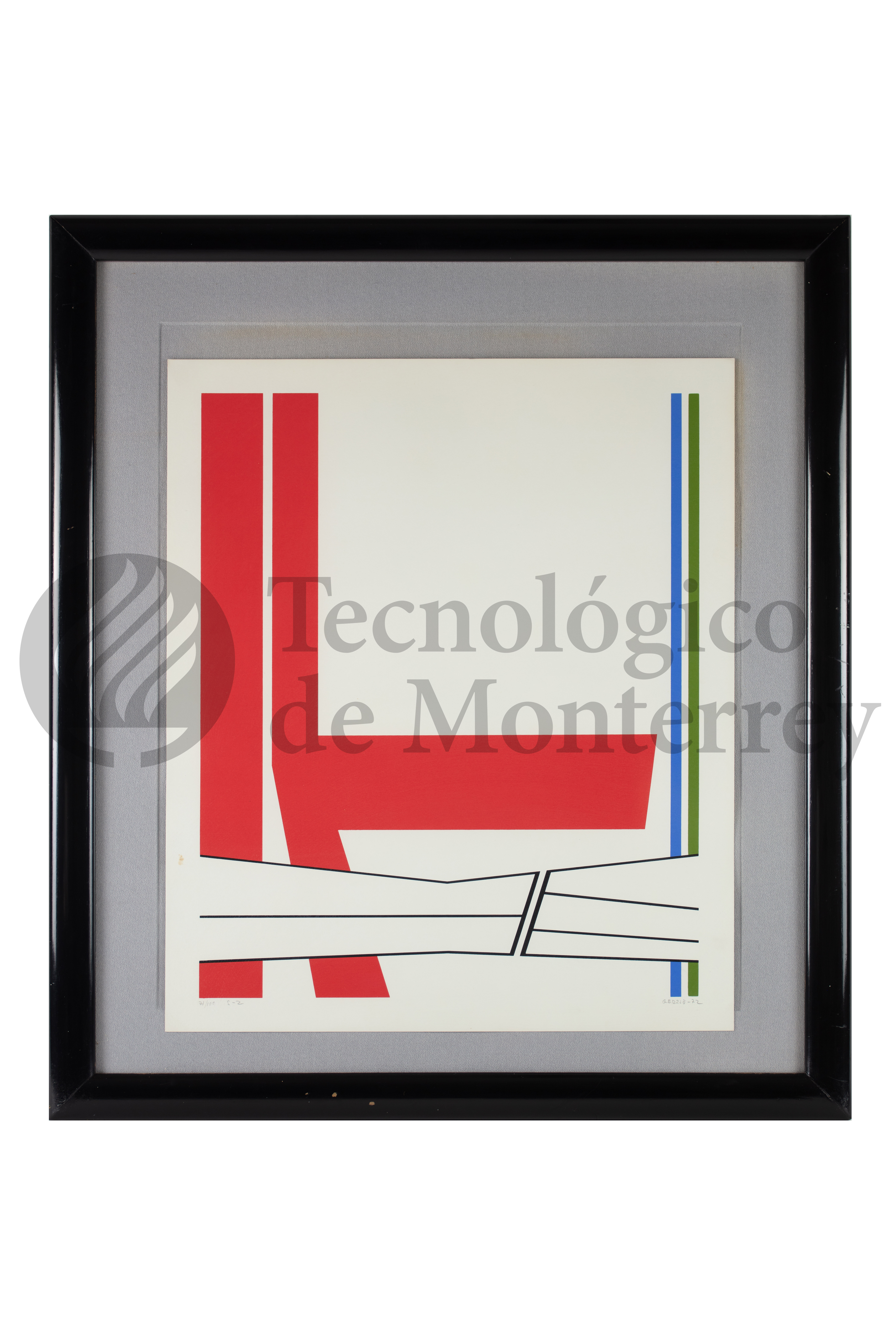 Obra gráfica de serigrafía abstracta a color sobre papel en cuya composición central se aprecian líneas en color rojo y negro, así como otras líneas paralelas en color azul y verde sobre un fondo blanco