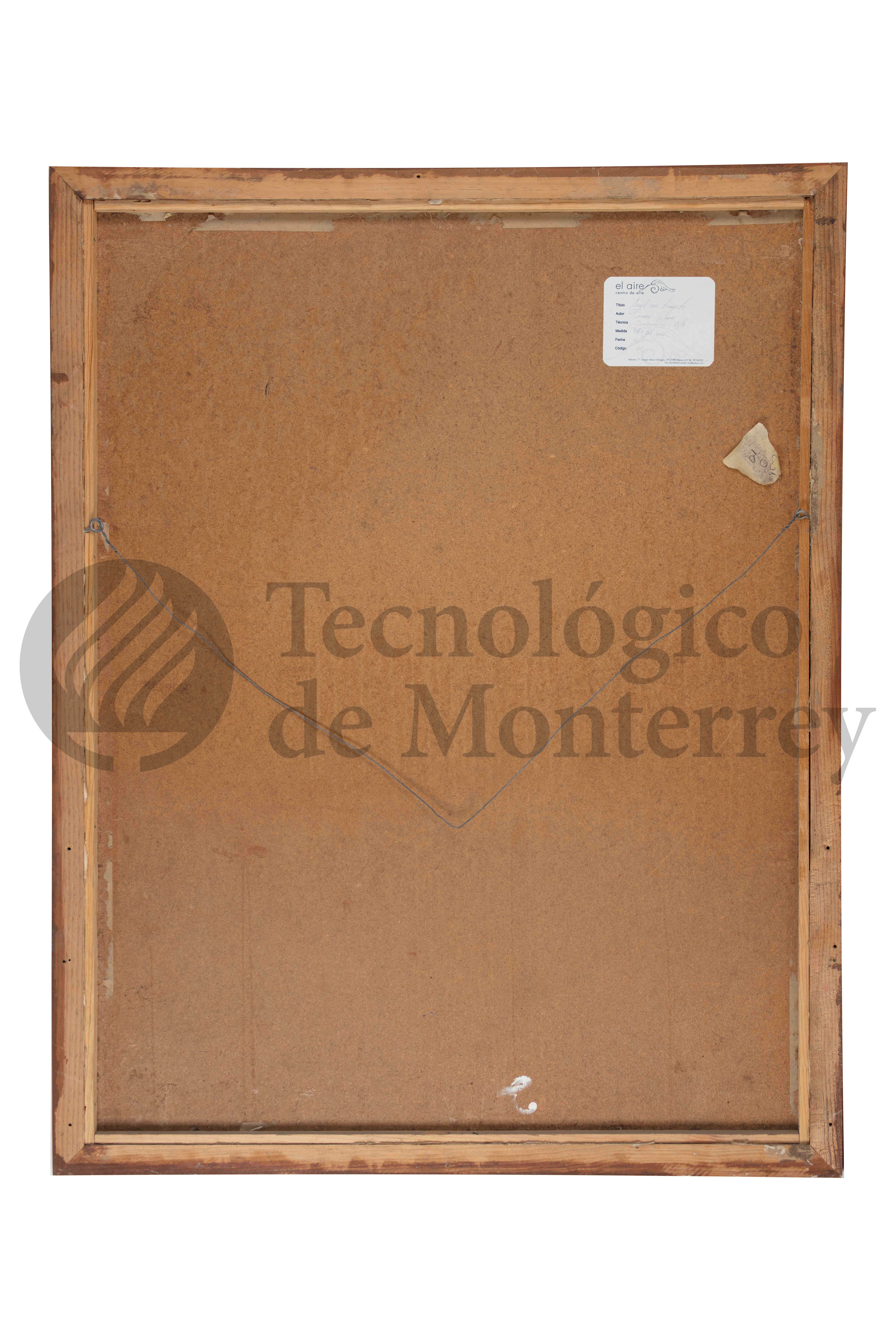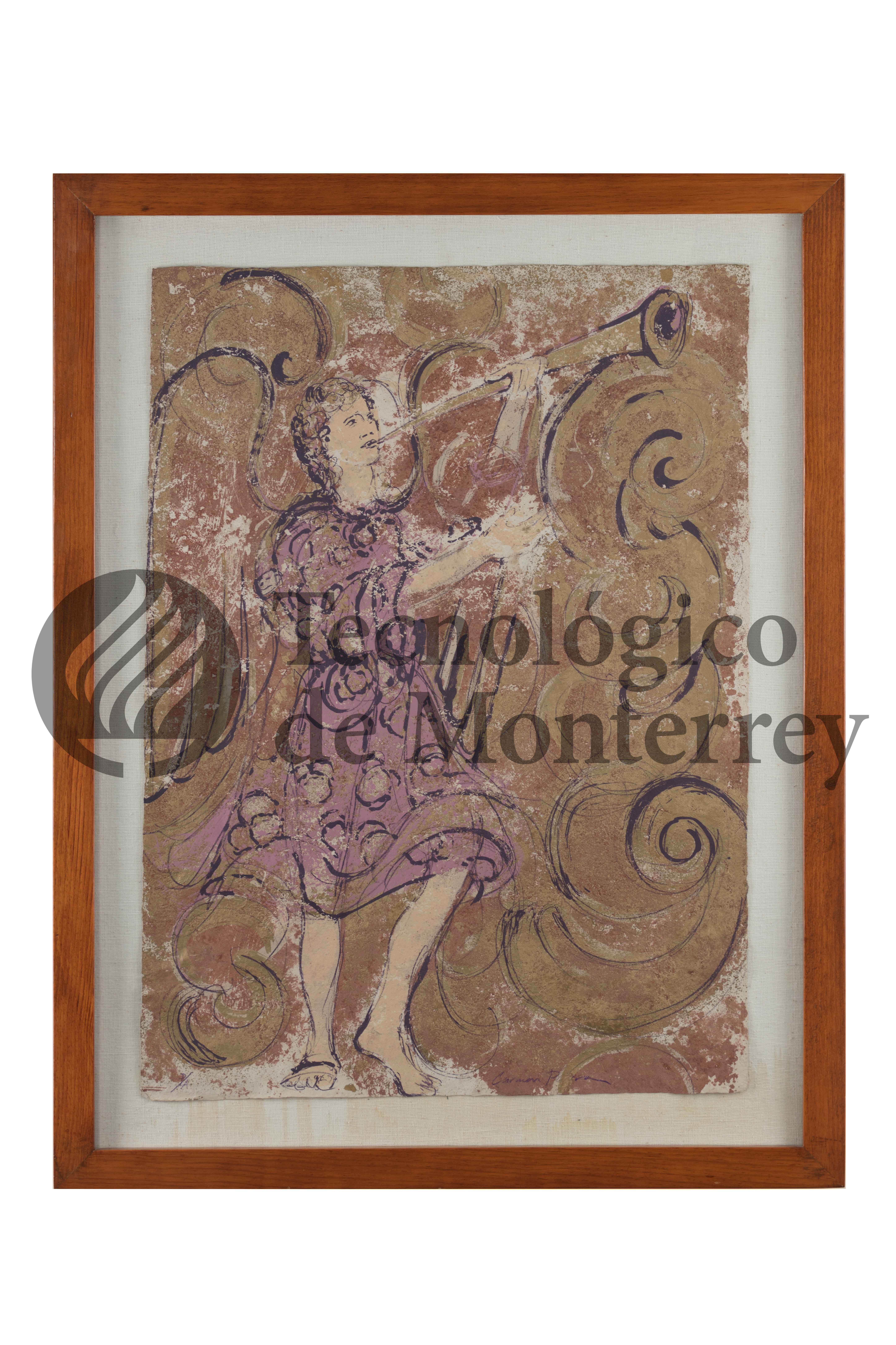 Obra gráfica de serigrafía sacra en técnica mixta sobre papel en cuya composición central se aprecia un ángel tocando una trompeta. A su alrededor hay volutas en tonos dorados, cobres y lilas