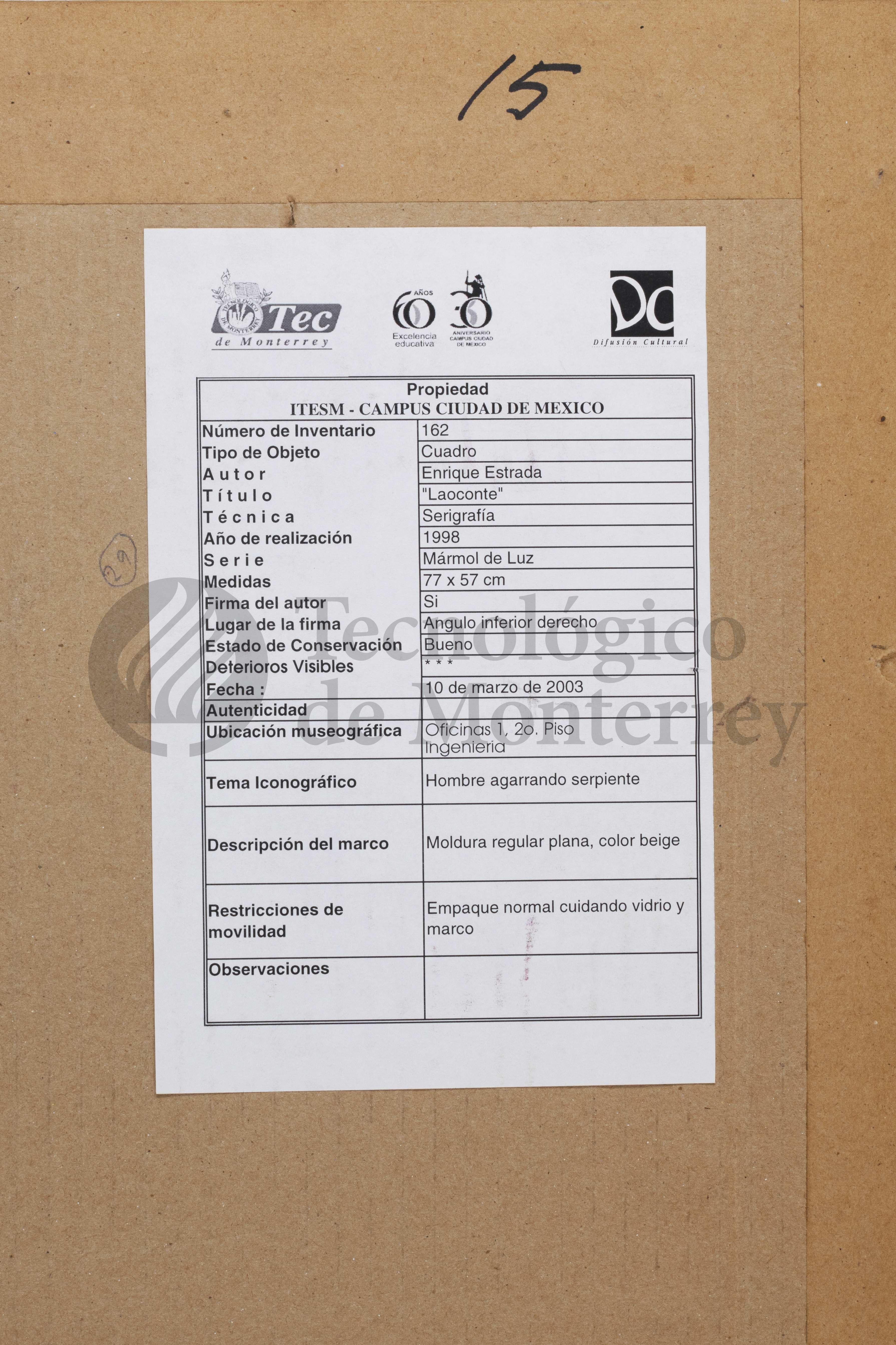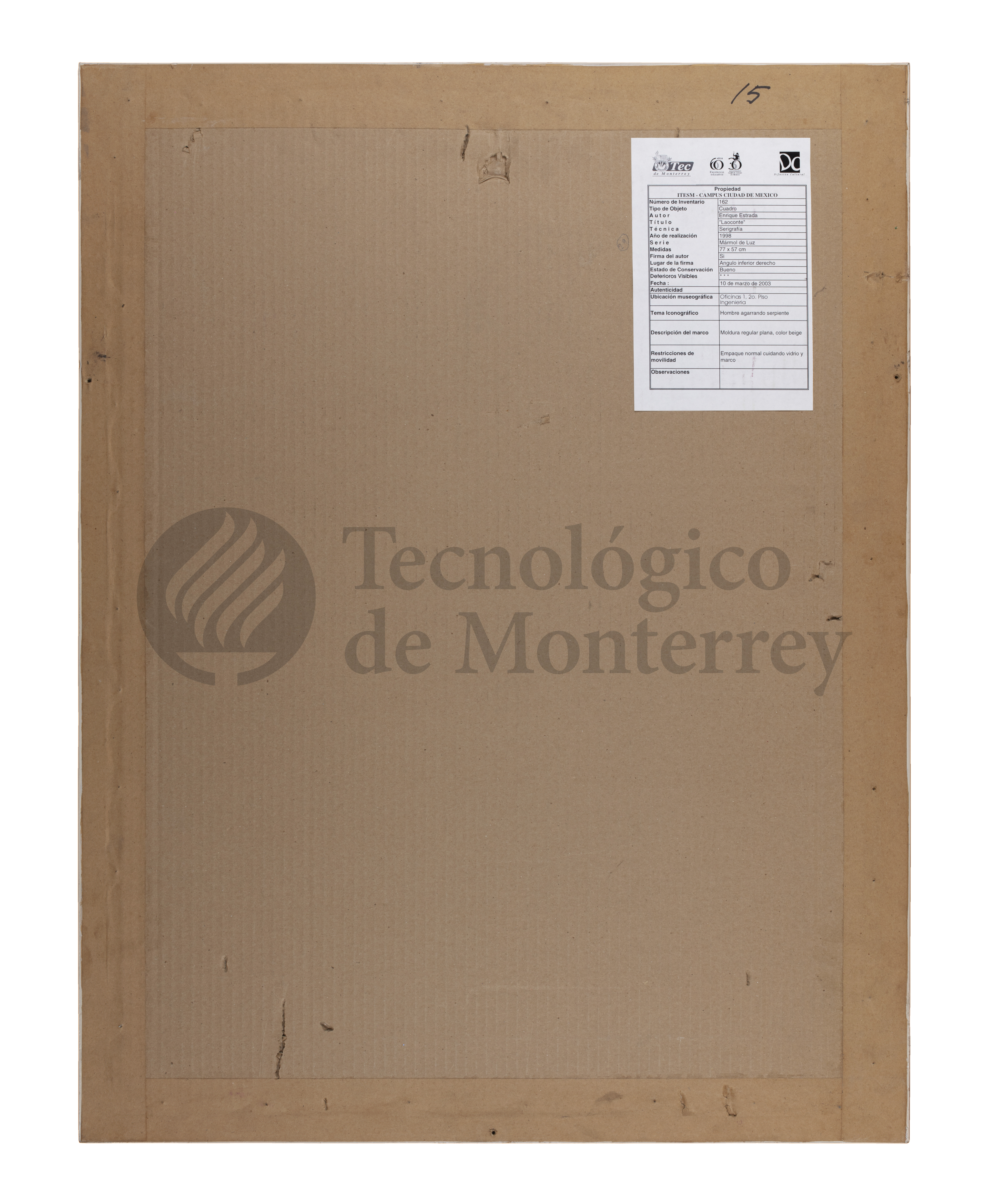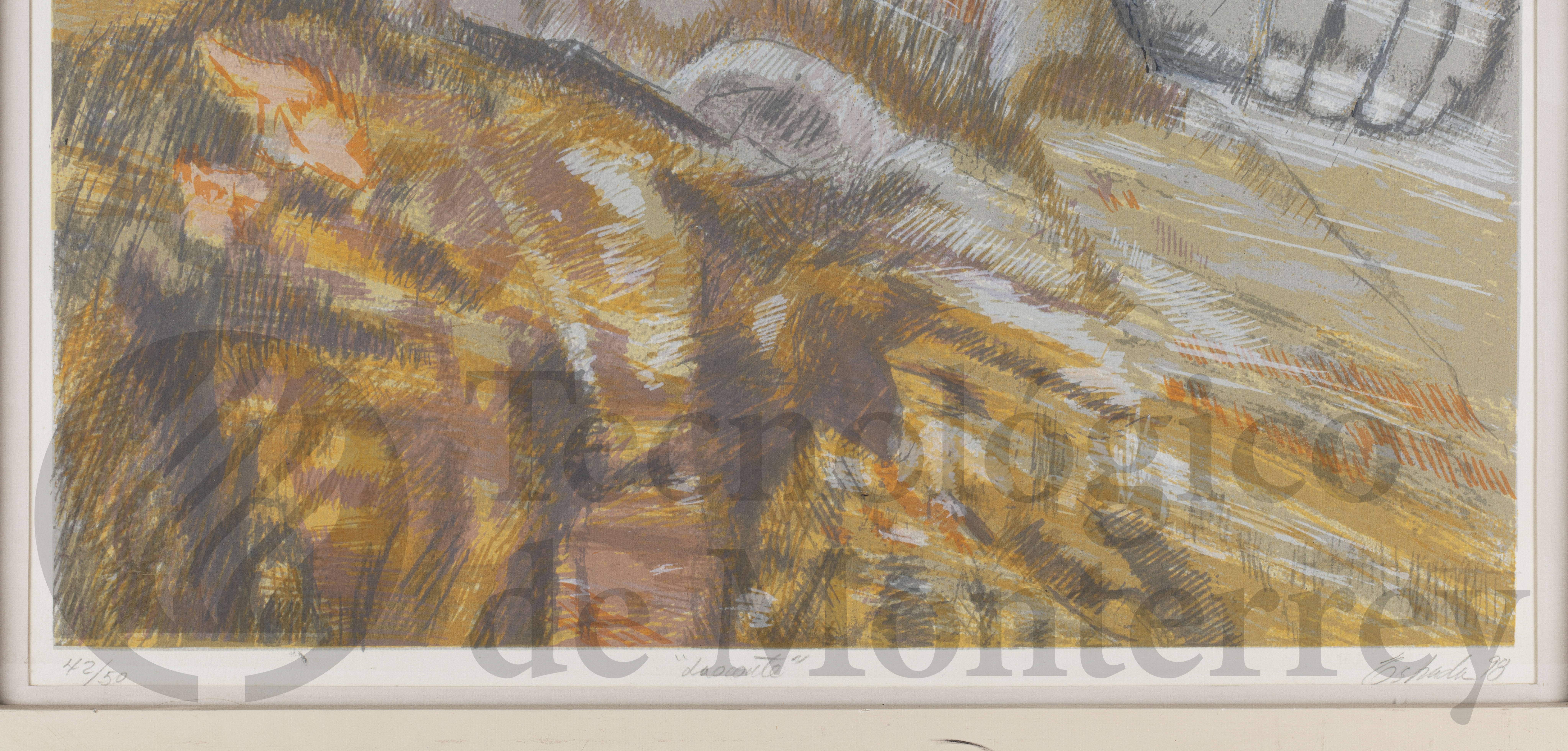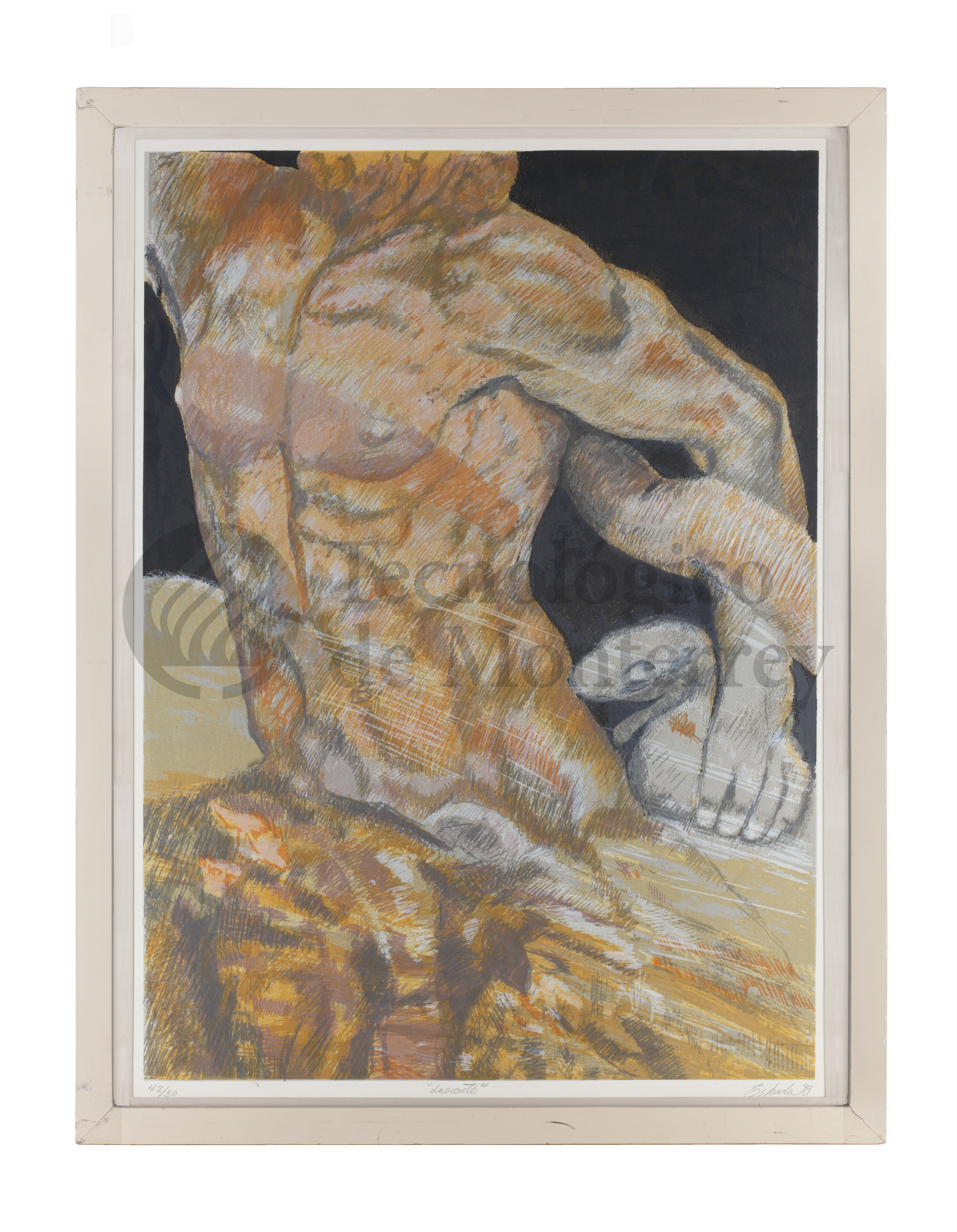 "Laocoonte" de Enrique Estrada es una xilografía que representa al mítico sacerdote troyano del Dios Apolo Laocoonte, conocido por su trágico destino al advertir a los troyanos sobre el caballo de Troya. La obra muestra una interpretación del cuerpo humano, enfocado en los detalles anatómicos del torso y los brazos musculosos, que transmiten tensión. El uso de colores terrosos y cálidos, con tonos naranjas y marrones, acentúa la textura de la piel y los músculos, lo que añade una sensación de realismo. Los trazos sueltos, junto con los contrastes de luz y sombra, crean una sensación de movimiento.