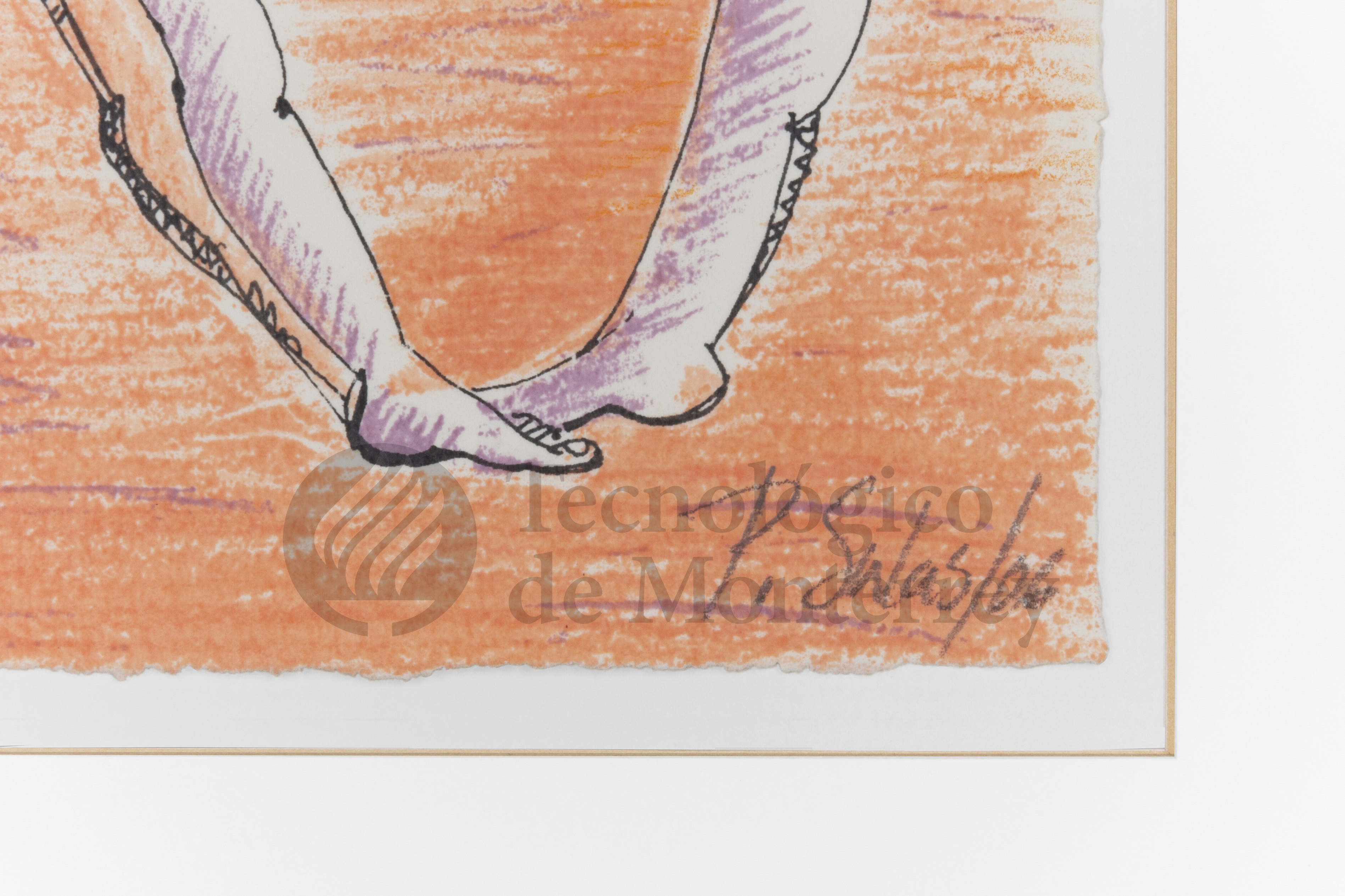 La serigrafía a color de Patricia Torres, que forma parte de "Carpeta 30 aniversario CEM, 2006", es una composición dinámica de figuras humanas estilizadas en movimiento. Las figuras, delineadas con trazos ligeros y expresivos, forman una estructura que recuerda a una coreografía o una danza, con cuerpos que se alargan y se entrelazan creando una forma abstracta. El fondo en tonos naranjas añade un contraste cálido, resaltando las figuras que parecen flotar o girar en el espacio. En la obras Salas por explorar el cuerpo humano y su capacidad expresiva a través de gestos estilizados y composiciones dinámicas. Obra numerada 100/150.