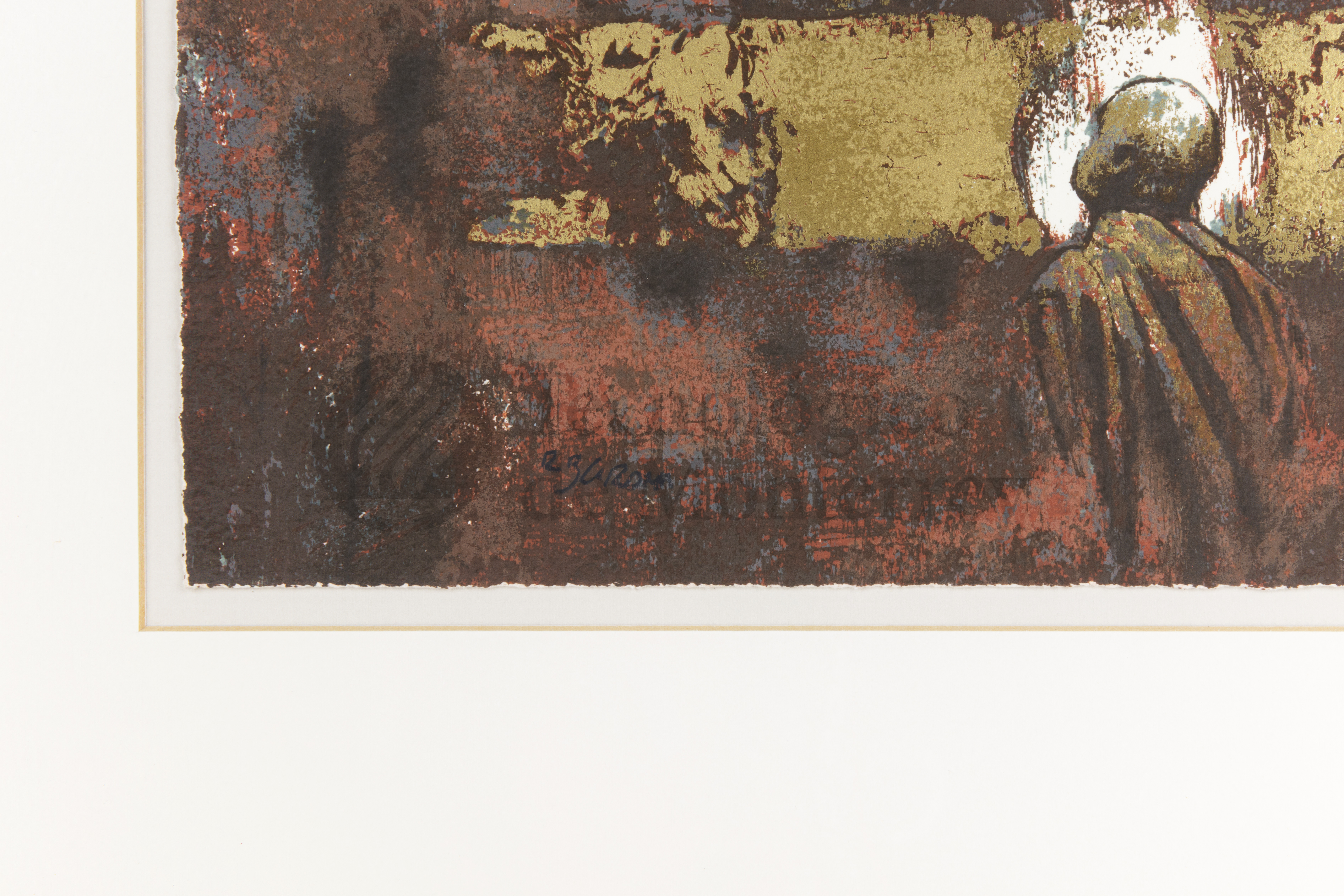La serigrafía de Roberto Corona, que forma parte de "Carpeta 30 aniversario CEM, 2006", muestra cuatro figuras humanas con auras luminosas alrededor de sus cabezas. Las figuras están dispuestas en dos grupos, uno en la parte superior y otro en la inferior, sobre un fondo oscuro que combina tonos marrones, ocres y dorados, creando una textura rica y desgastada que sugiere antigüedad o deterioro. Los halos brillantes destacan de manera dramática contra el fondo terroso, añadiendo un contraste de luz y oscuridad que refuerza la naturaleza contemplativa de la obra. Esta pieza, numerada como parte de una serie limitada 100/150.