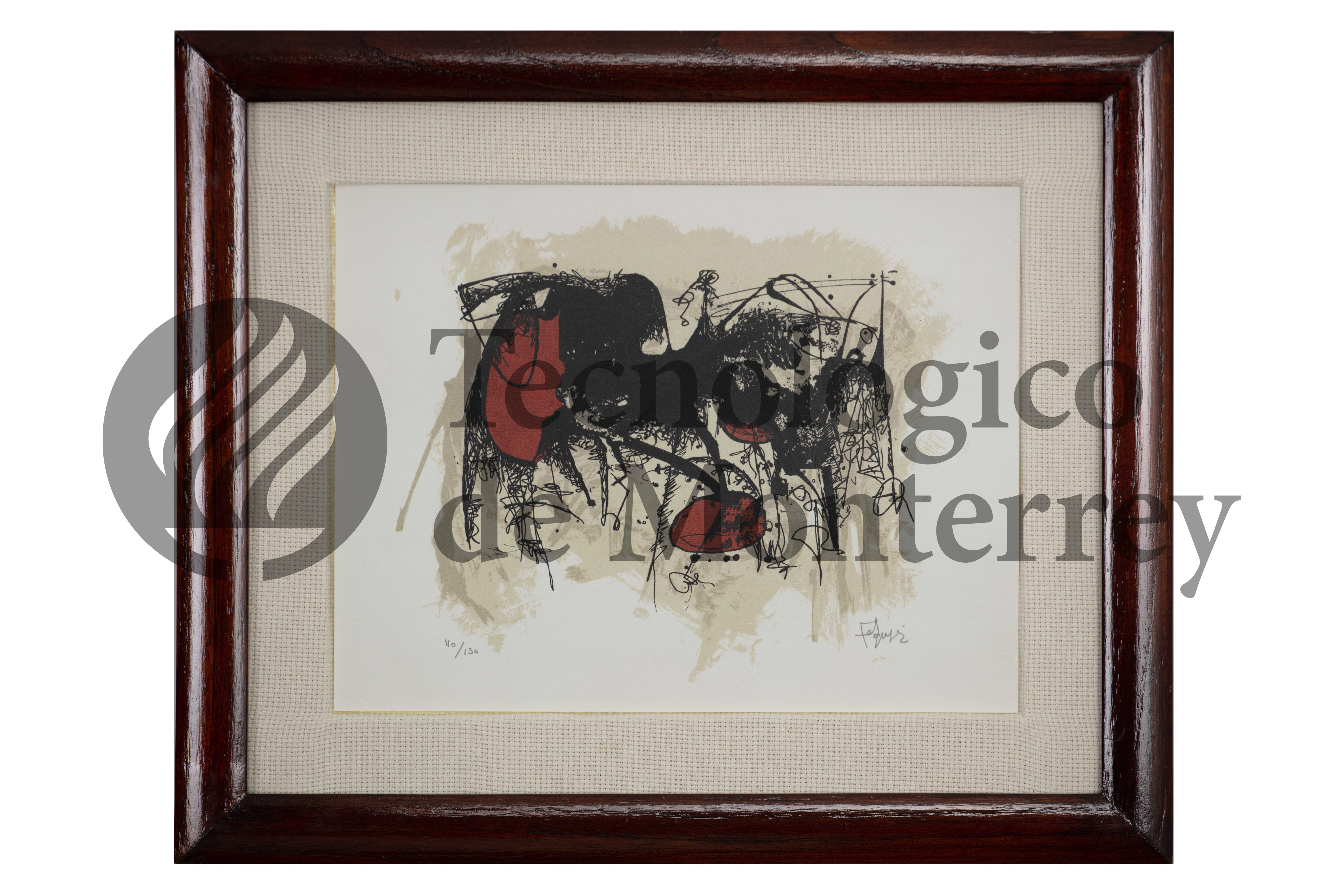 Obra gráfica de serigrafía abstracta a 3 tintas con líneas serpenteadas en tonos negro, rojo