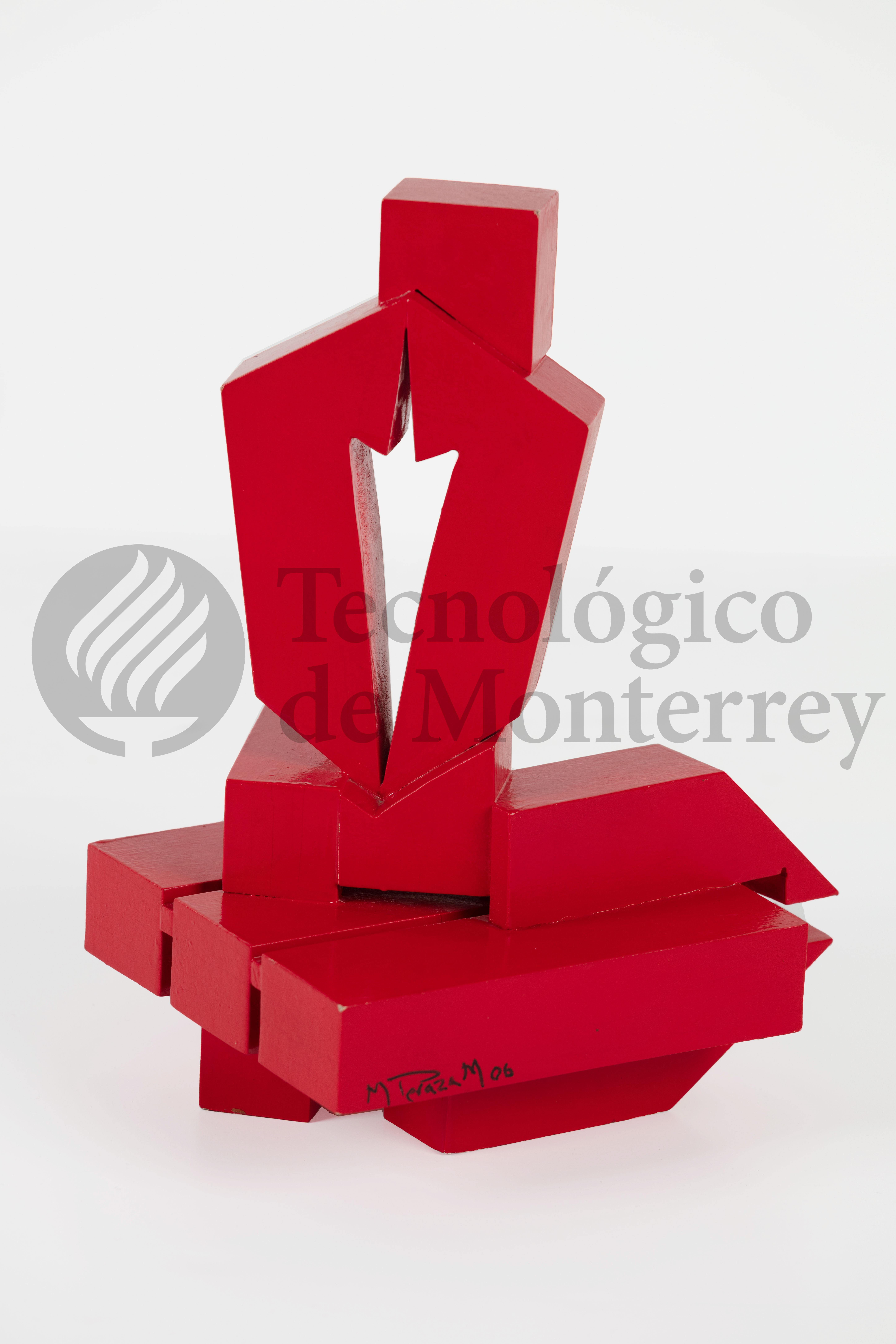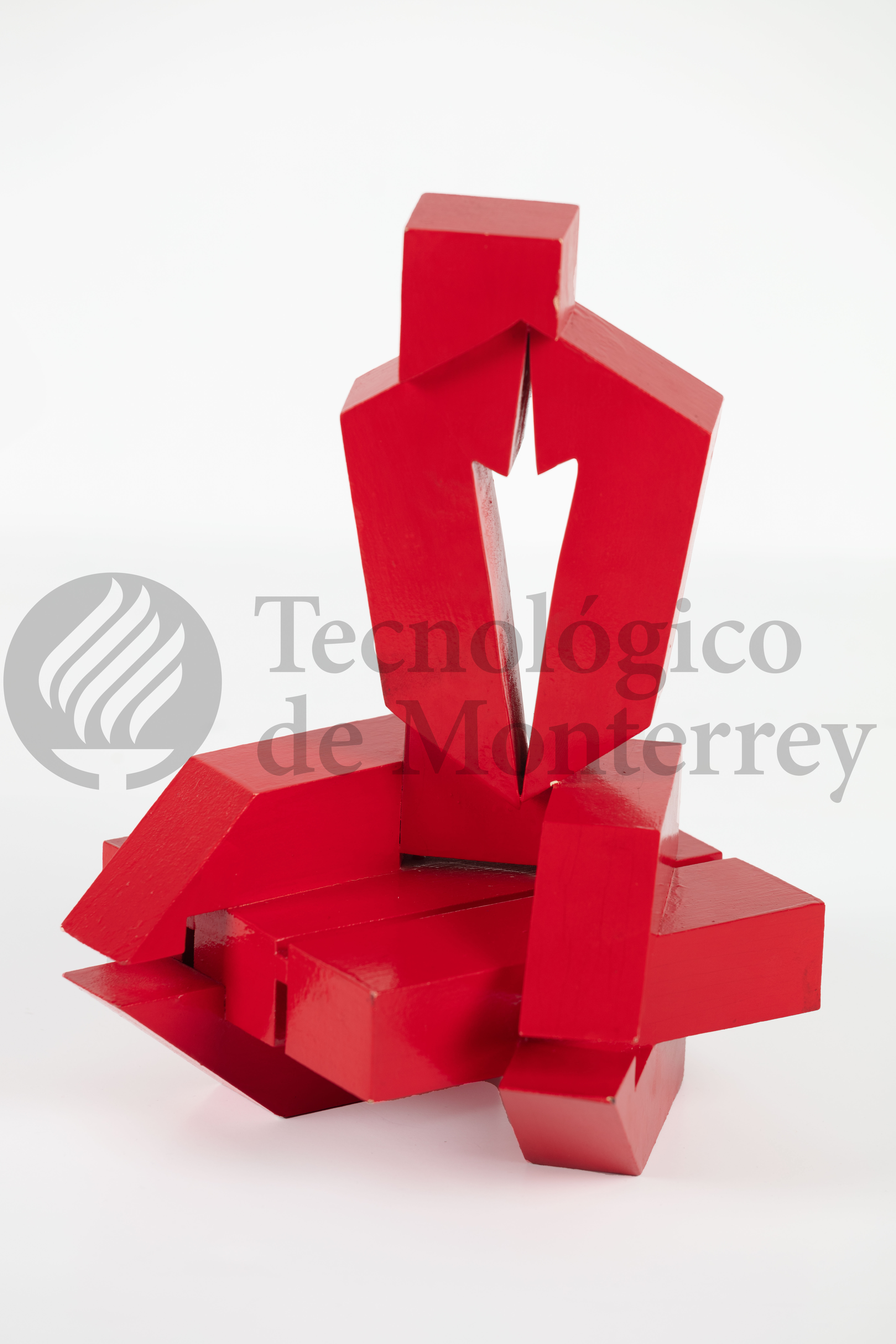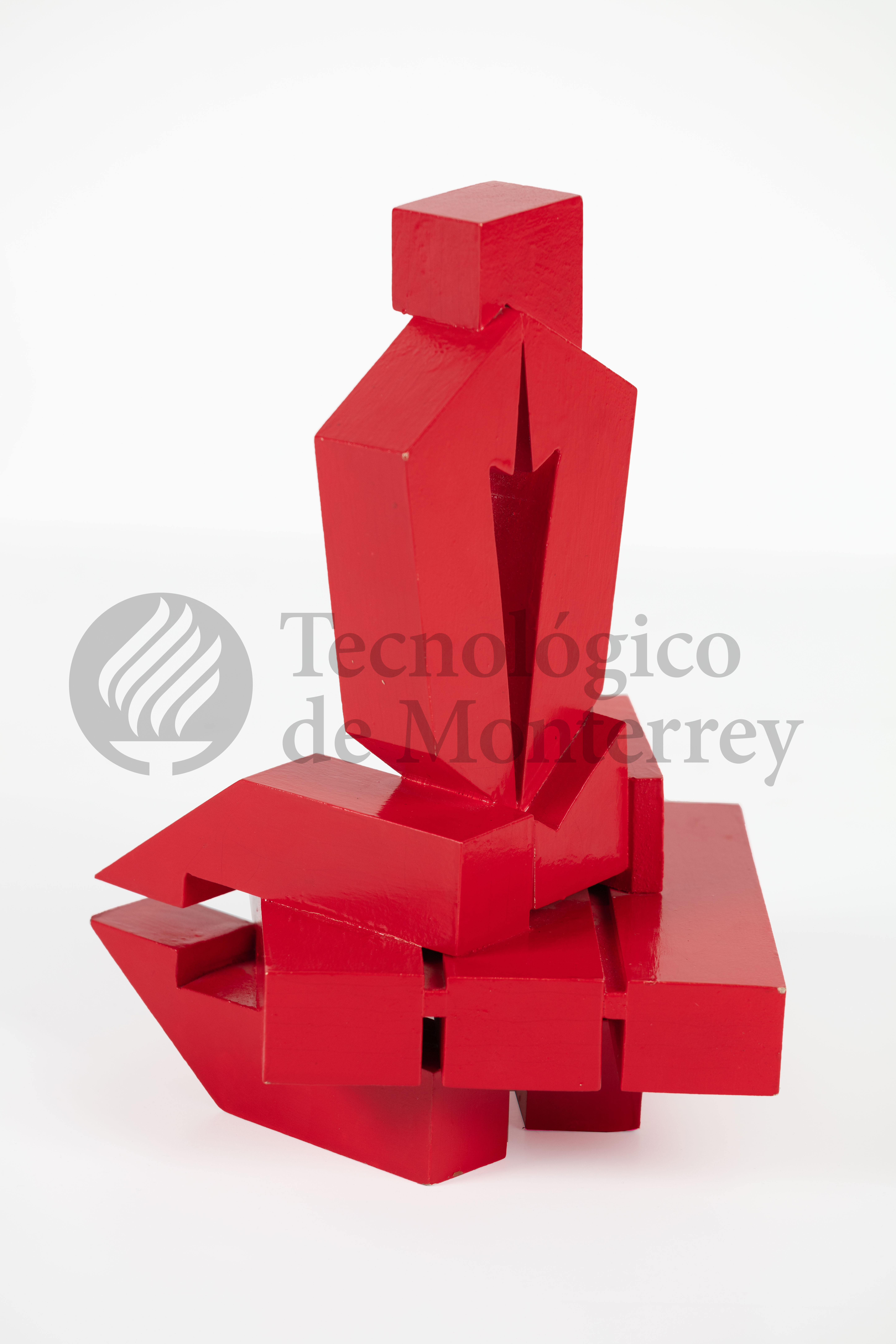Boceto tridimensional en madera policromada con base de preparación blanca y pintura automotiva roja construida por ocho bloques volumétricos, cinco de ellos conforman la base de la pieza y están colocados de forma horizontal y en simetría. Dos más conforman el segundo cuerpo vertical de la pieza y el remate de la obra es un cubo en la parte más alta.