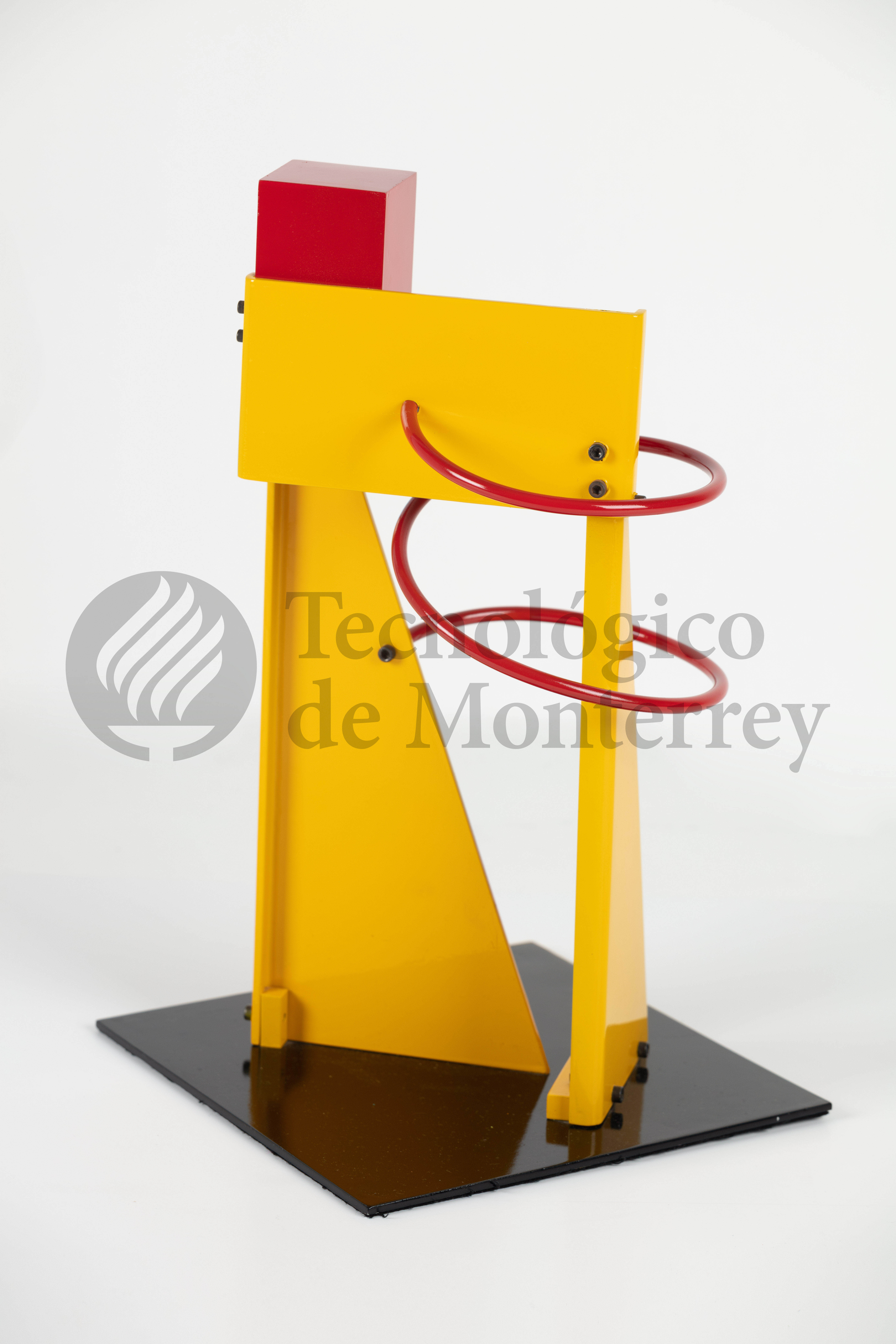 Maqueta de la escultura monumental abstracta, realizada en metal lacado en amarillo, rojo y negro. La pieza está compuesta por placas trinagulares amarillas e intersectadas en la parte superior por una forma espiral roja. La base está realizada con placas triangulares amarillas y una rectangular que sostiene un cubo rojo.